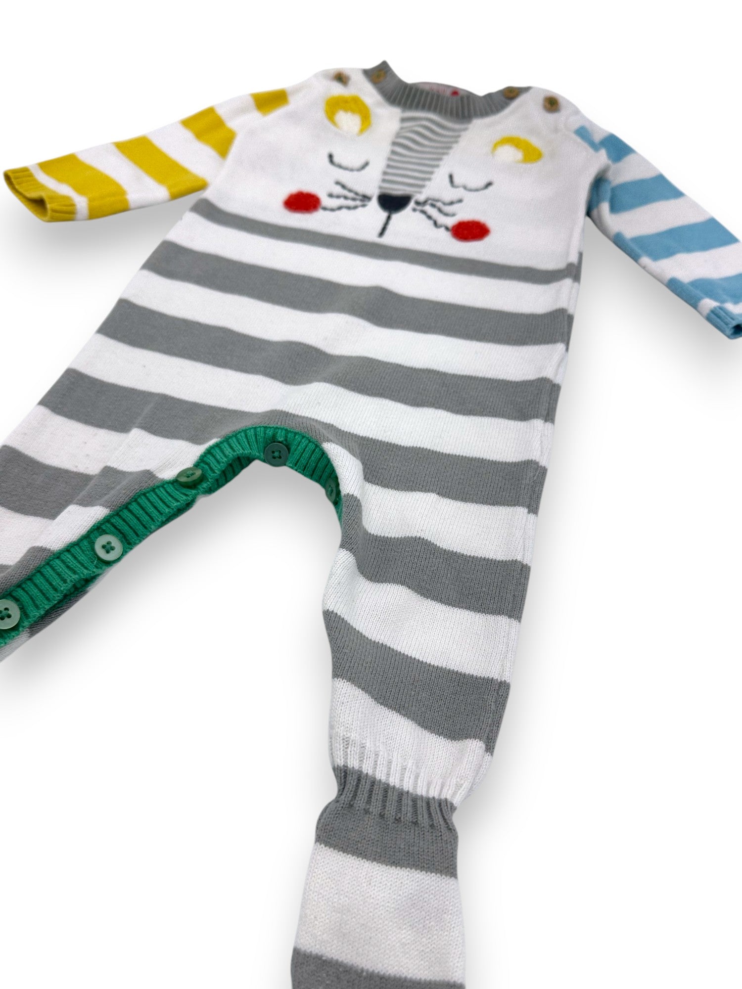 Babygrow de malha às riscas, da Boboli, com abertura entrepernas e nos ombros.