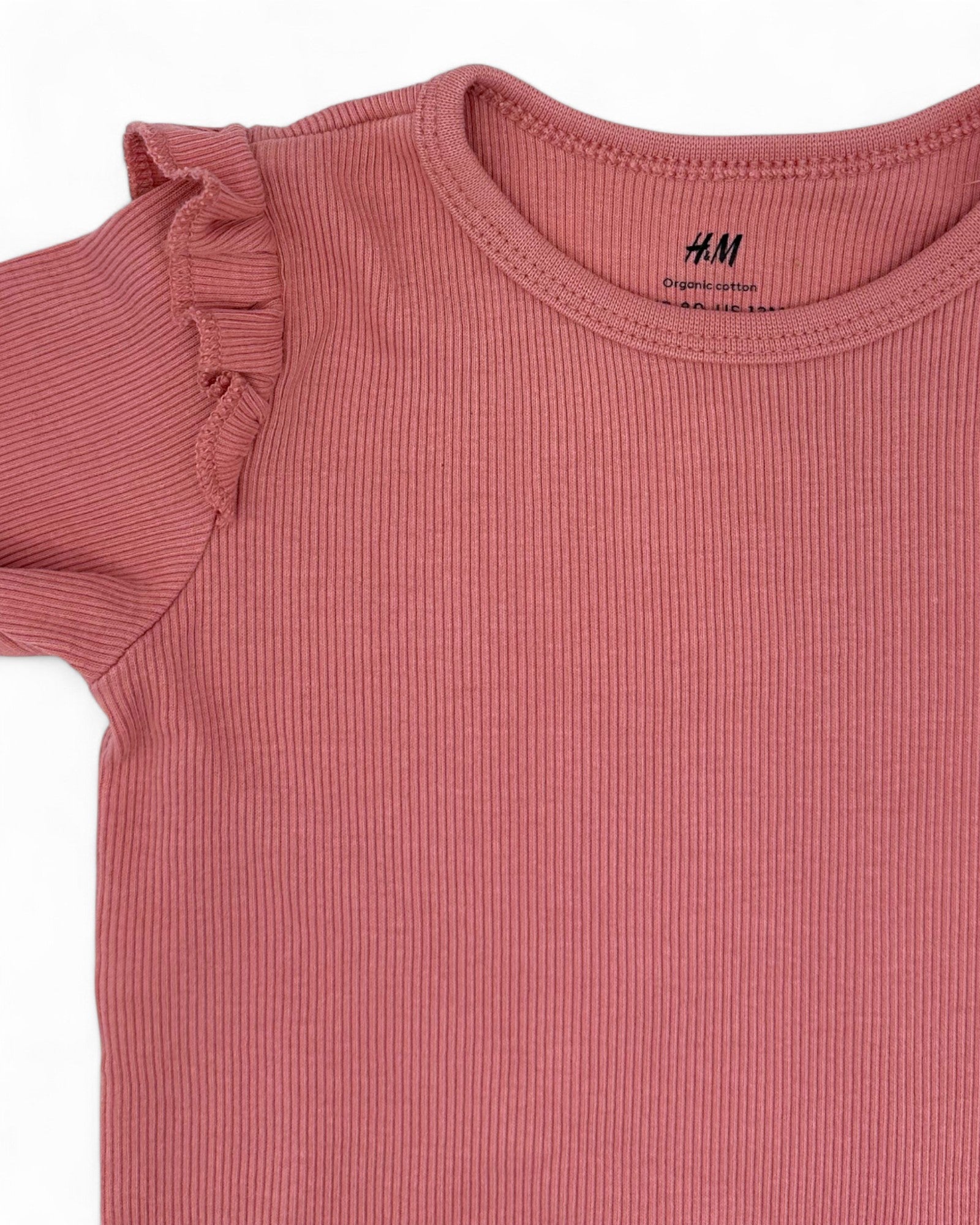 Pink ribbed short-sleeved bodysuit in organic cotton with ruffles at the shoulders, from H&M.