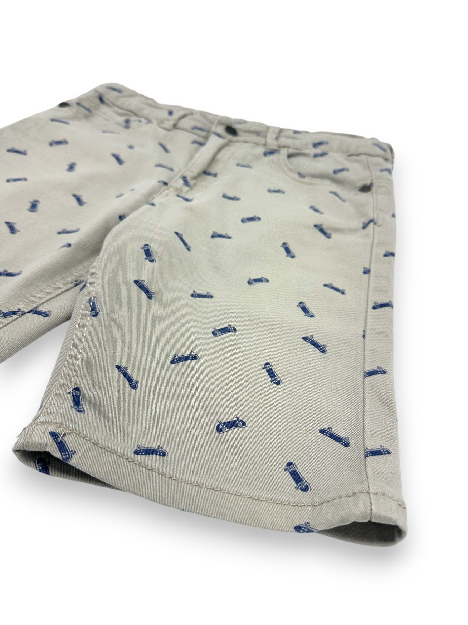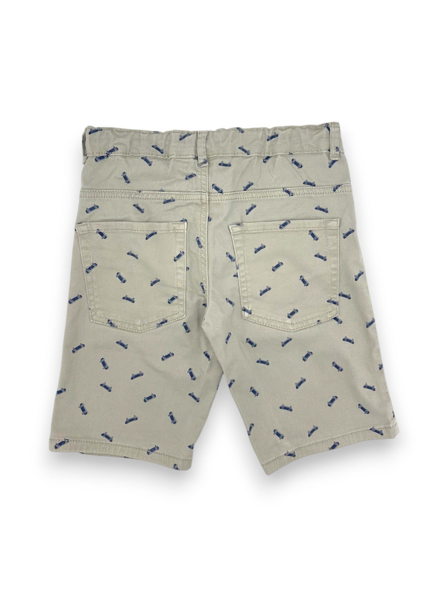 Beige denim shorts with skateboard illustrations, by MO Kids. Adjustable elastic waistband.