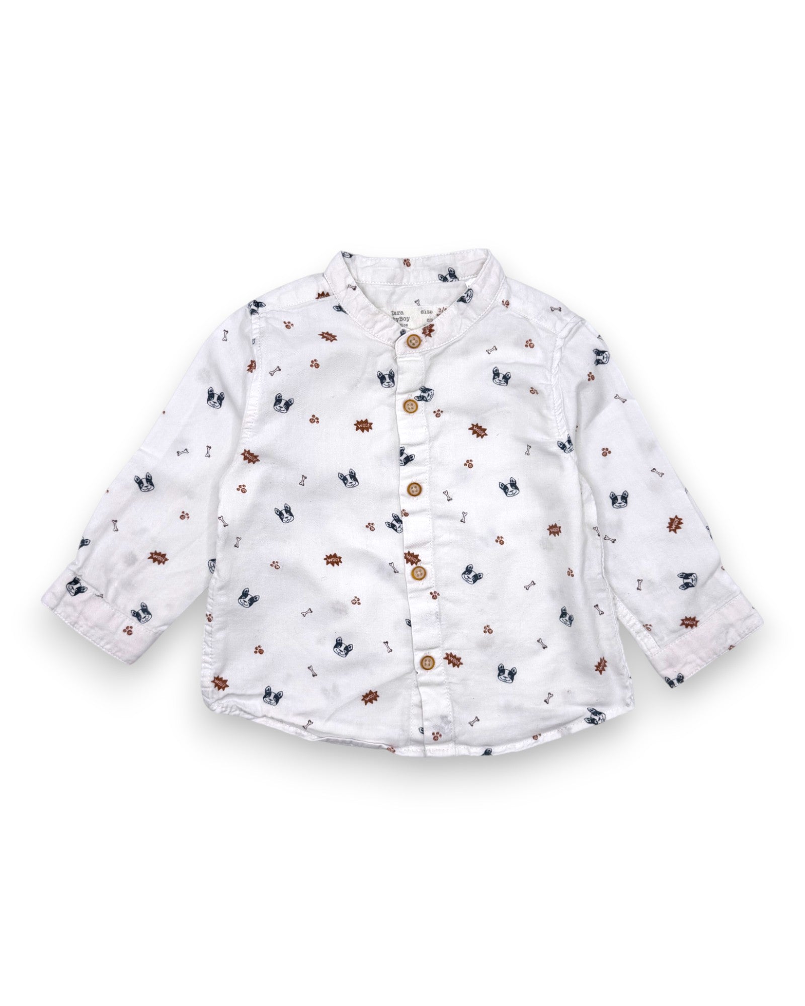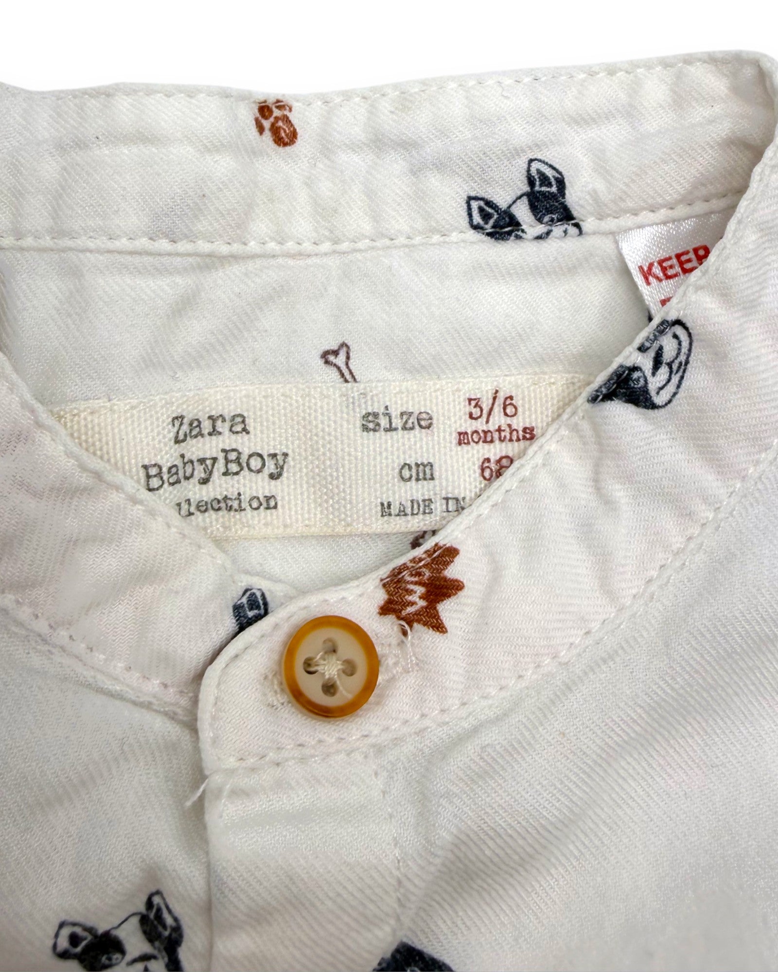 Camisa branca de mangas compridas e gola mao, da Zara, com ilustrações de cães.