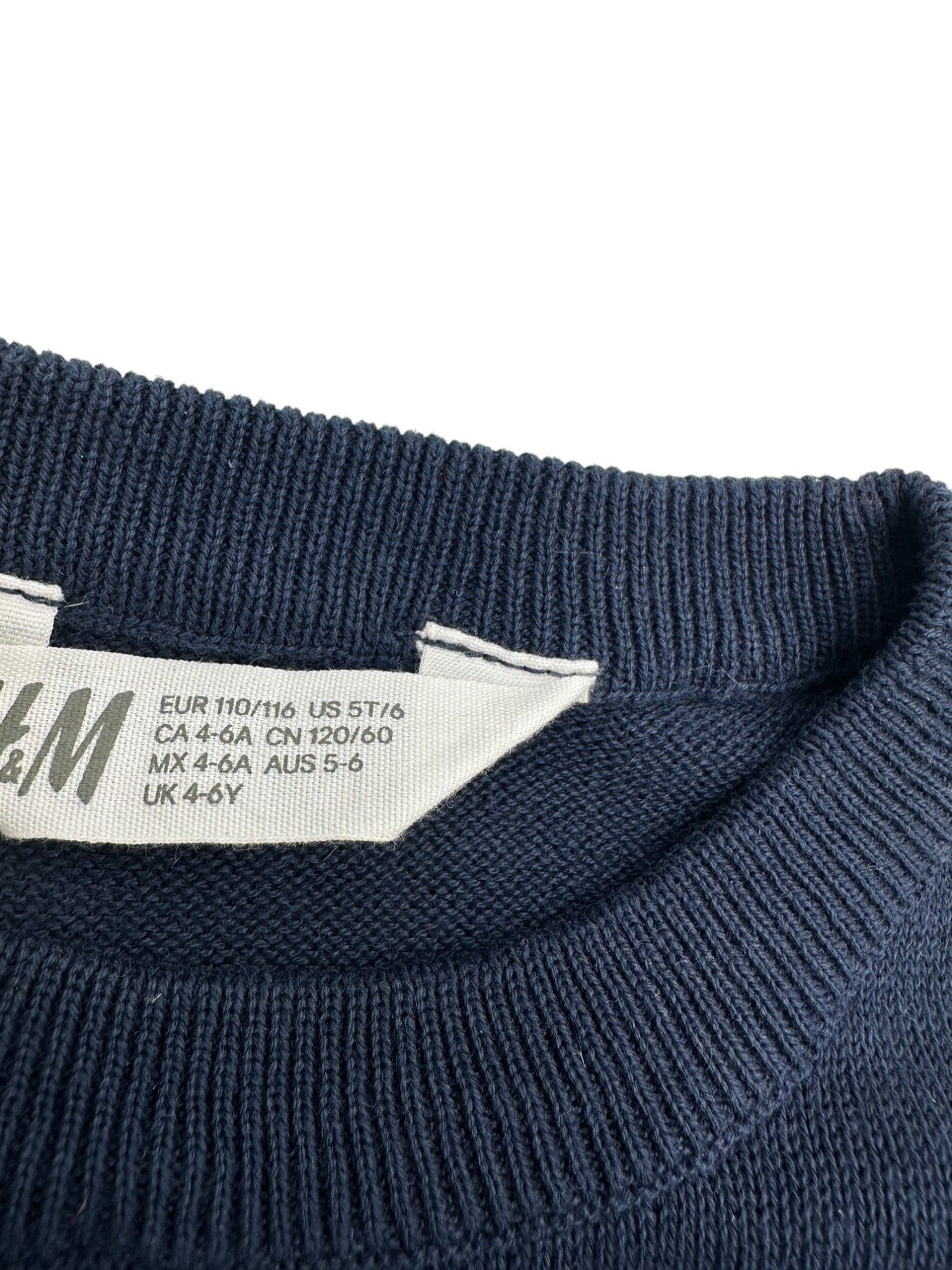 Blue knitted Christmas sweater with dinosaur illustration from H&M.