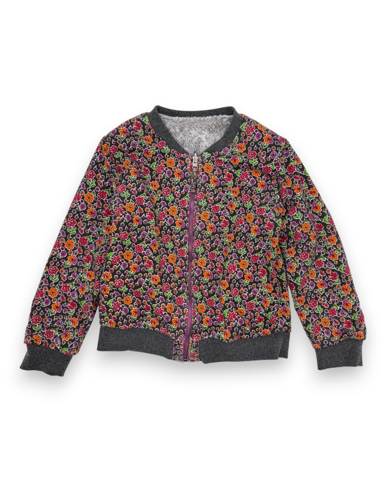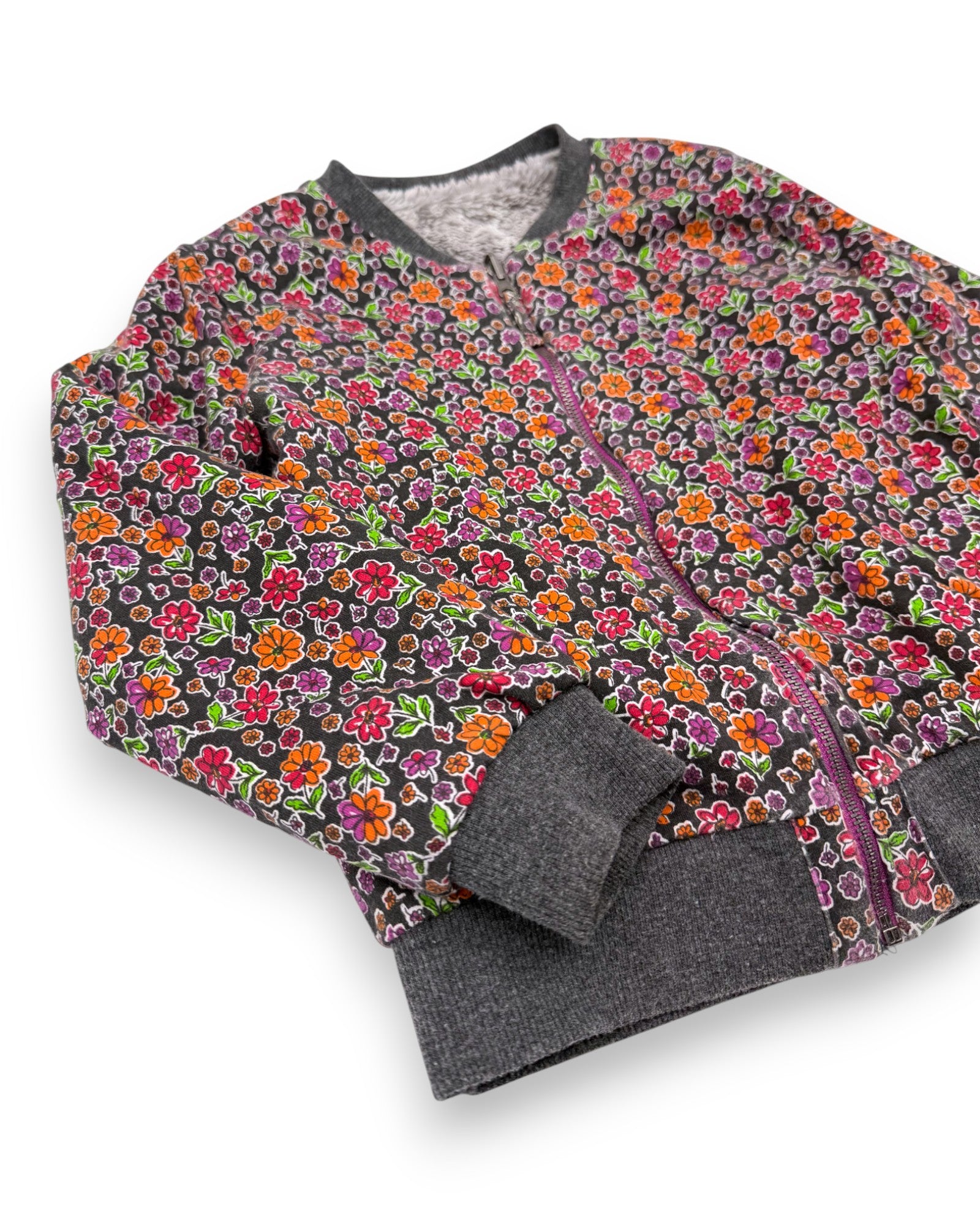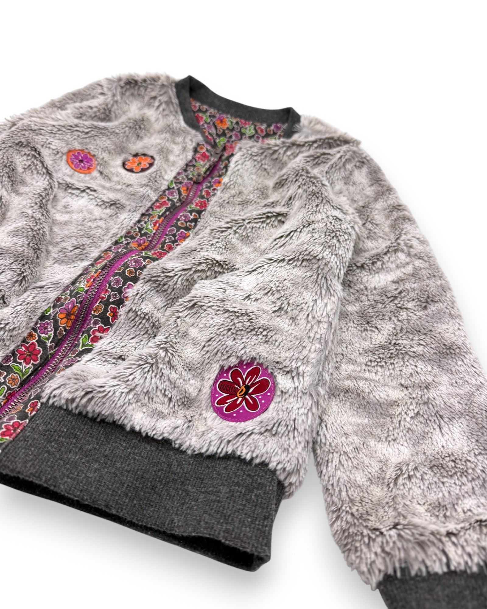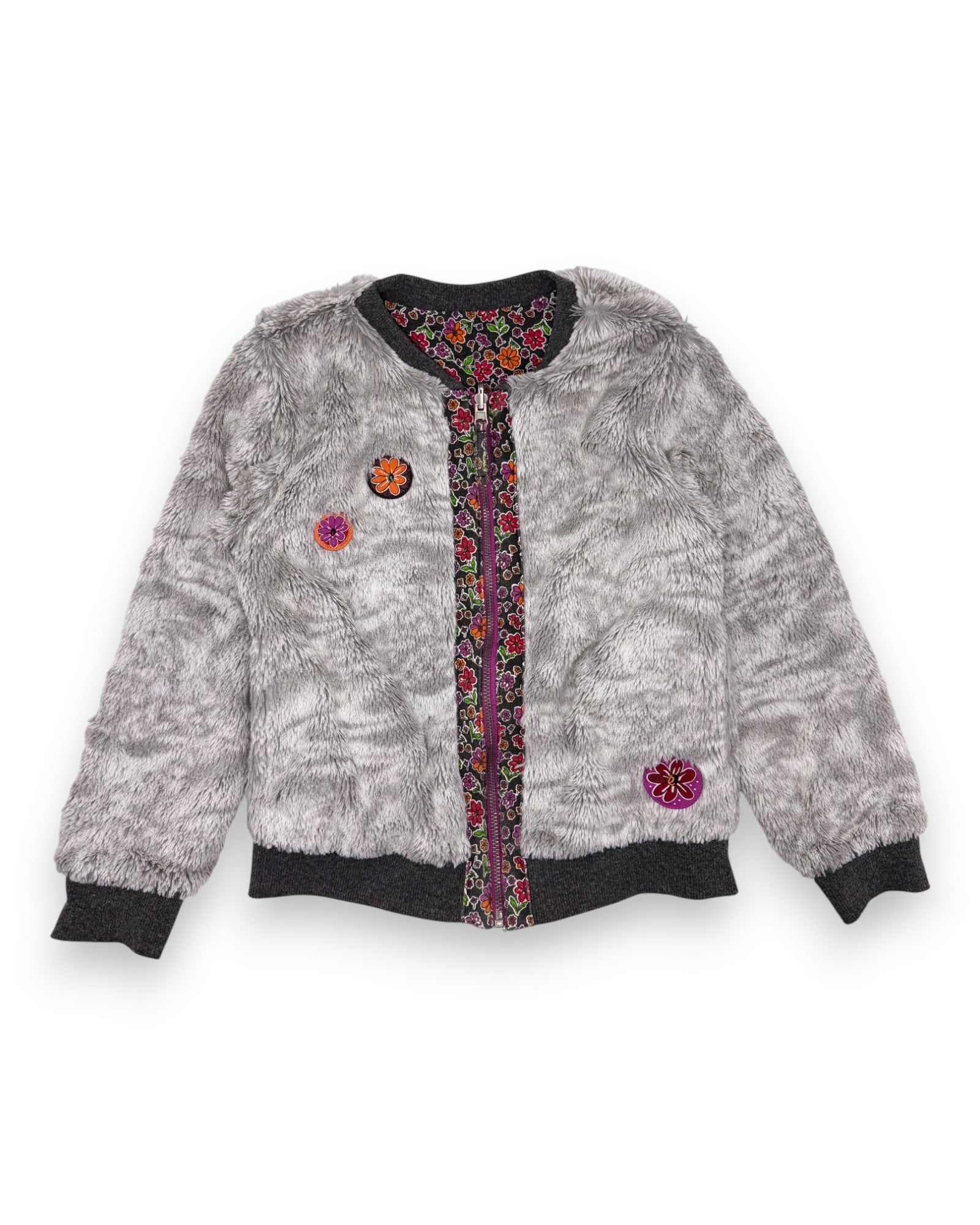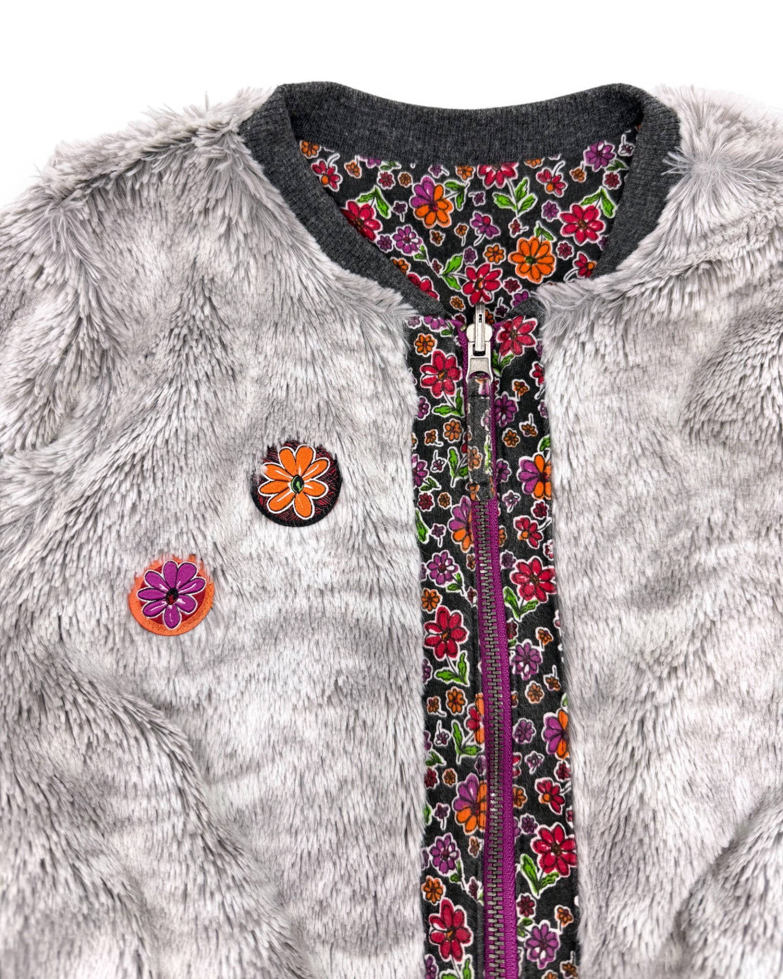 Casaco reversível com pelo sintético de um lado e padrão floral do outro, da Tuc Tuc. Bolsos nos dois lados.