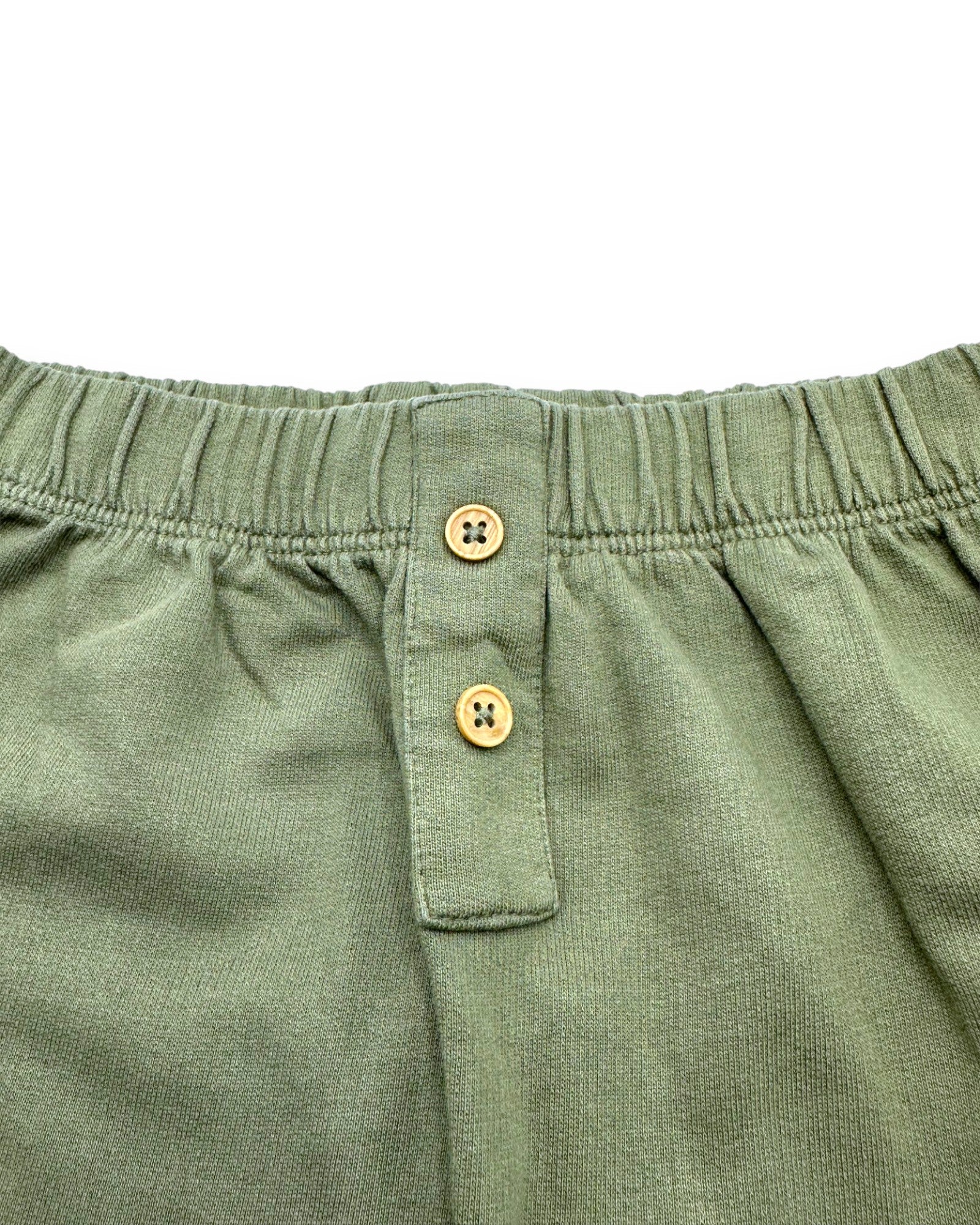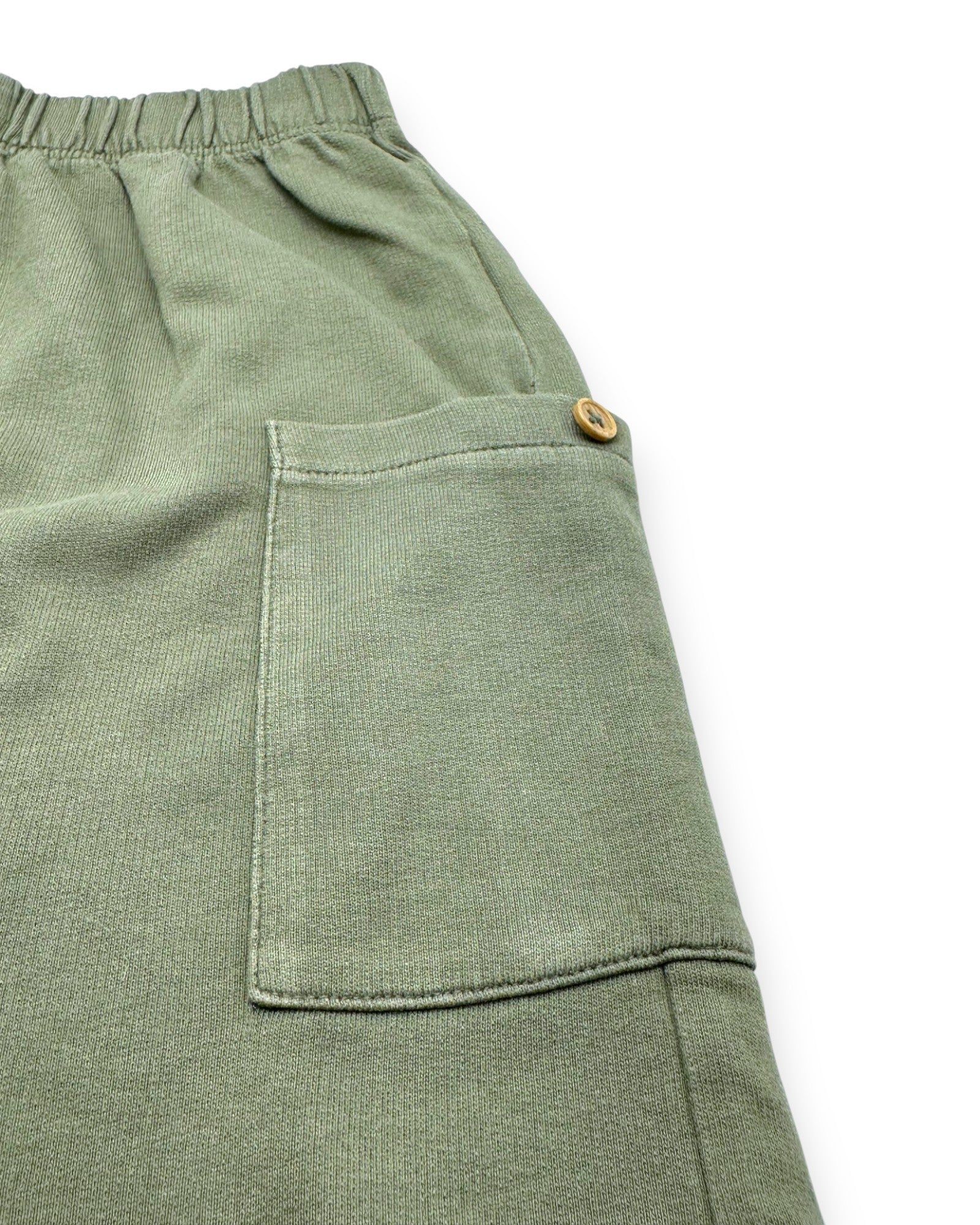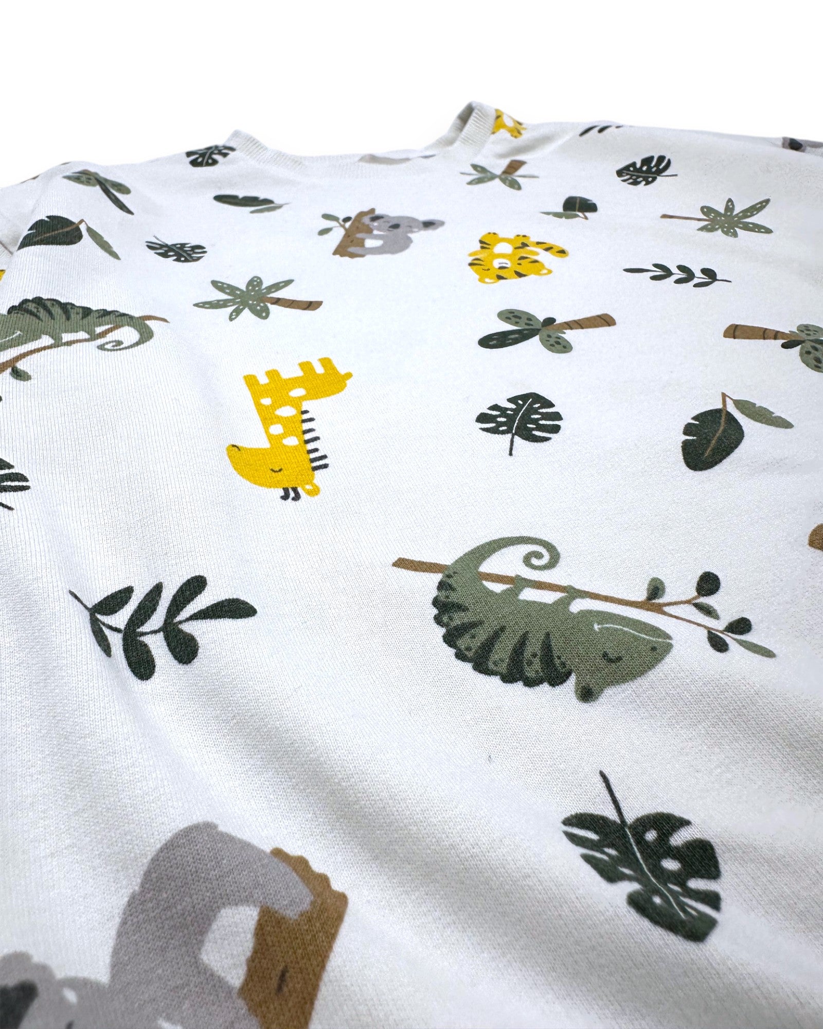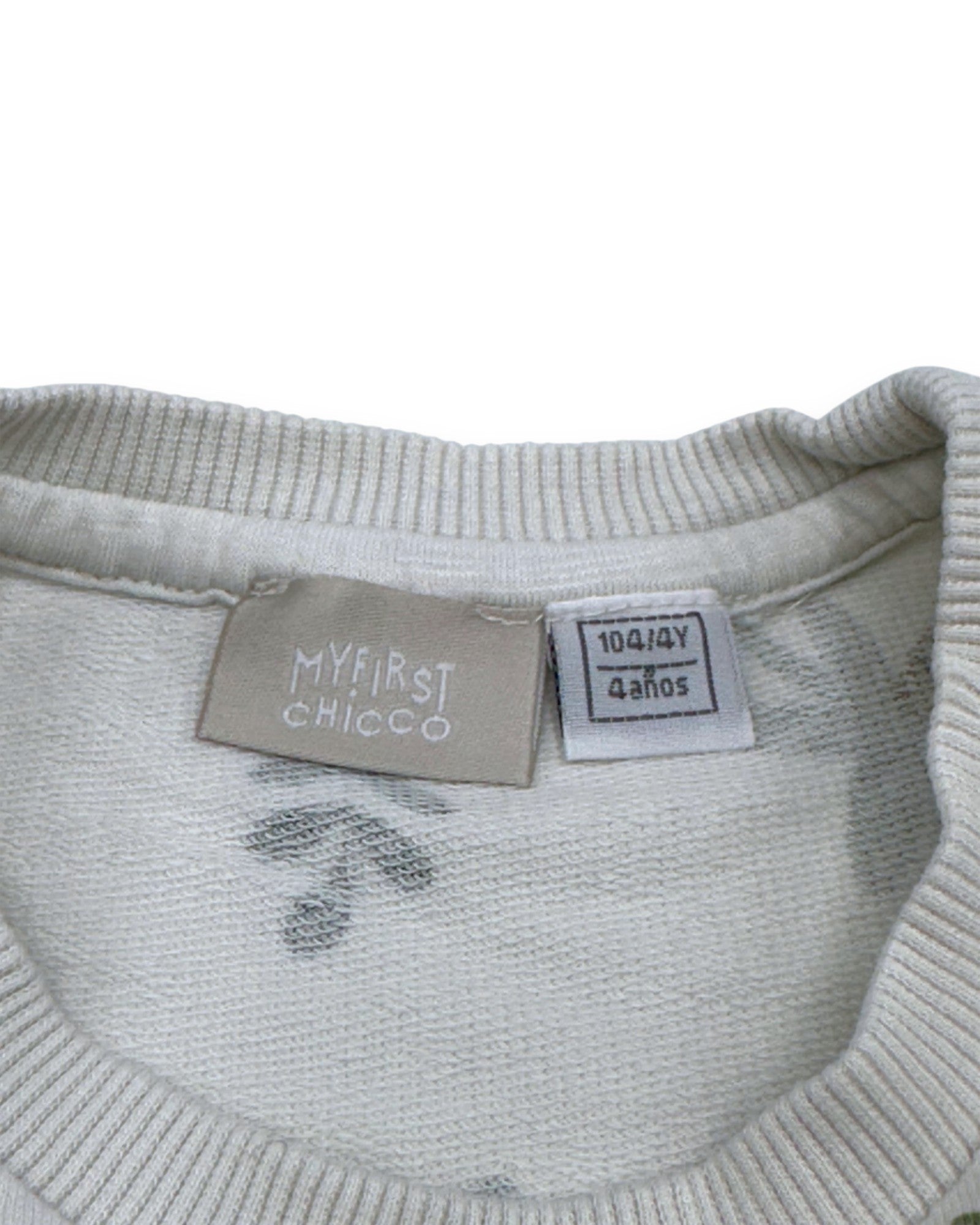 Conjunto composto por sweater branca com padrão animais e calças verdes, da Chicco.