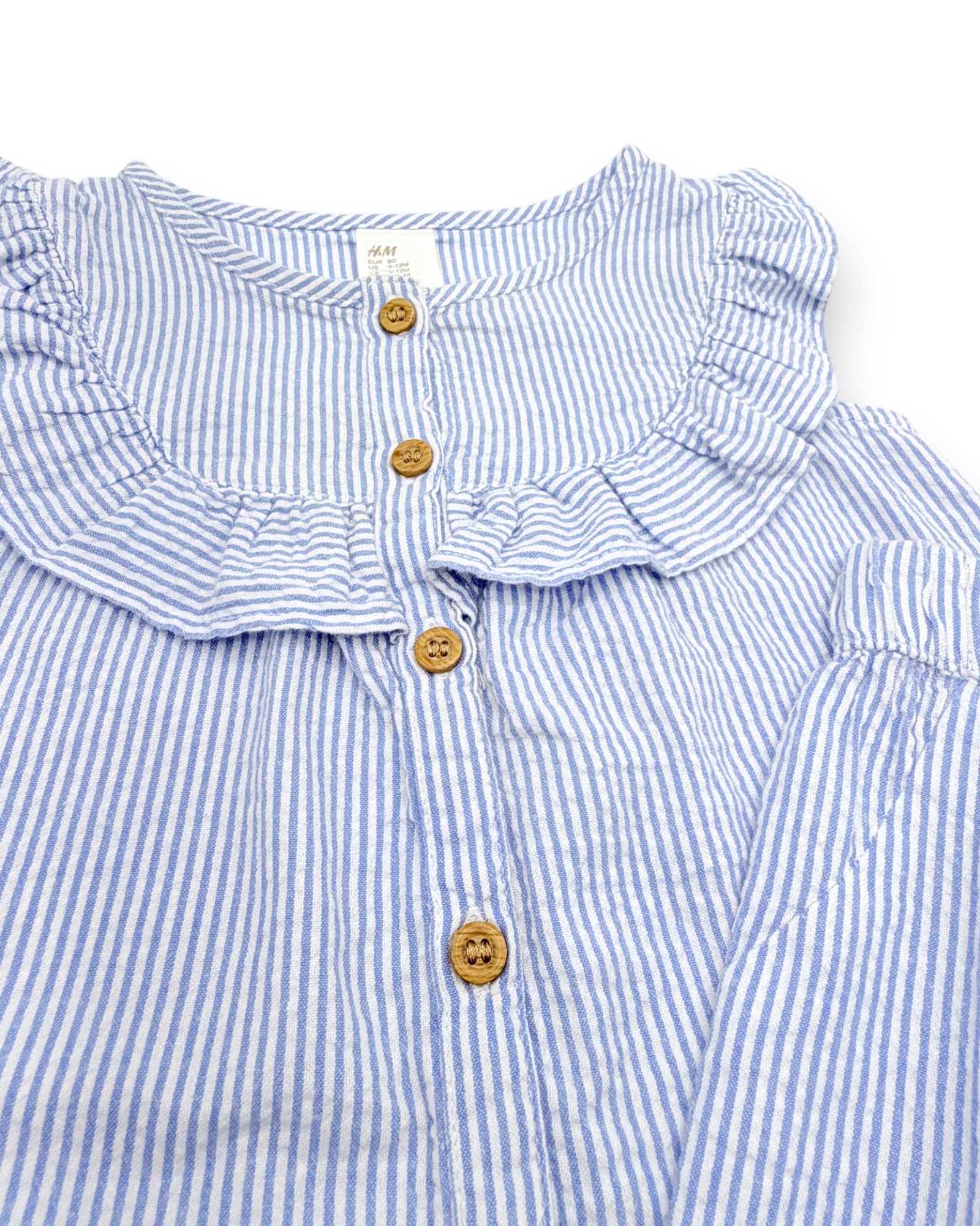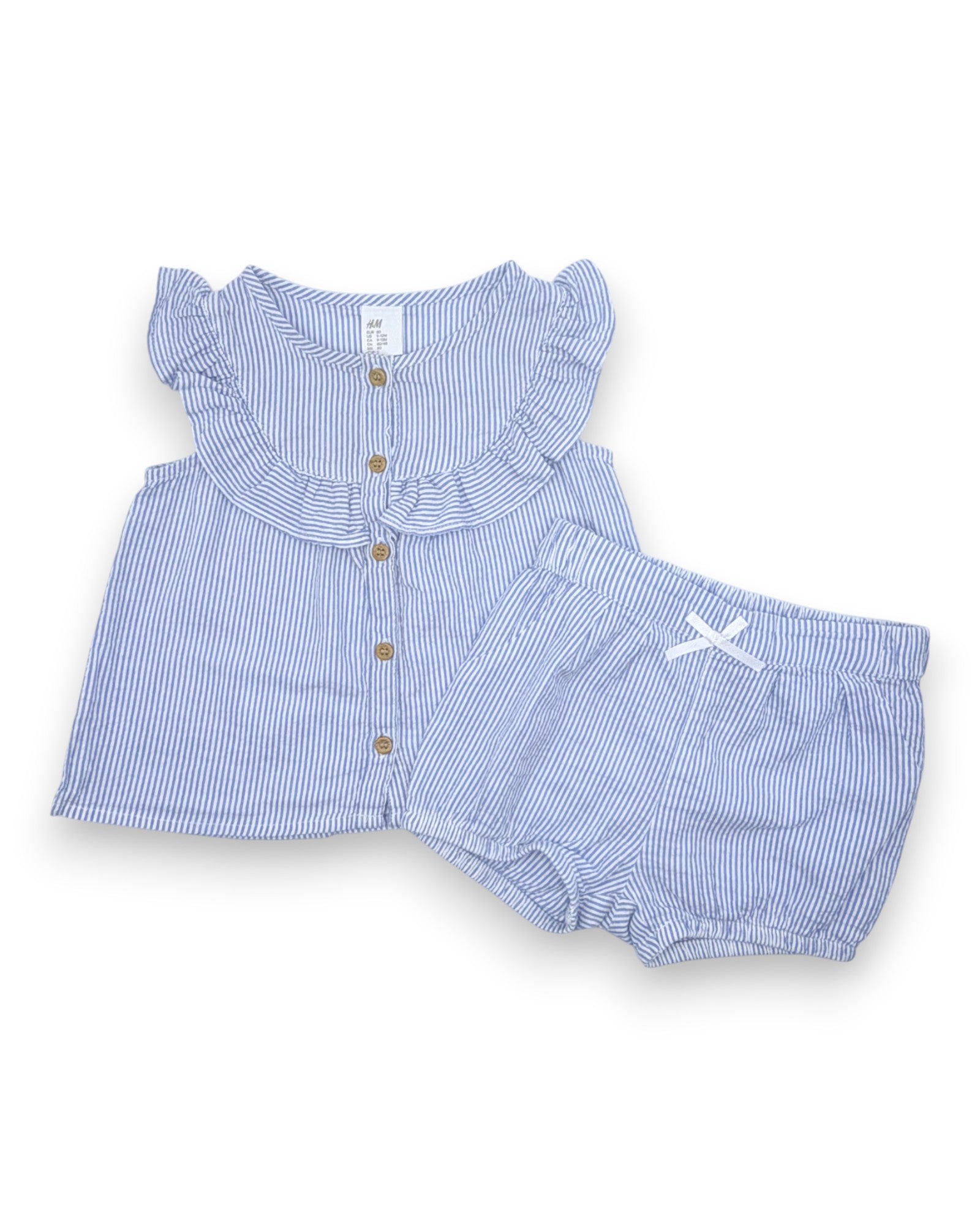 Conjunto de top sem mangas e calções azuis às riscas, da H&M.