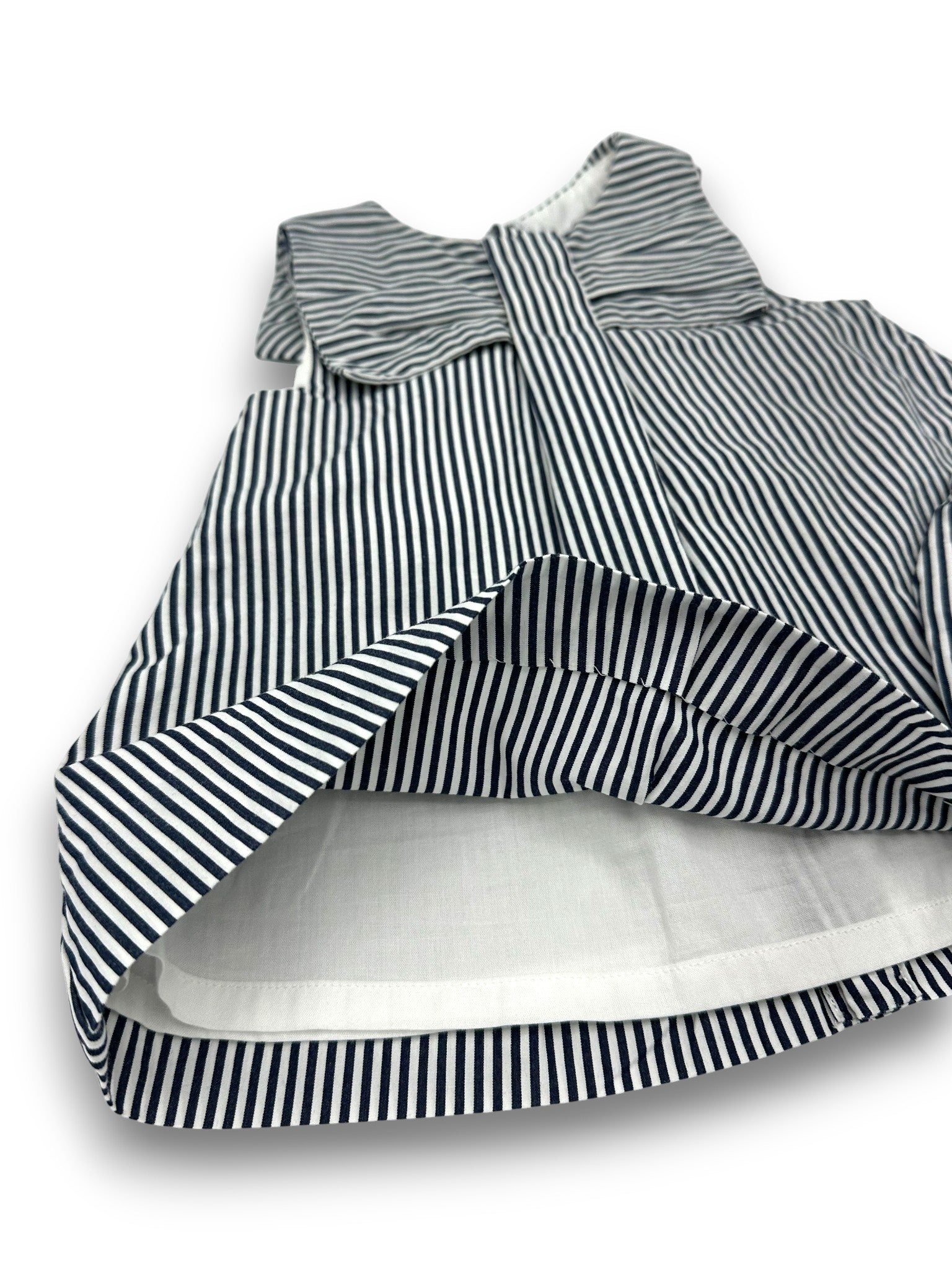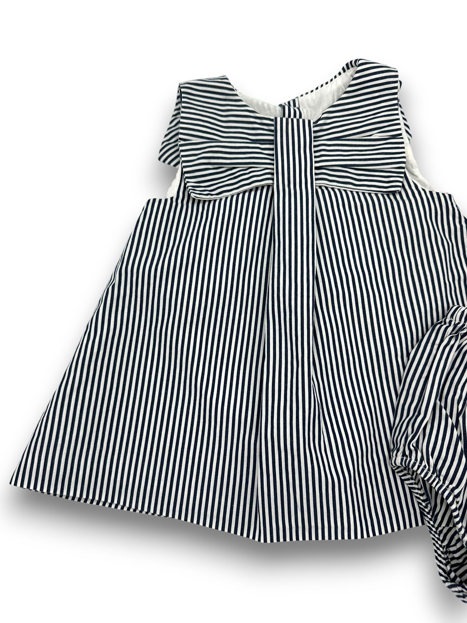 Conjunto composto por vestido e tapa fraldas às riscas azuis, da marca Jacadi. Vestido com forro em algodão.