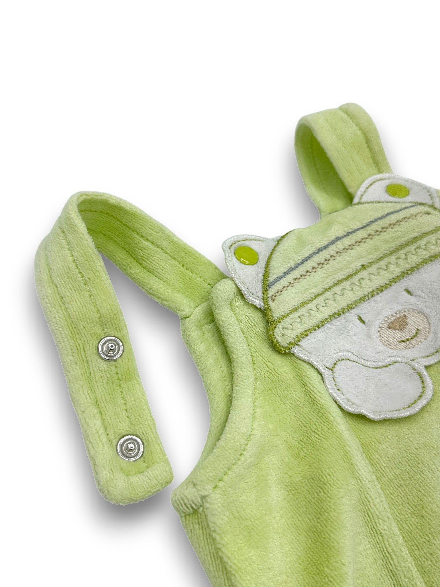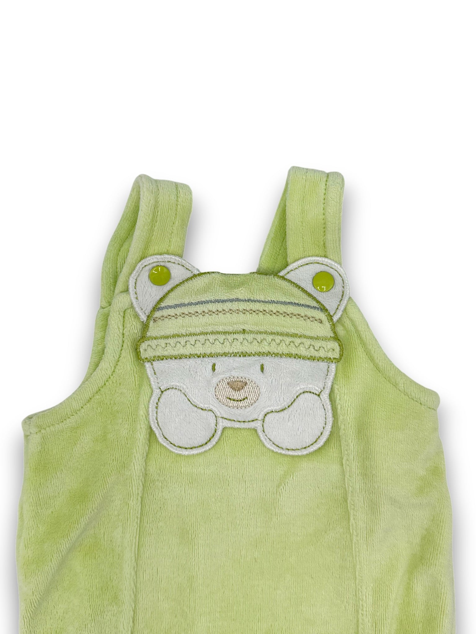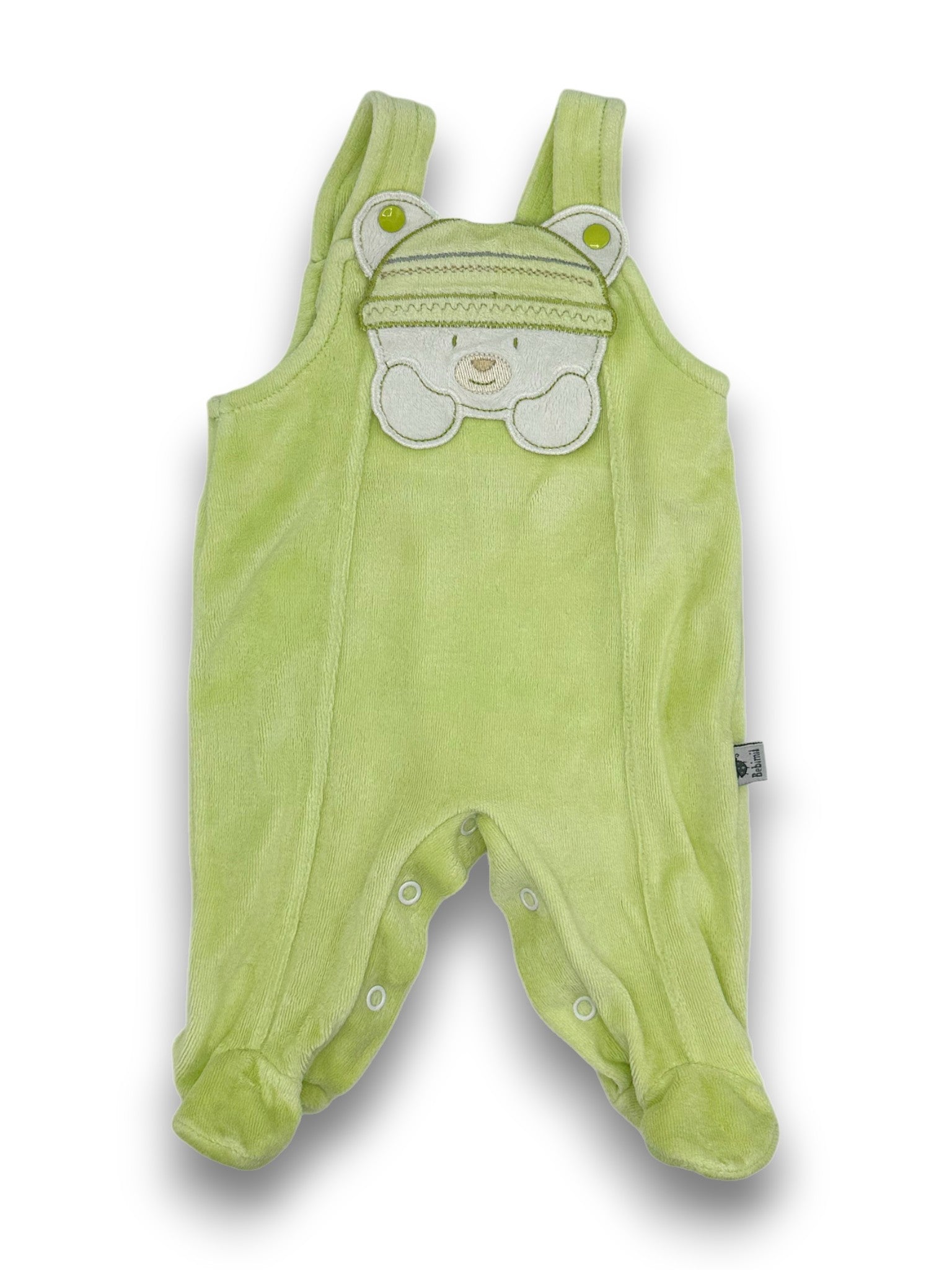 Jardineiras polar com pezinhos, em tom verde e alças ajustáveis, da marca Bebimil.