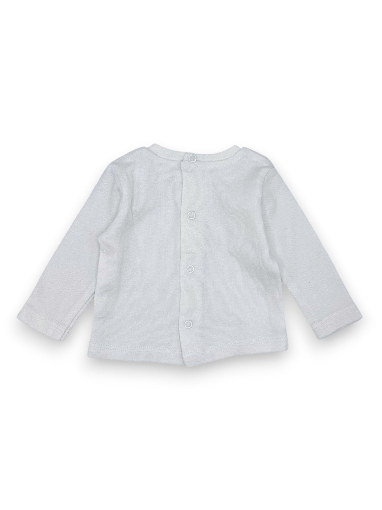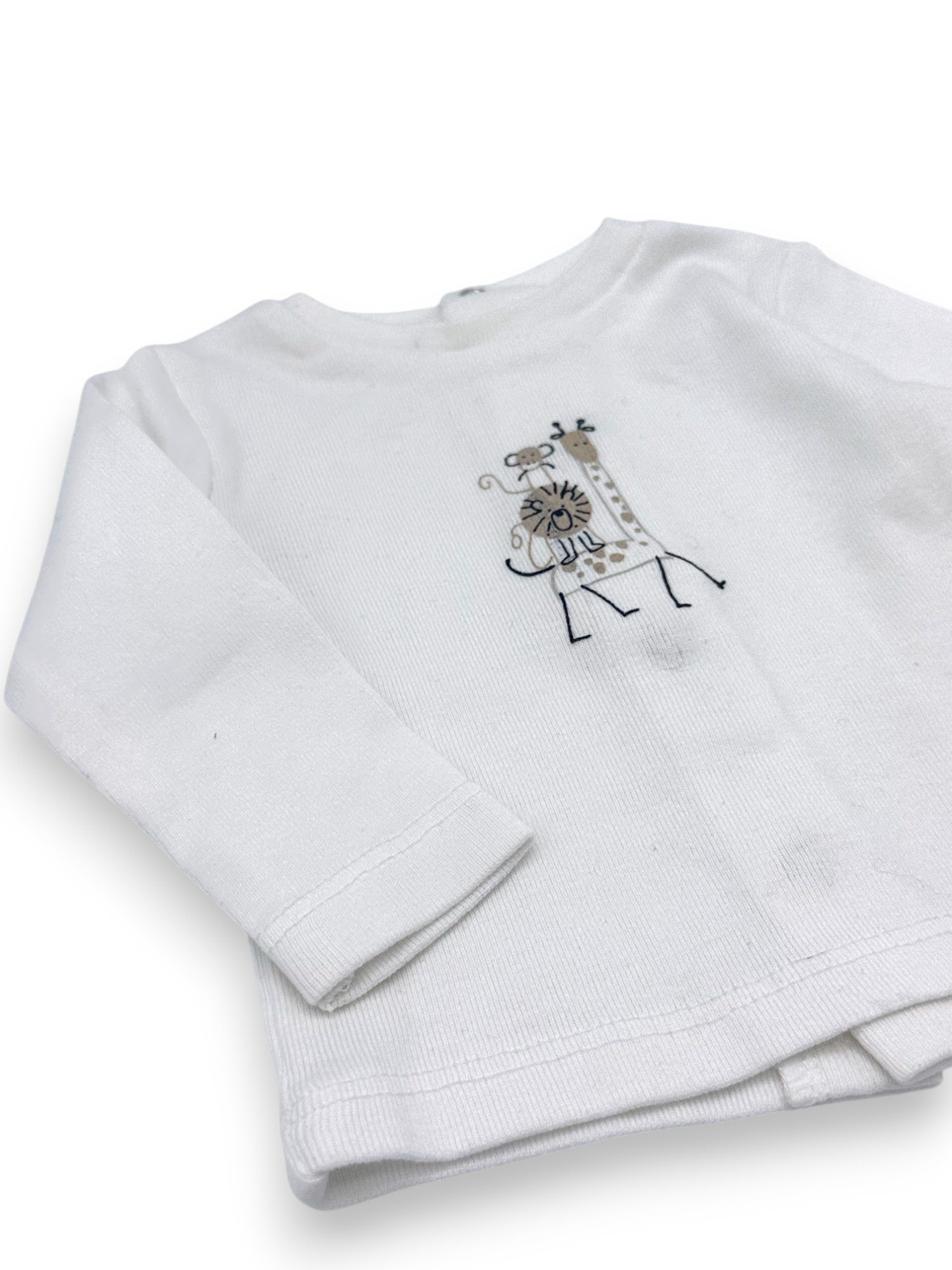 T-shirt branca de mangas compridas com ilustração animais, com abertura nas costas.