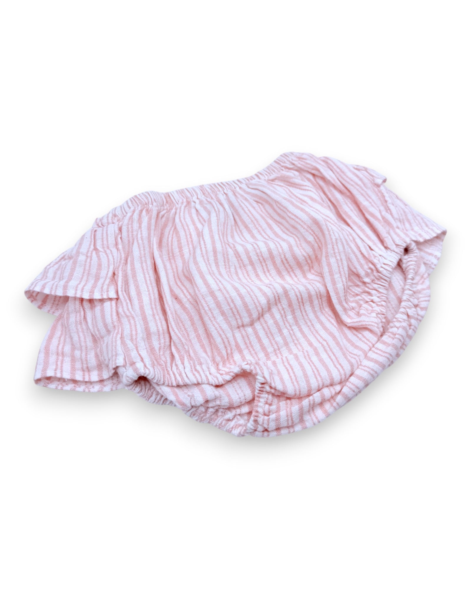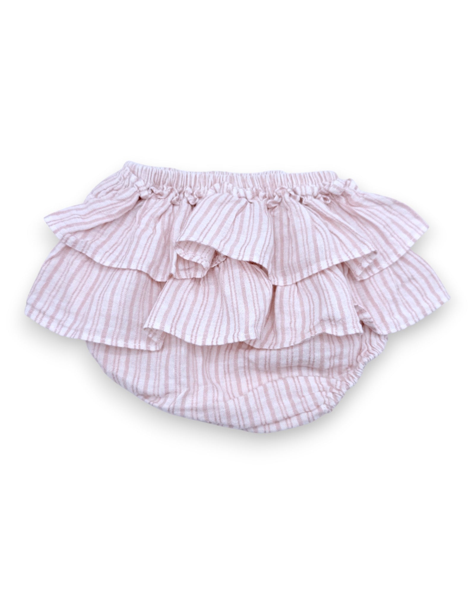 Tapa fraldas rosa, às riscas, com folhos na parte de trás.