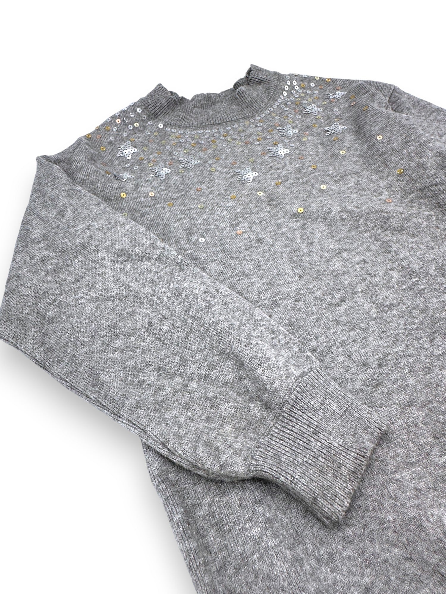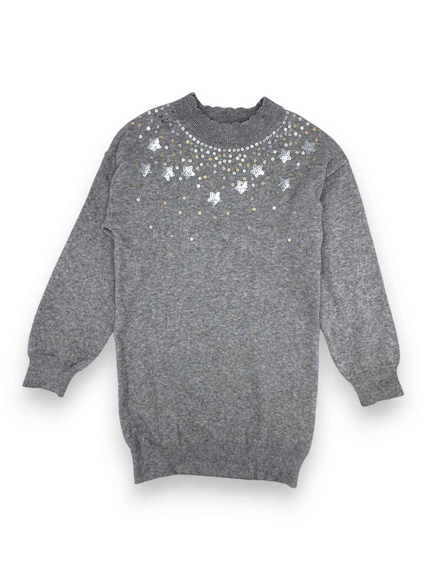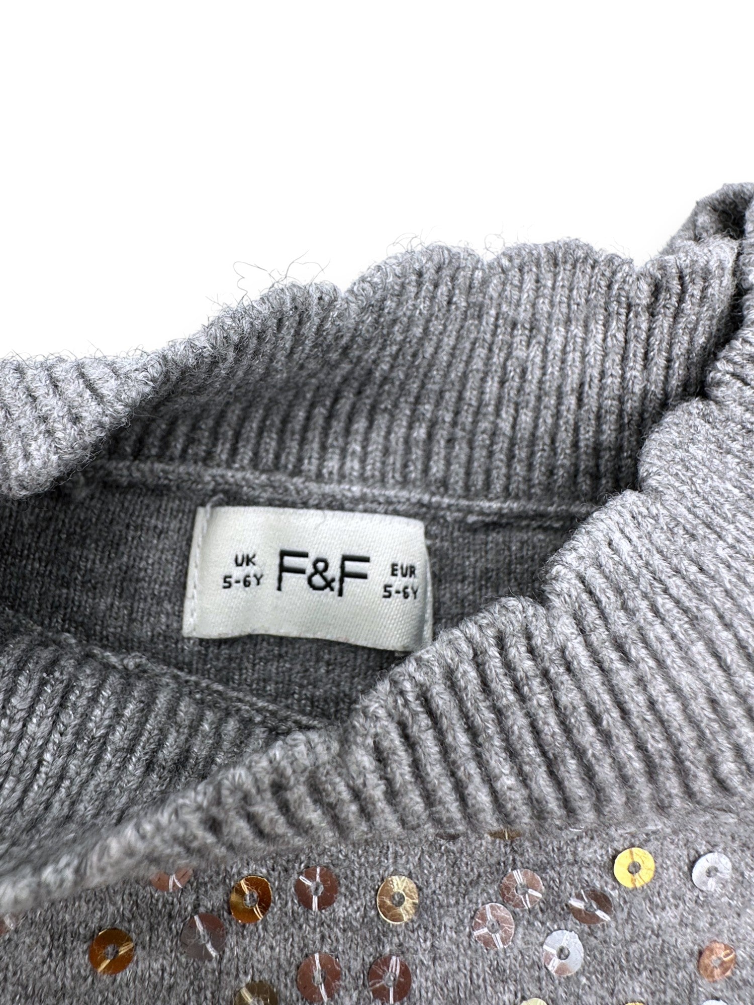Vestido em malha cinzenta com lantejoulas na zona da gola, da marca F&F.