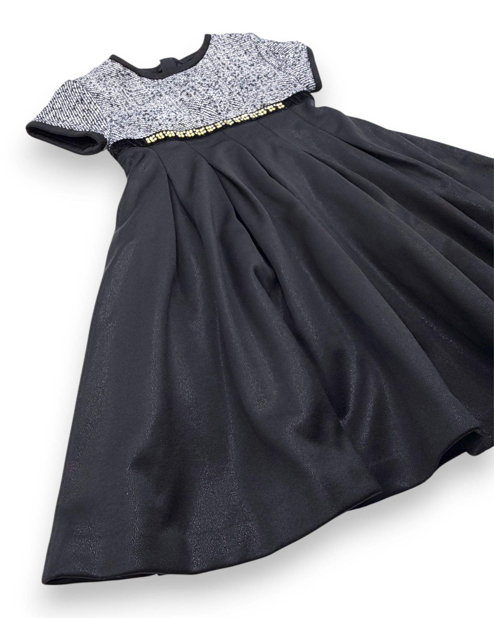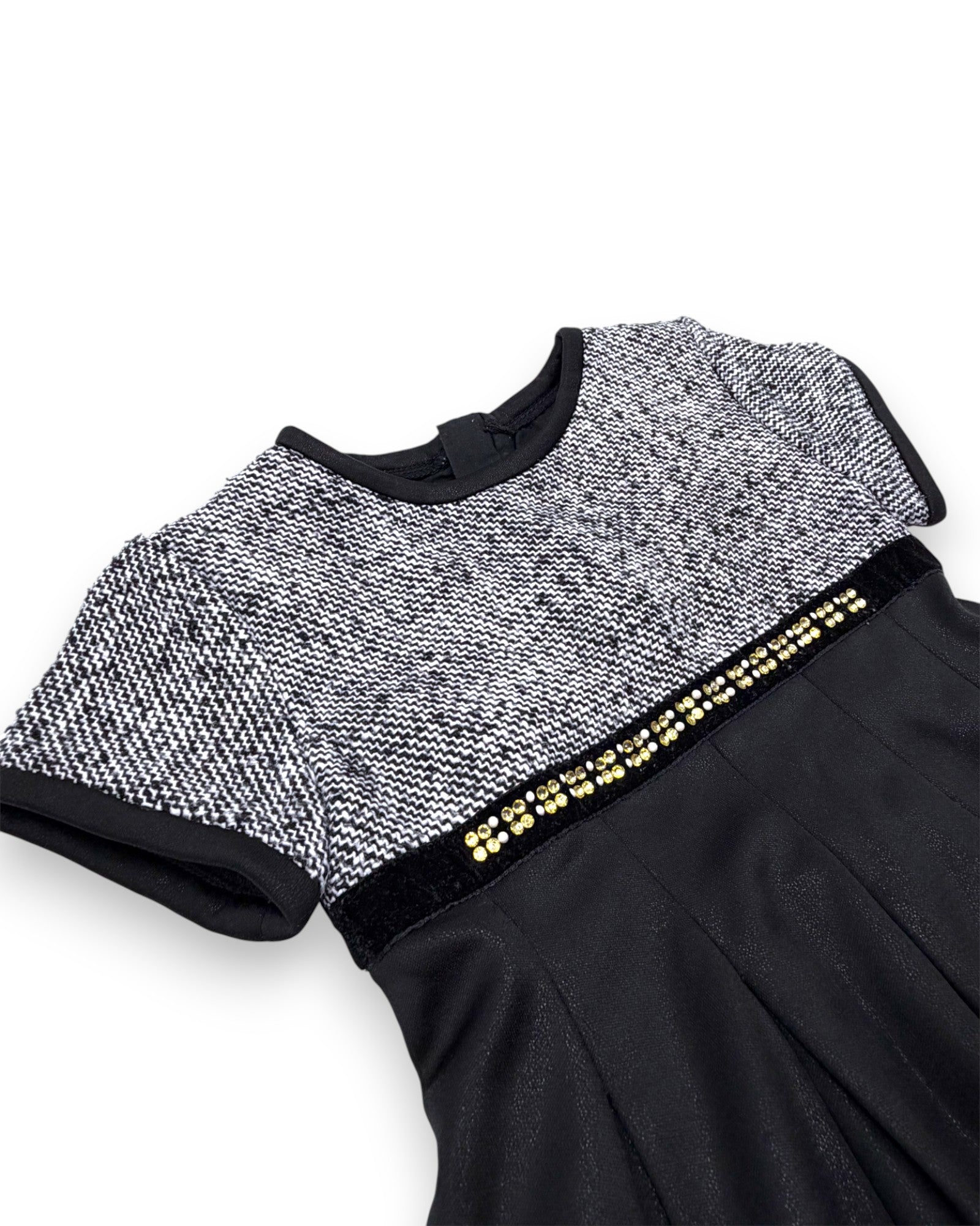 Black dress with multi-layered fabric and rhinestone detail at the waist, by Mayoral.