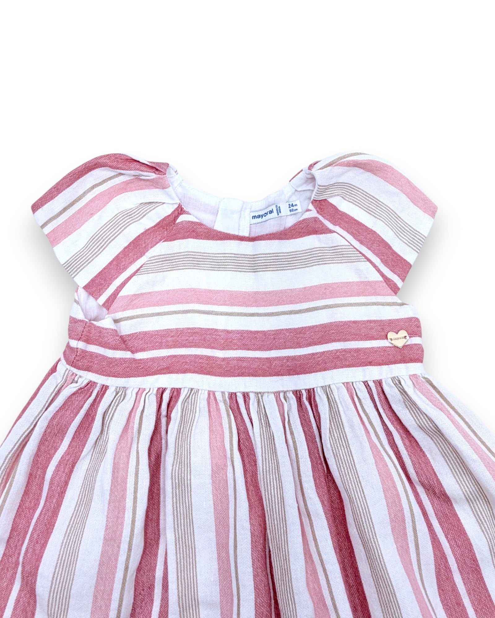 Vestido rosa, às riscas, de mangas curtas, da Mayoral.