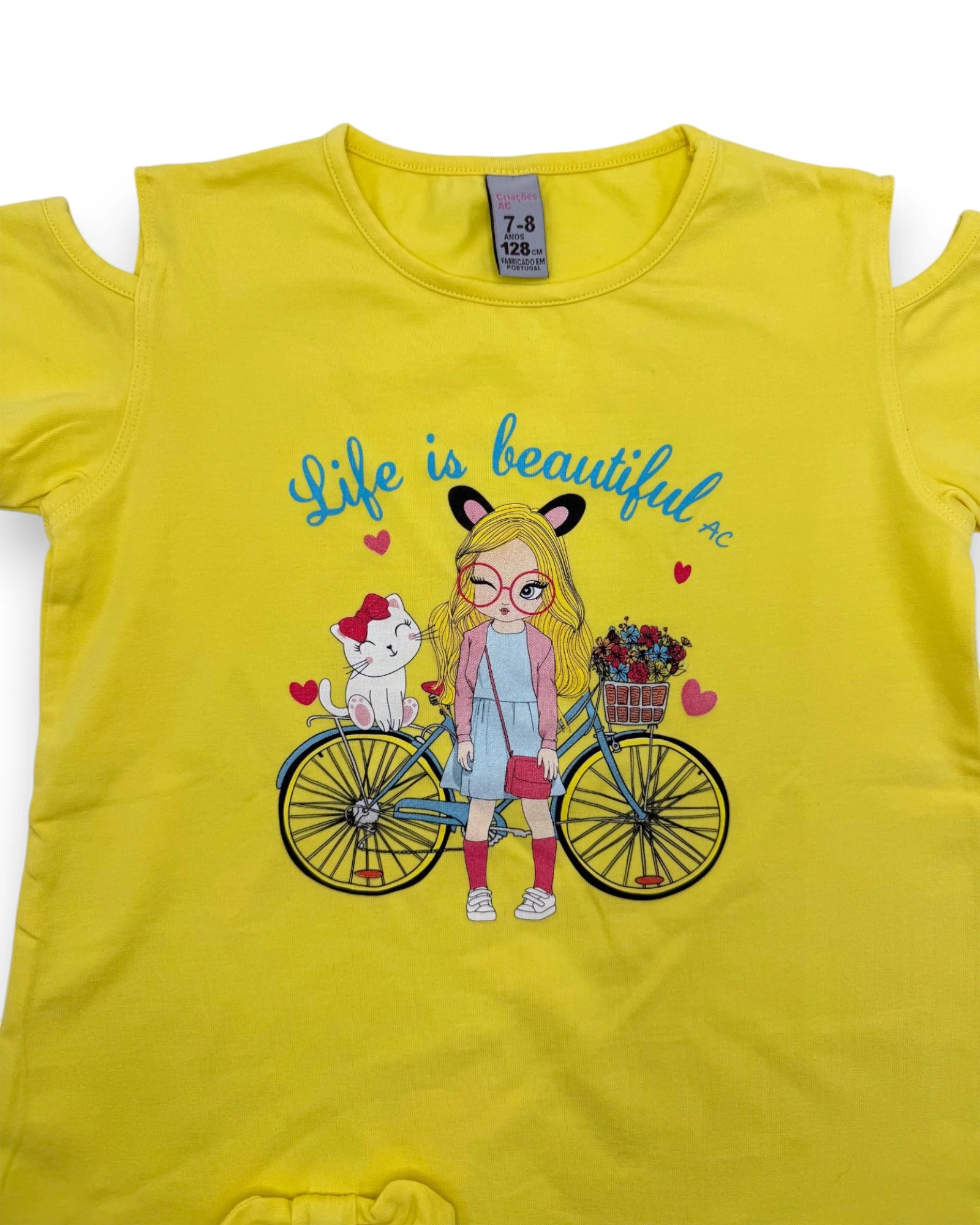 Altura: 128 cm. Camiseta amarilla de manga corta, de la marca Criações AC.
