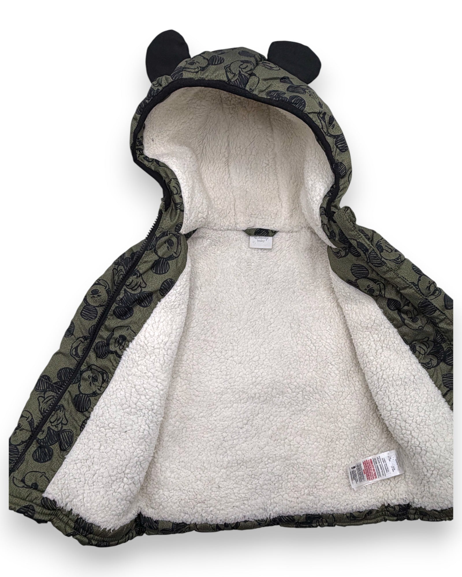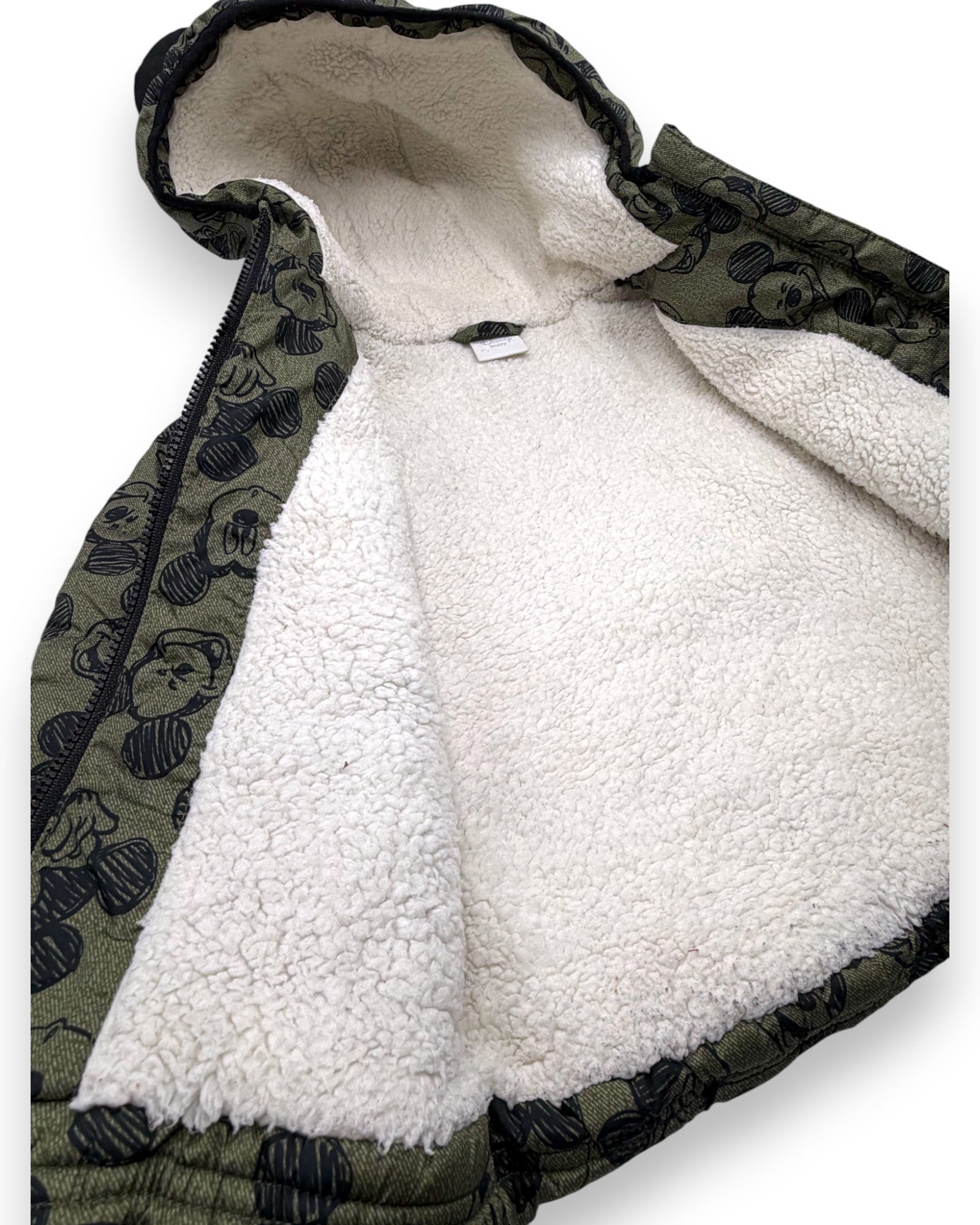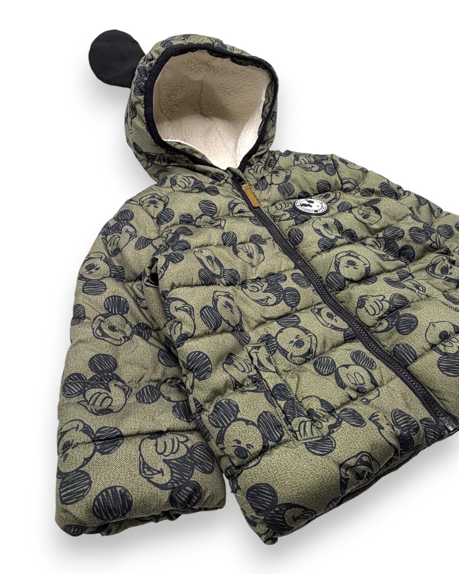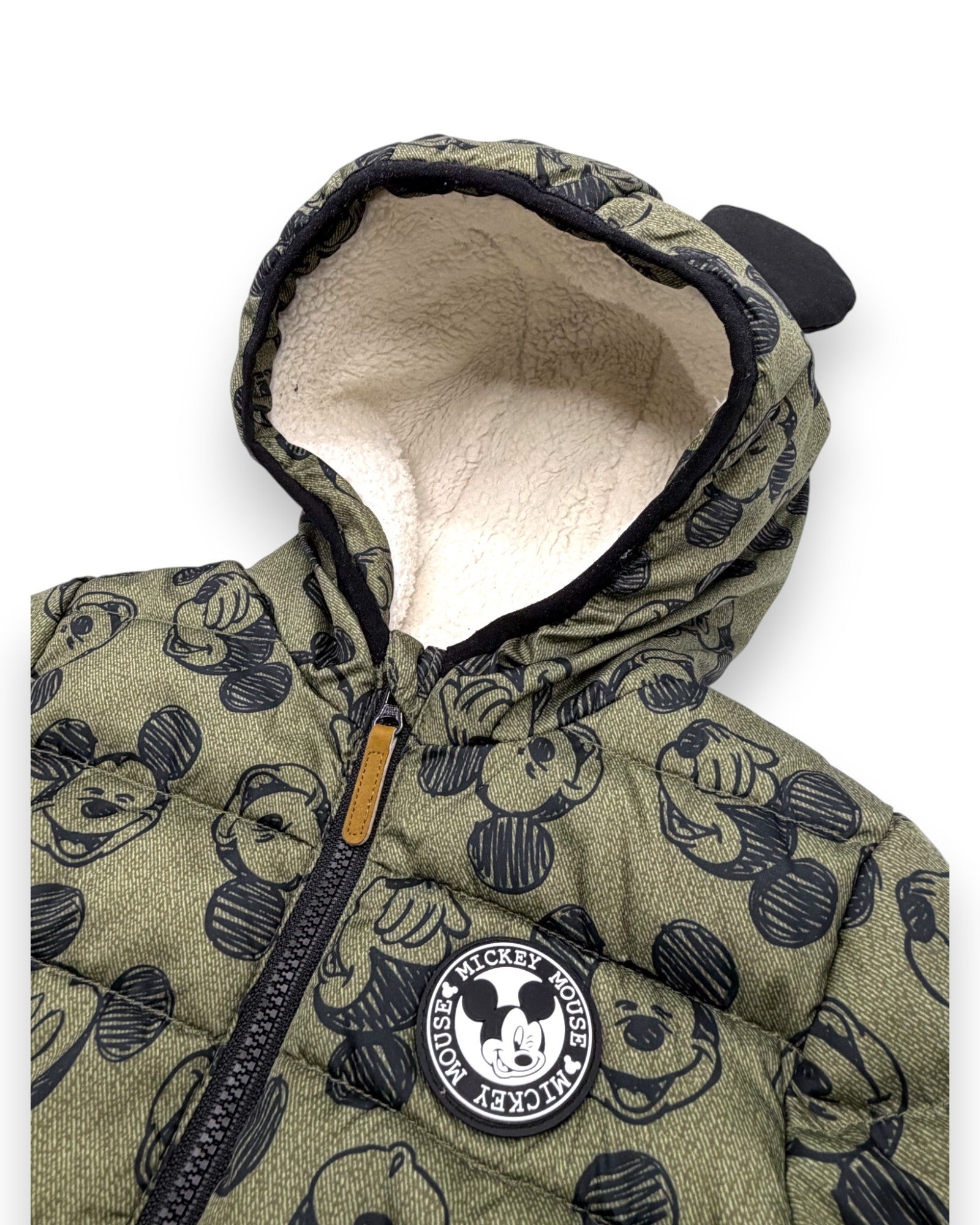 Blusão almofadado verde, com forro polar, capuz com orelhas e ilustrações do Mickey, da Disney.