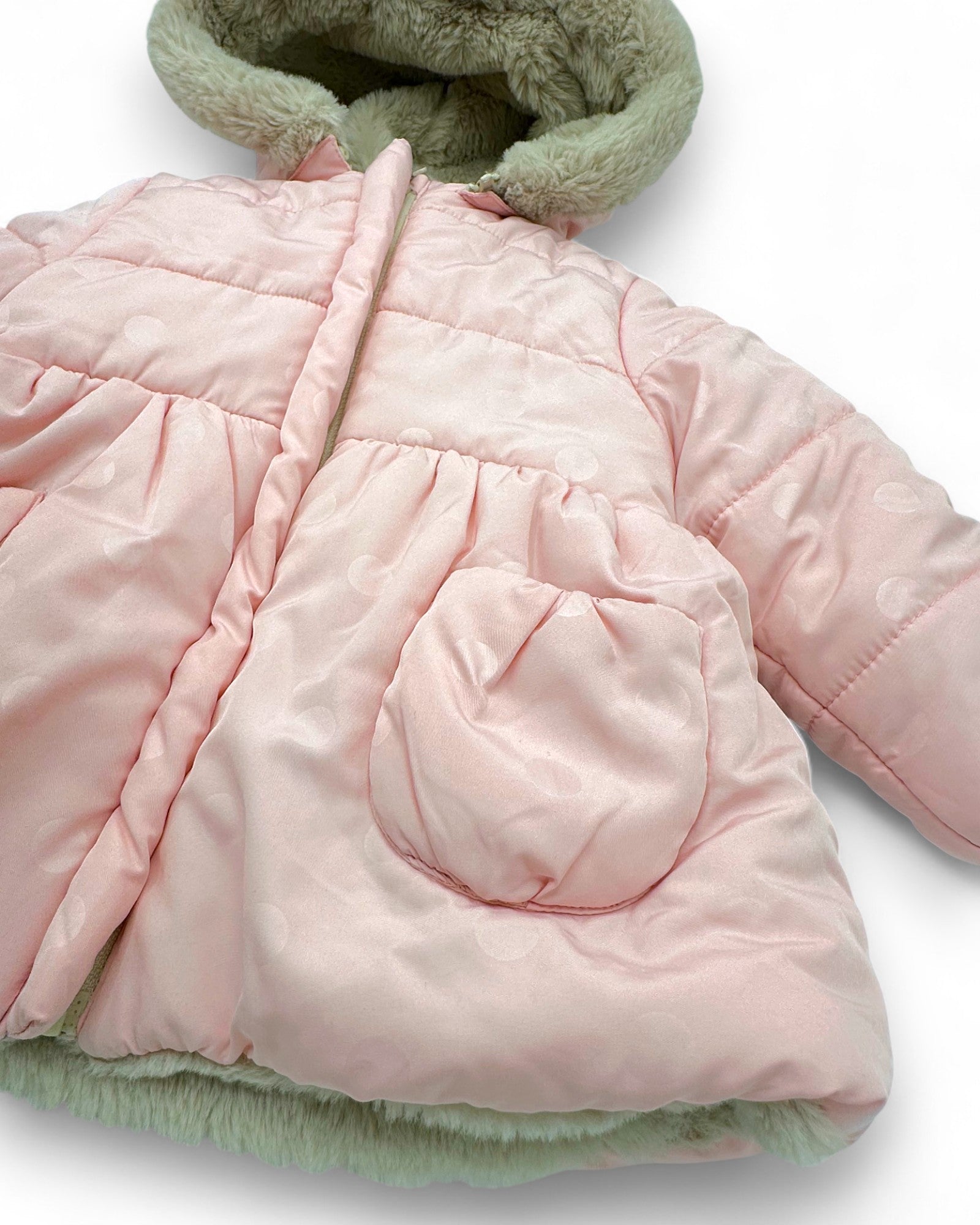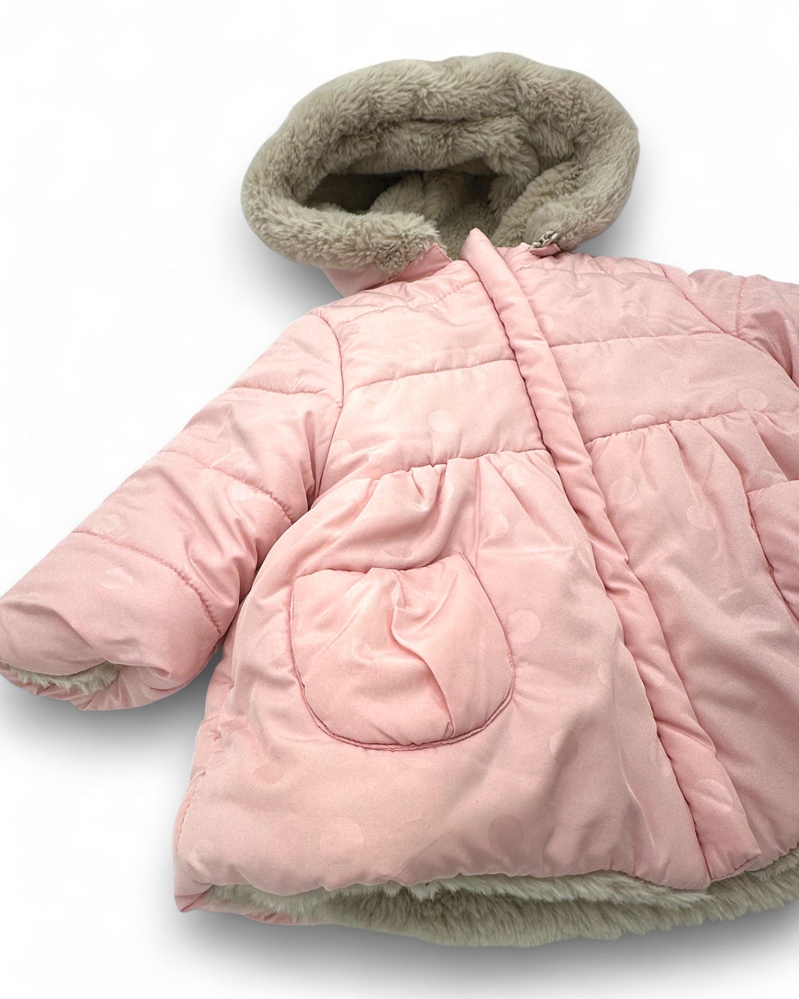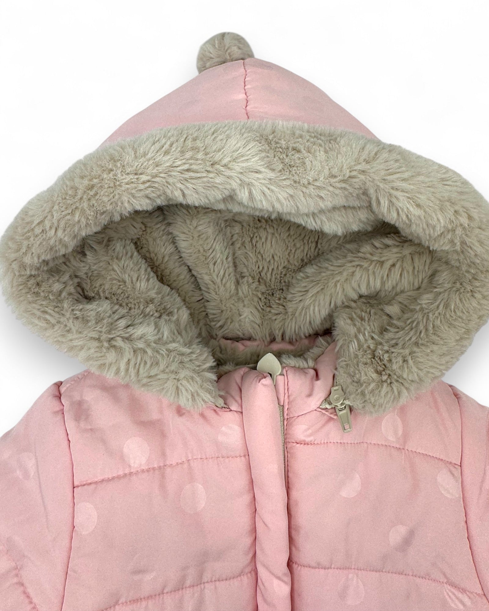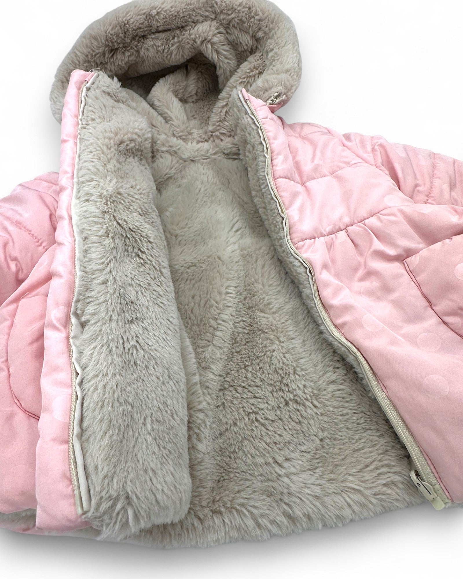 Blusão rosa com forro em pelo sintético, e gorro amovível, da Mayoral.