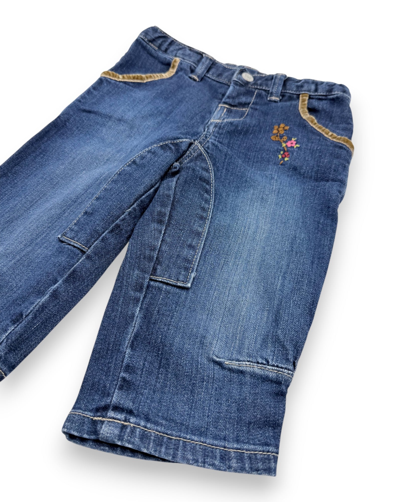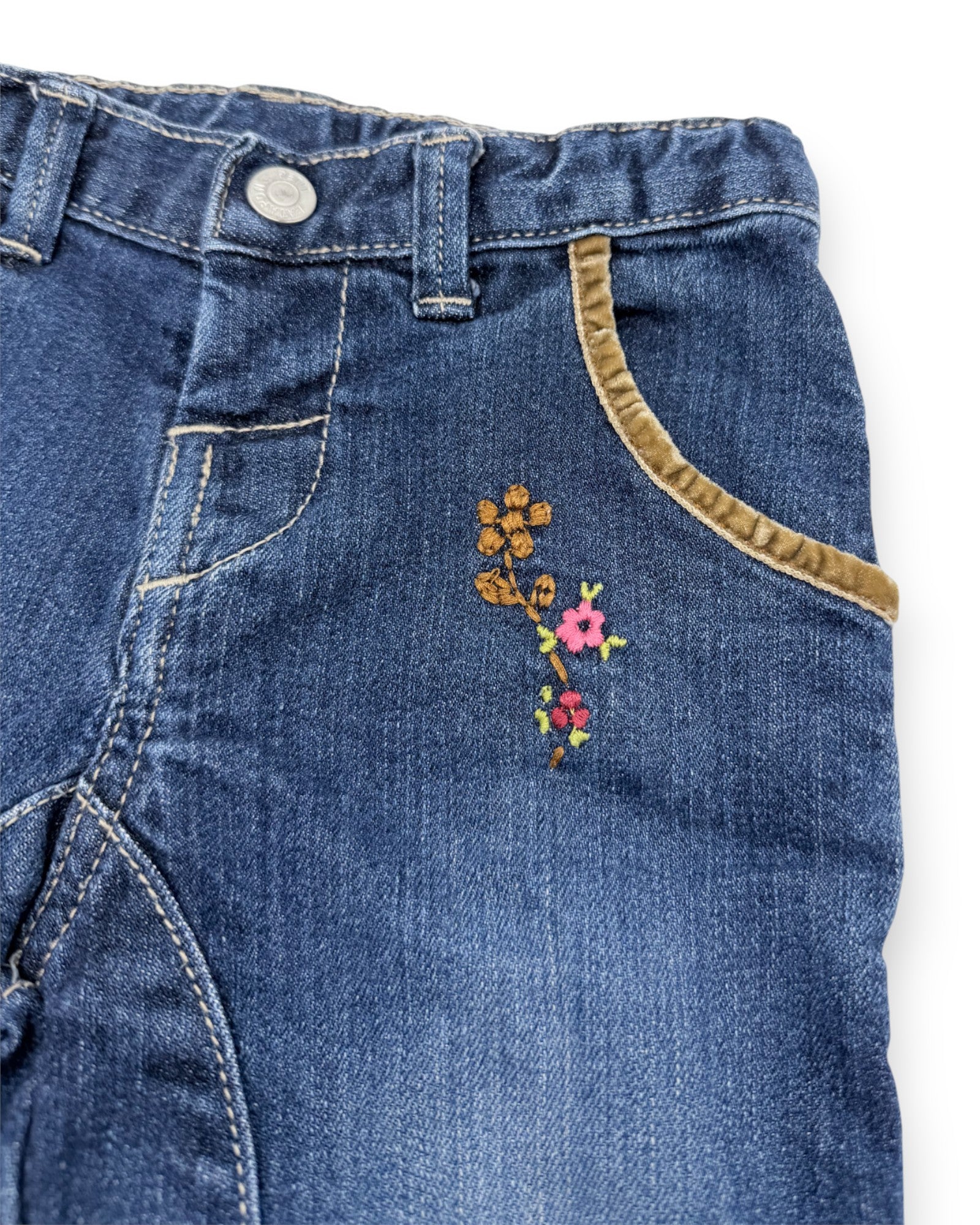 Calças de ganga, com detalhes brilhantes nos bolsos e pormenores bordados, da Petit Patapon.