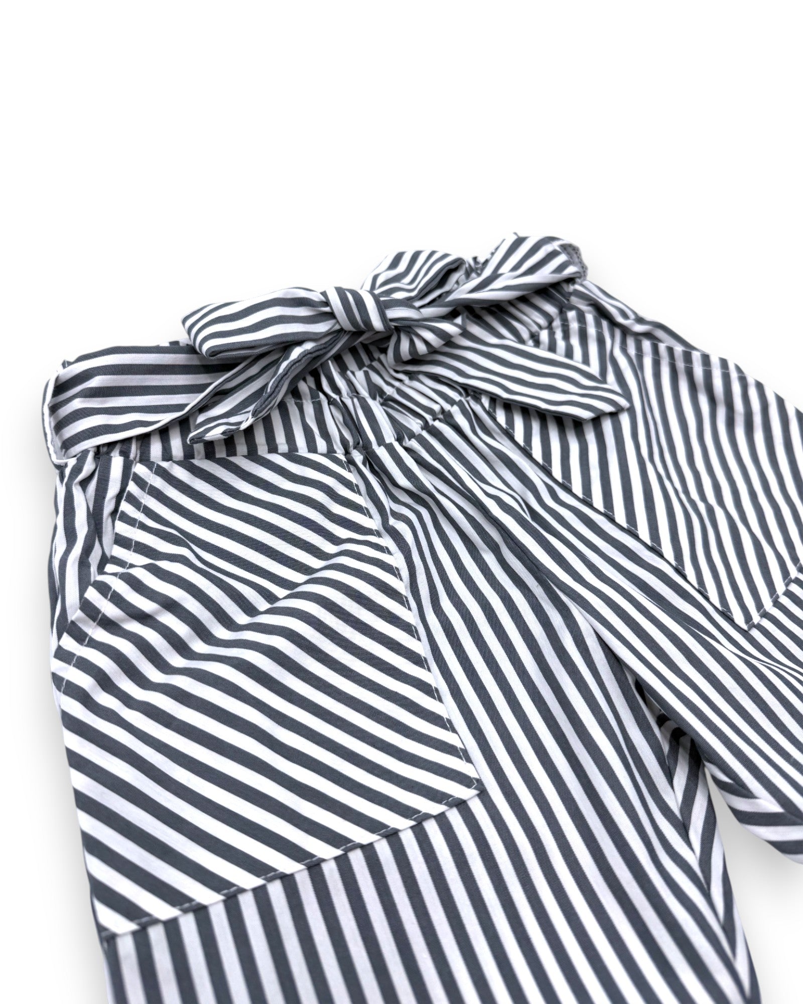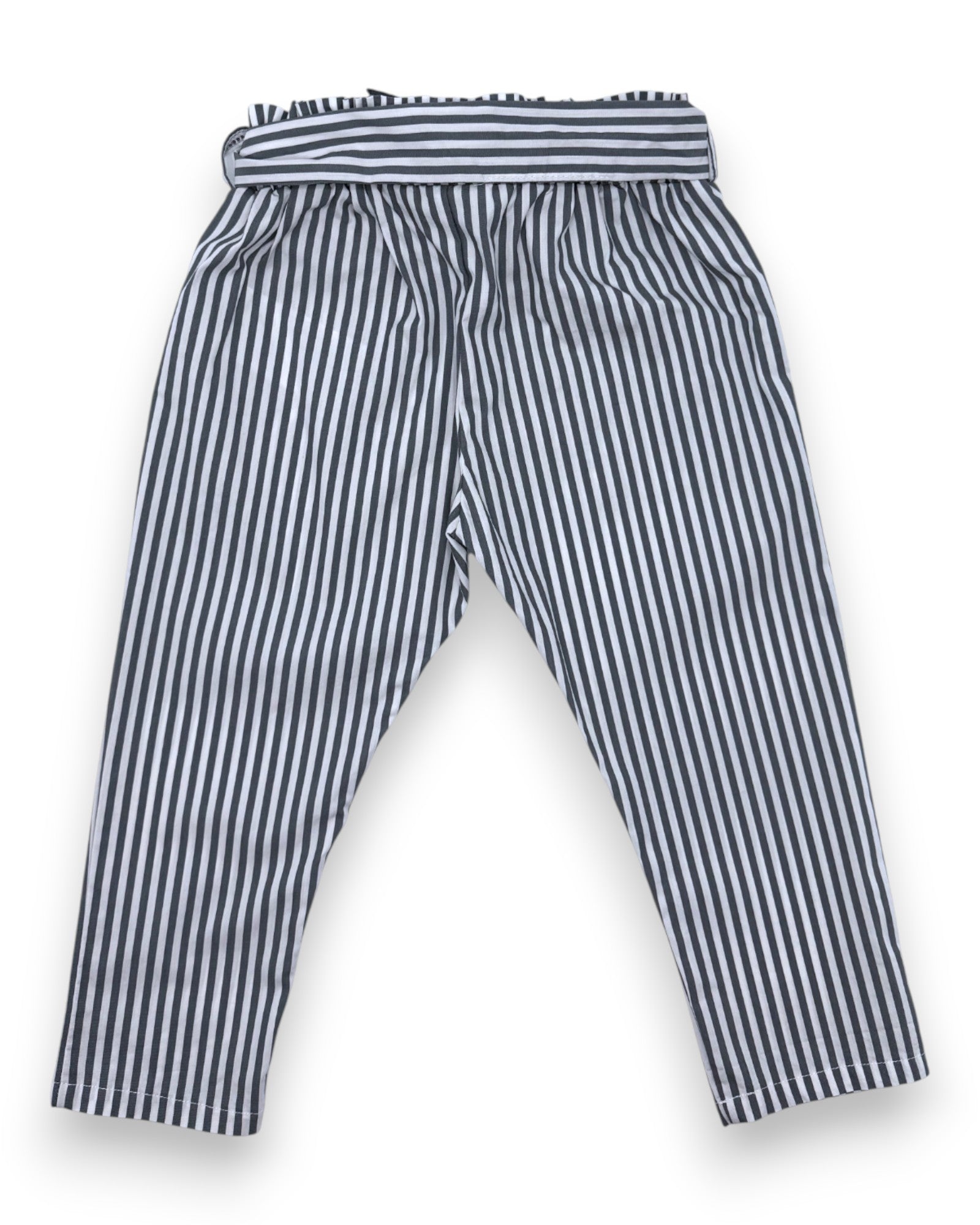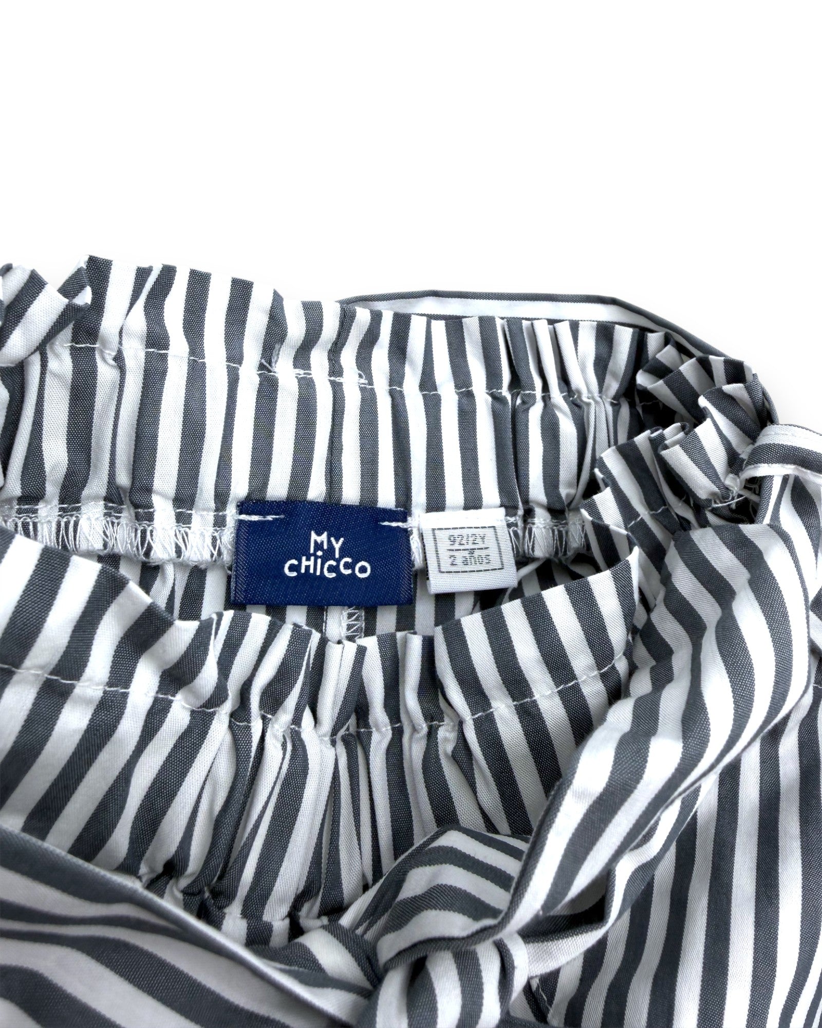 Calças às riscas cinzentas, estilo paperbag, da Chicco.
