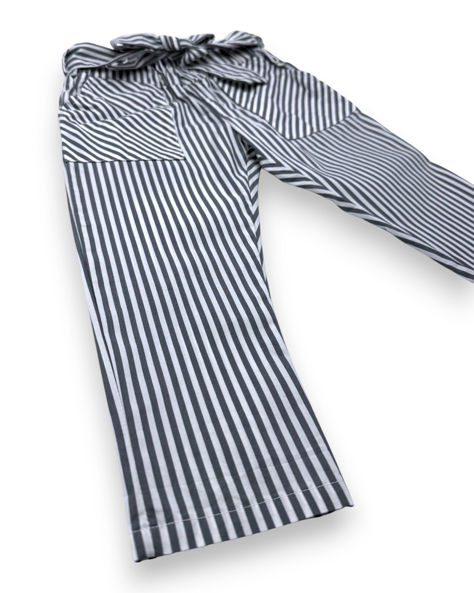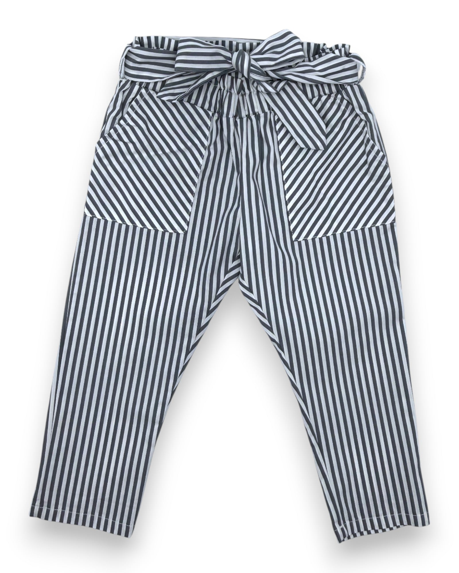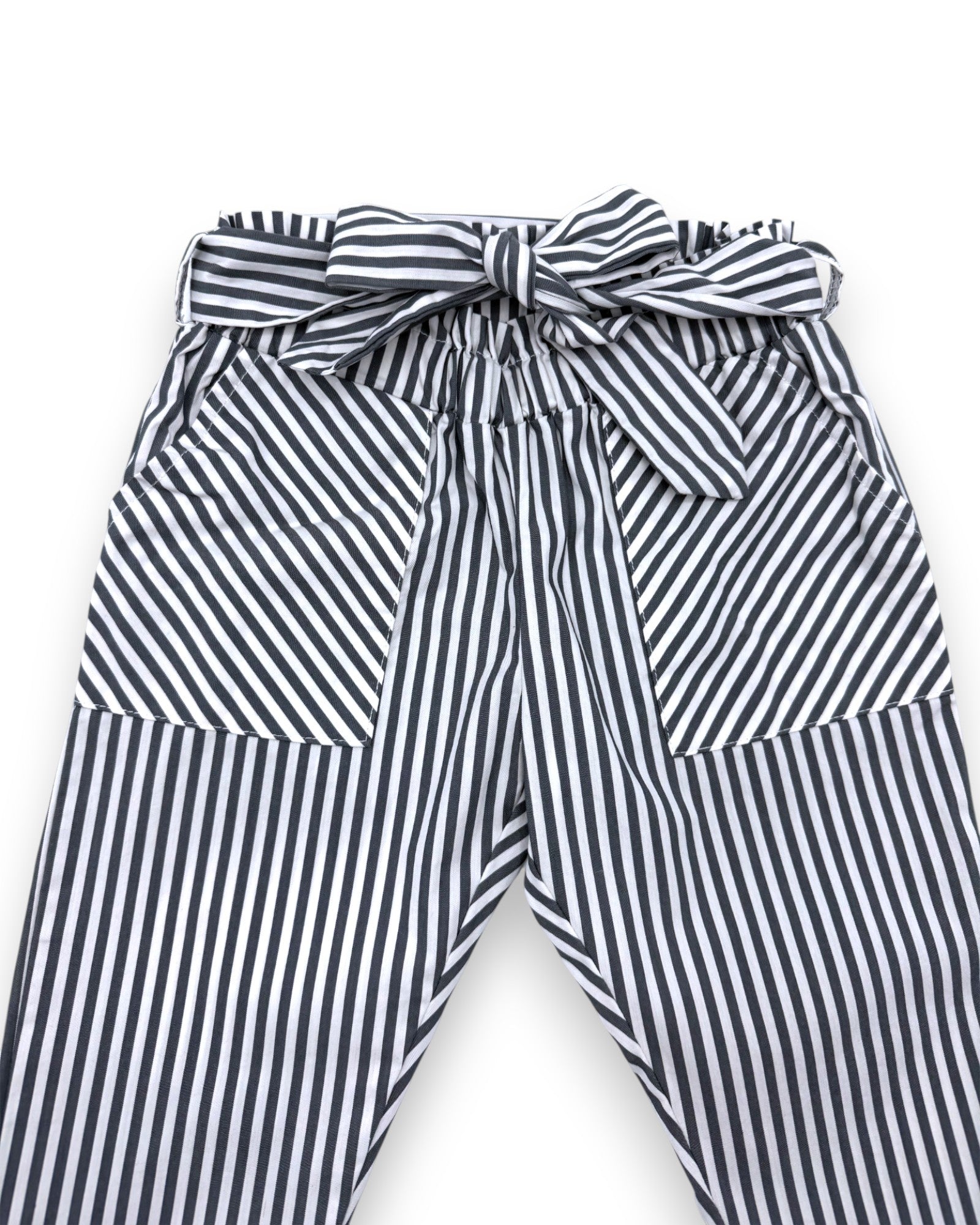 Calças às riscas cinzentas, estilo paperbag, da Chicco.