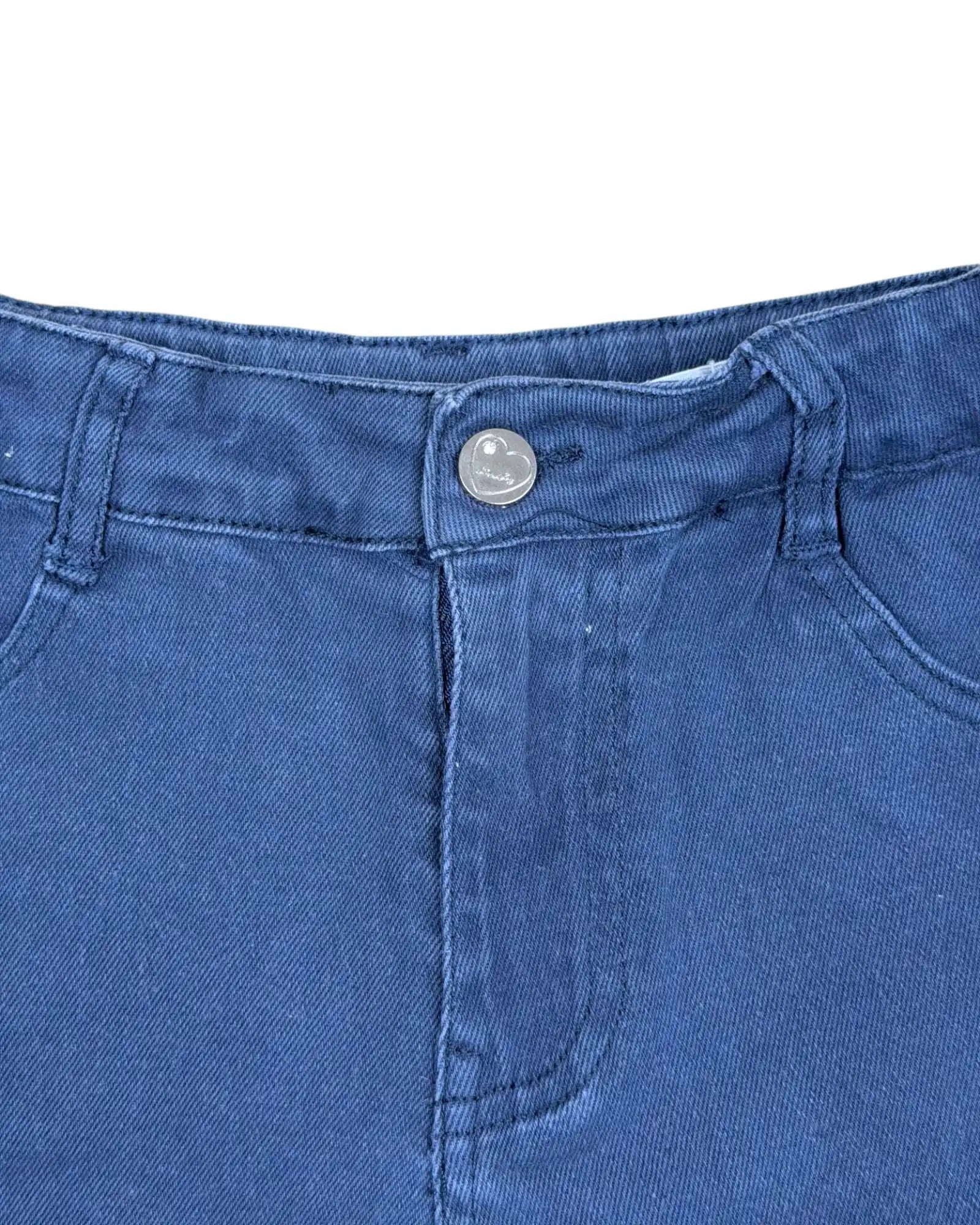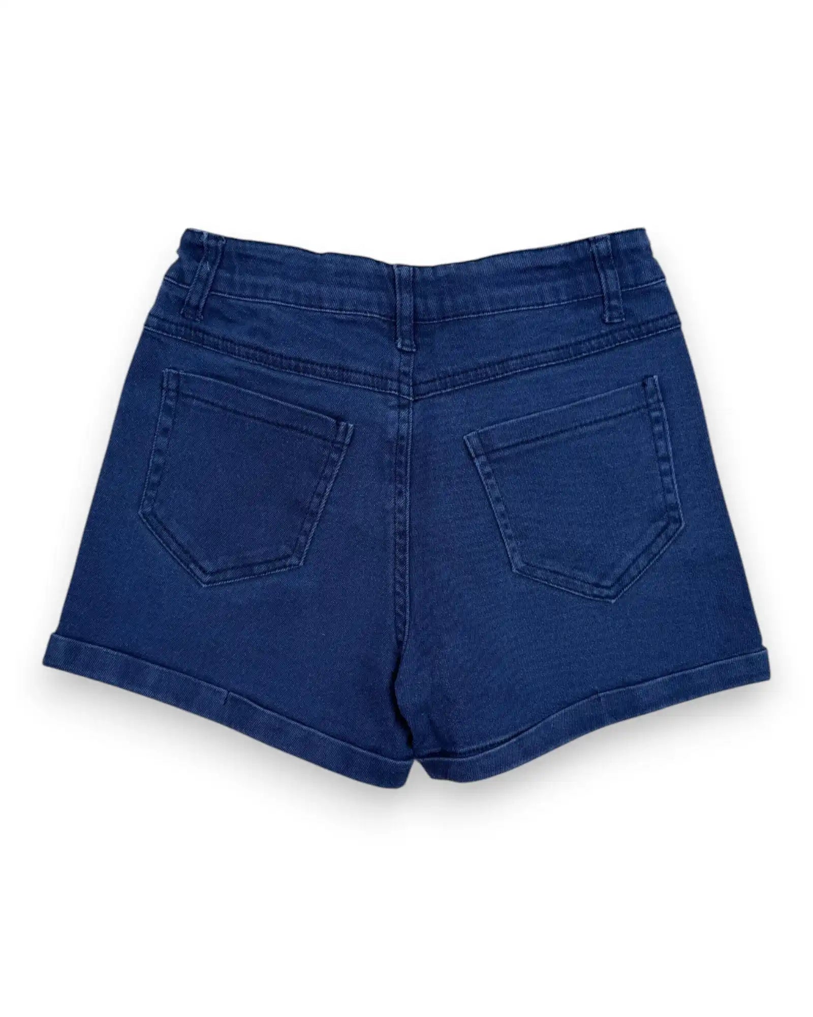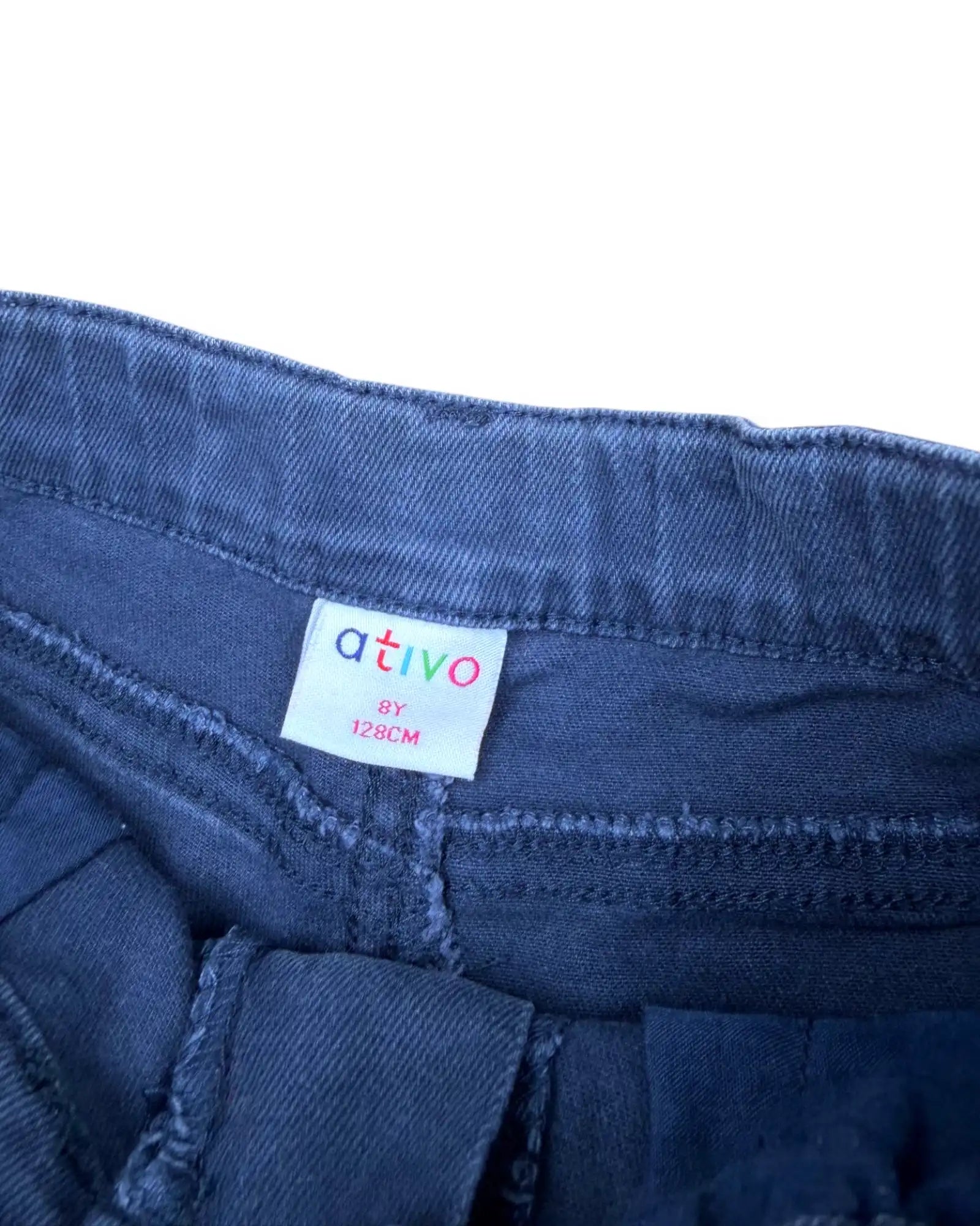 Altura: 128 cm. Calções de ganga elástica azul escura com ajuste interno na cintura.