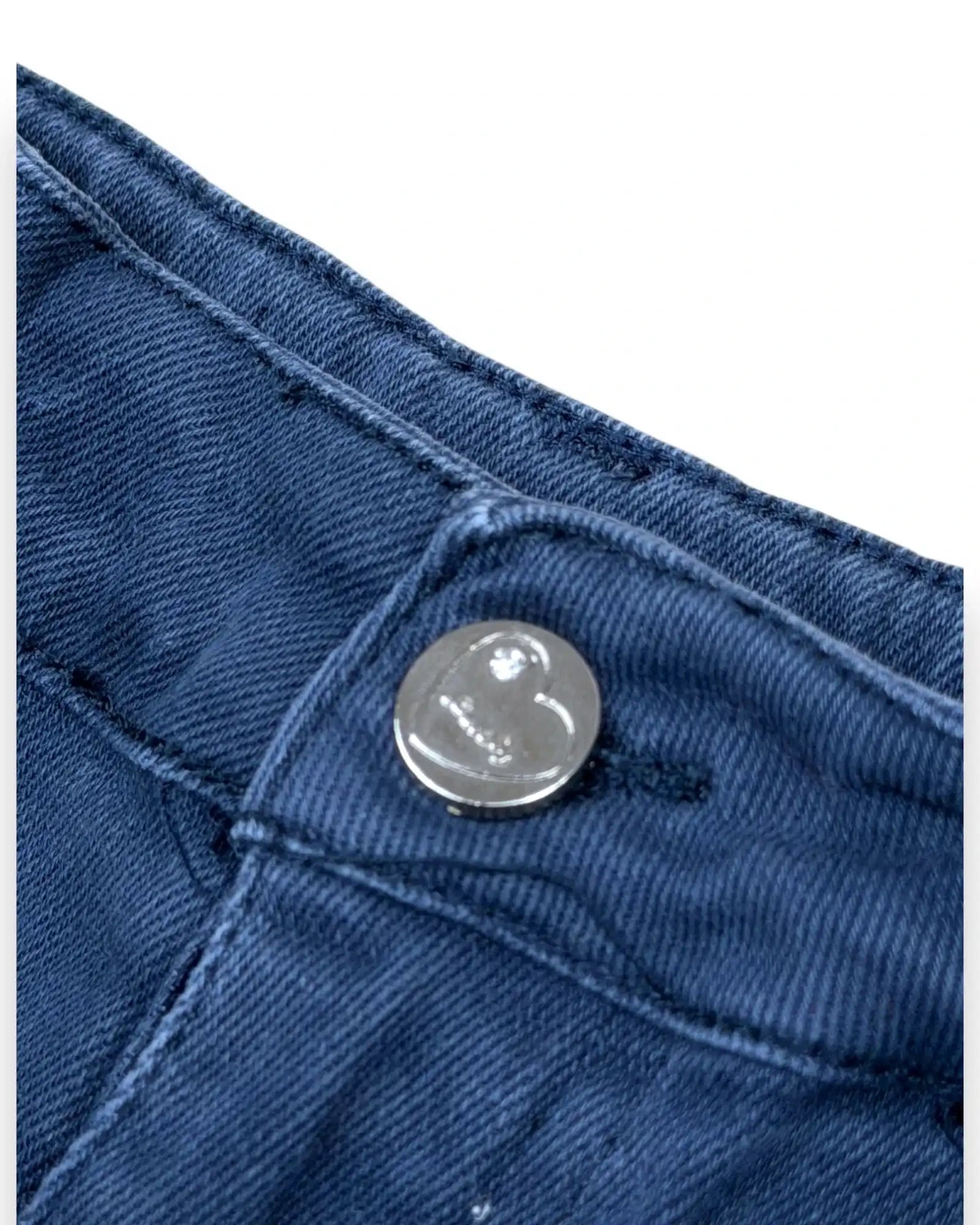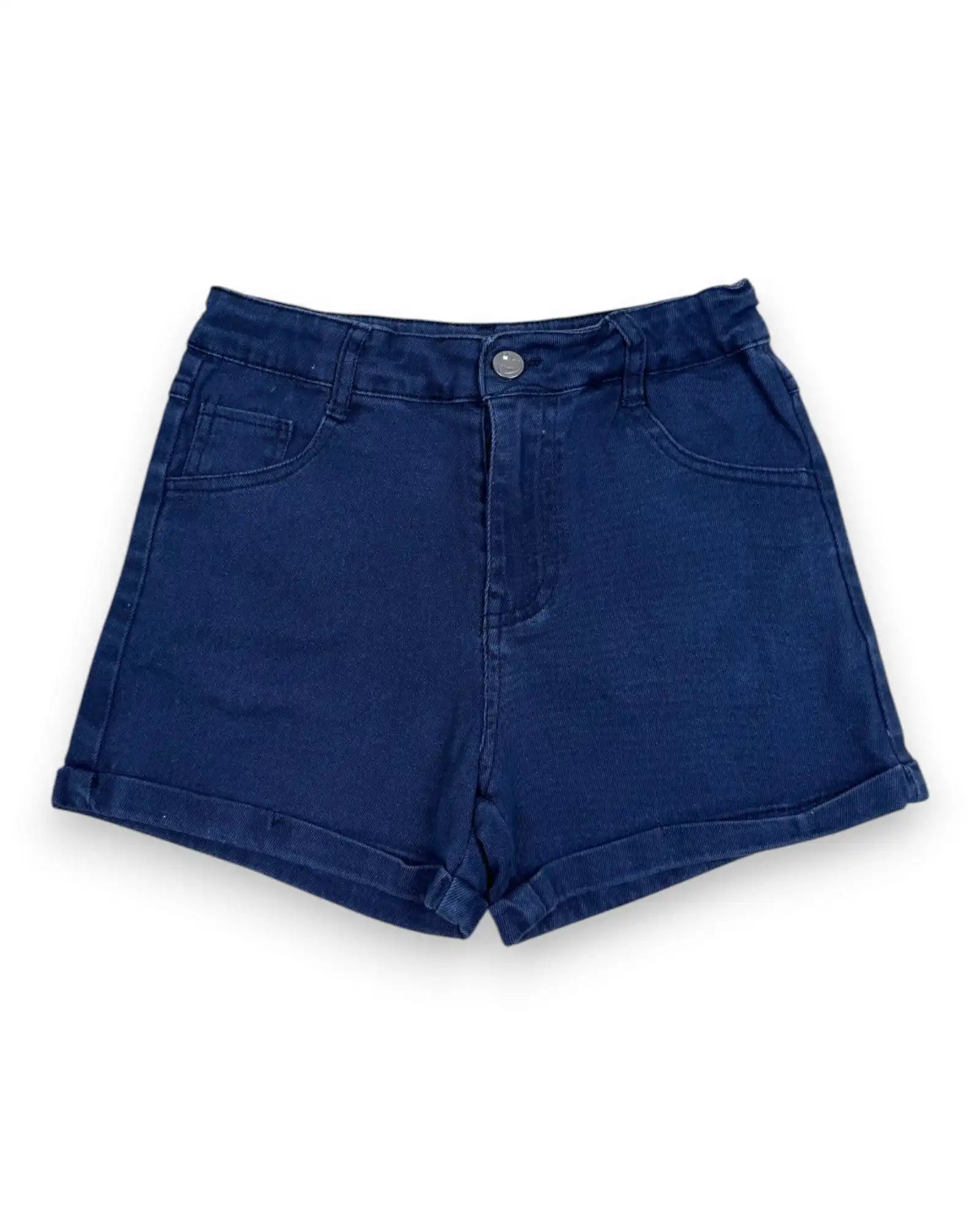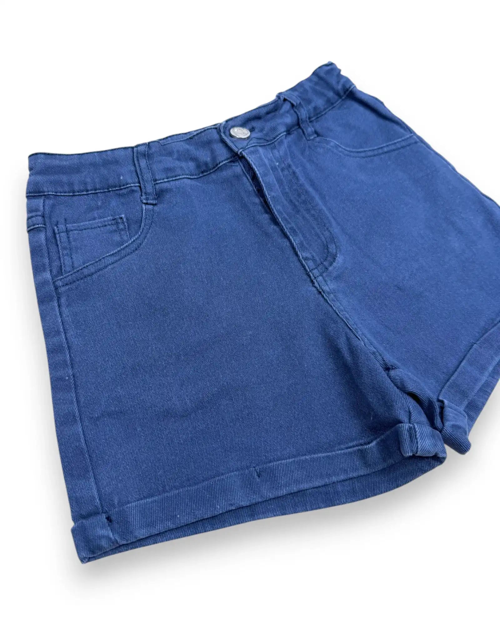 Altura: 128 cm. Calções de ganga elástica azul escura com ajuste interno na cintura.