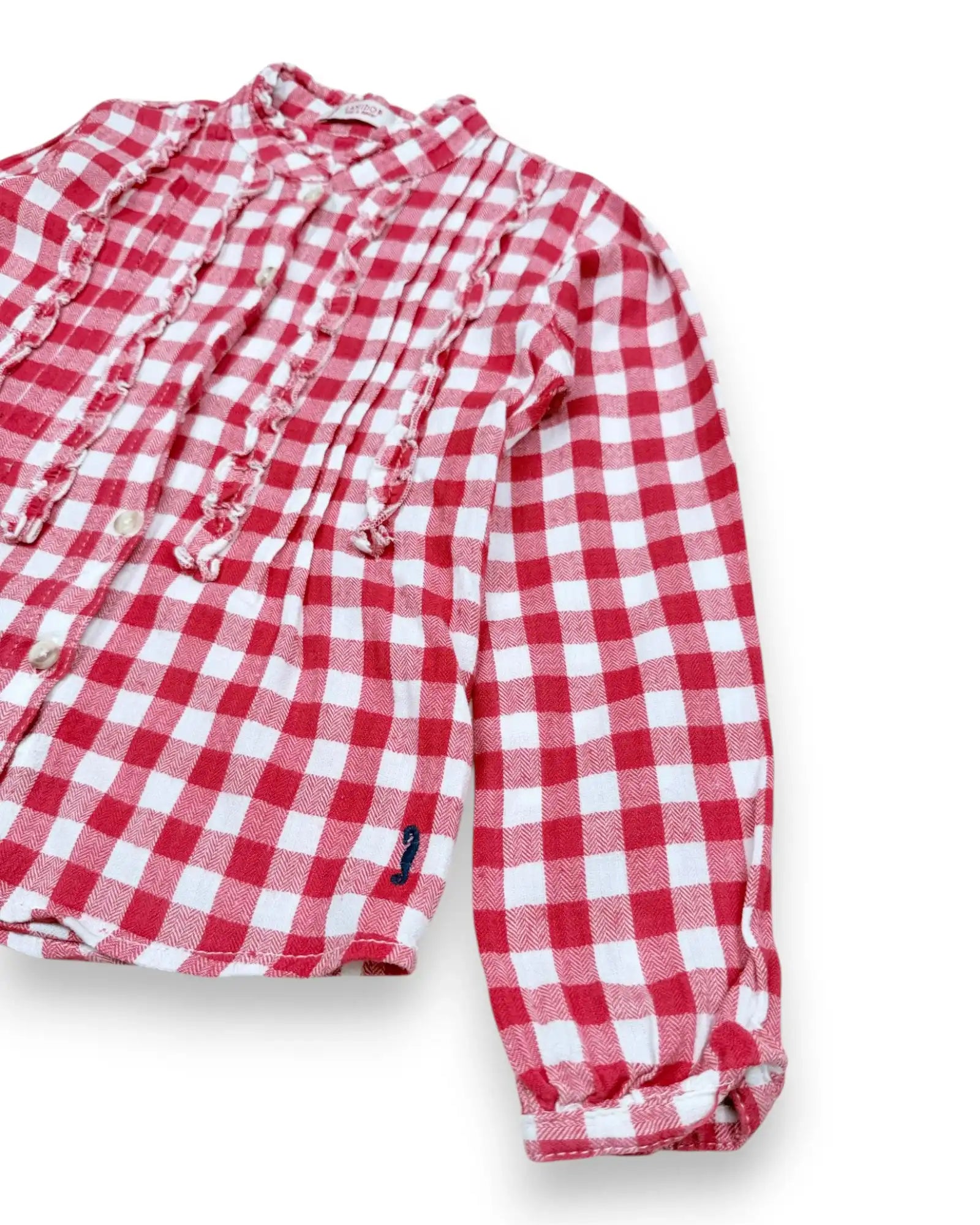 Altura: 102-114 cm. Camisa em xadrez vermelho com folhos na frente.