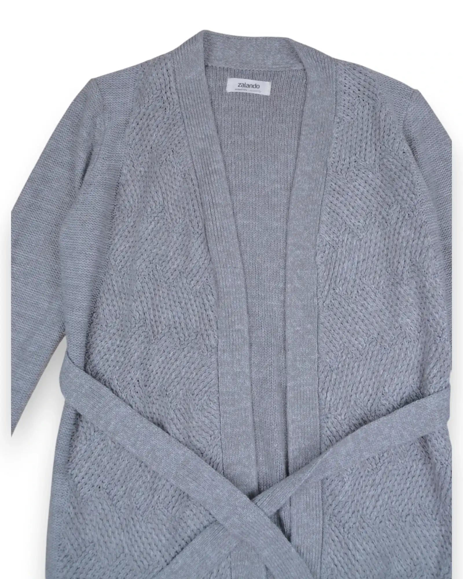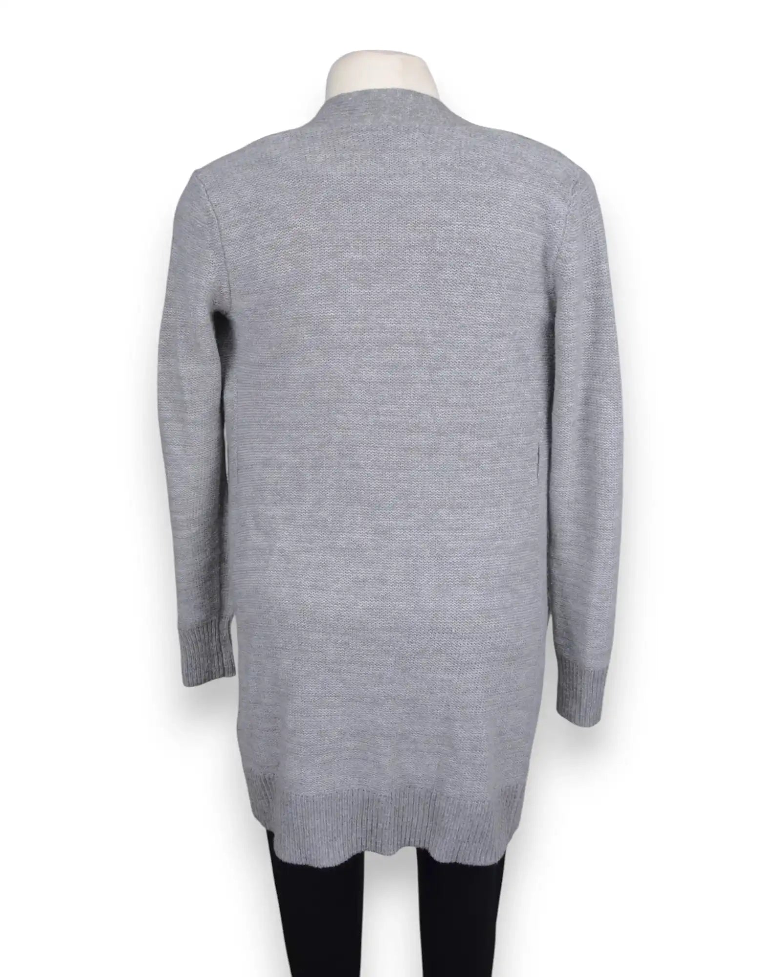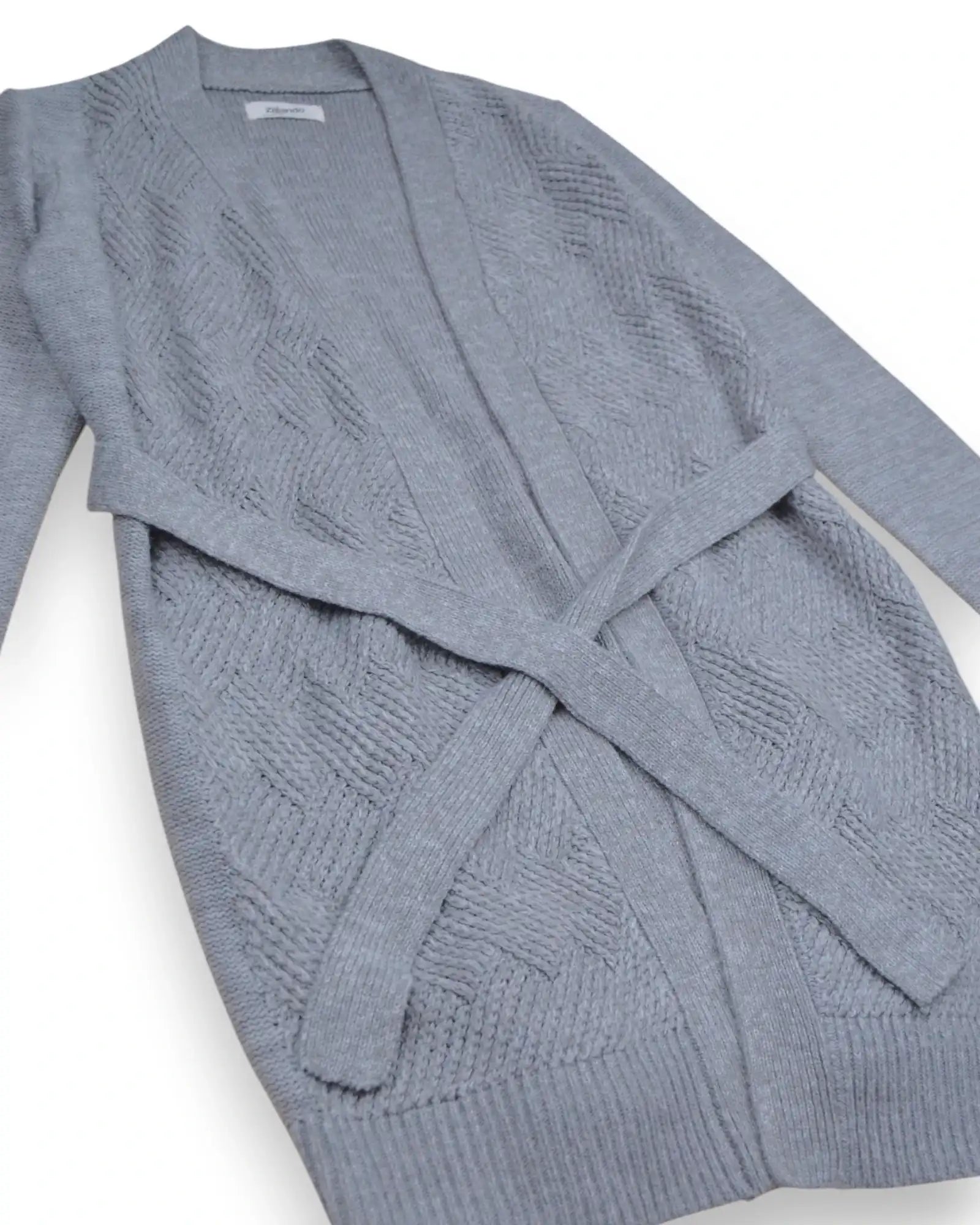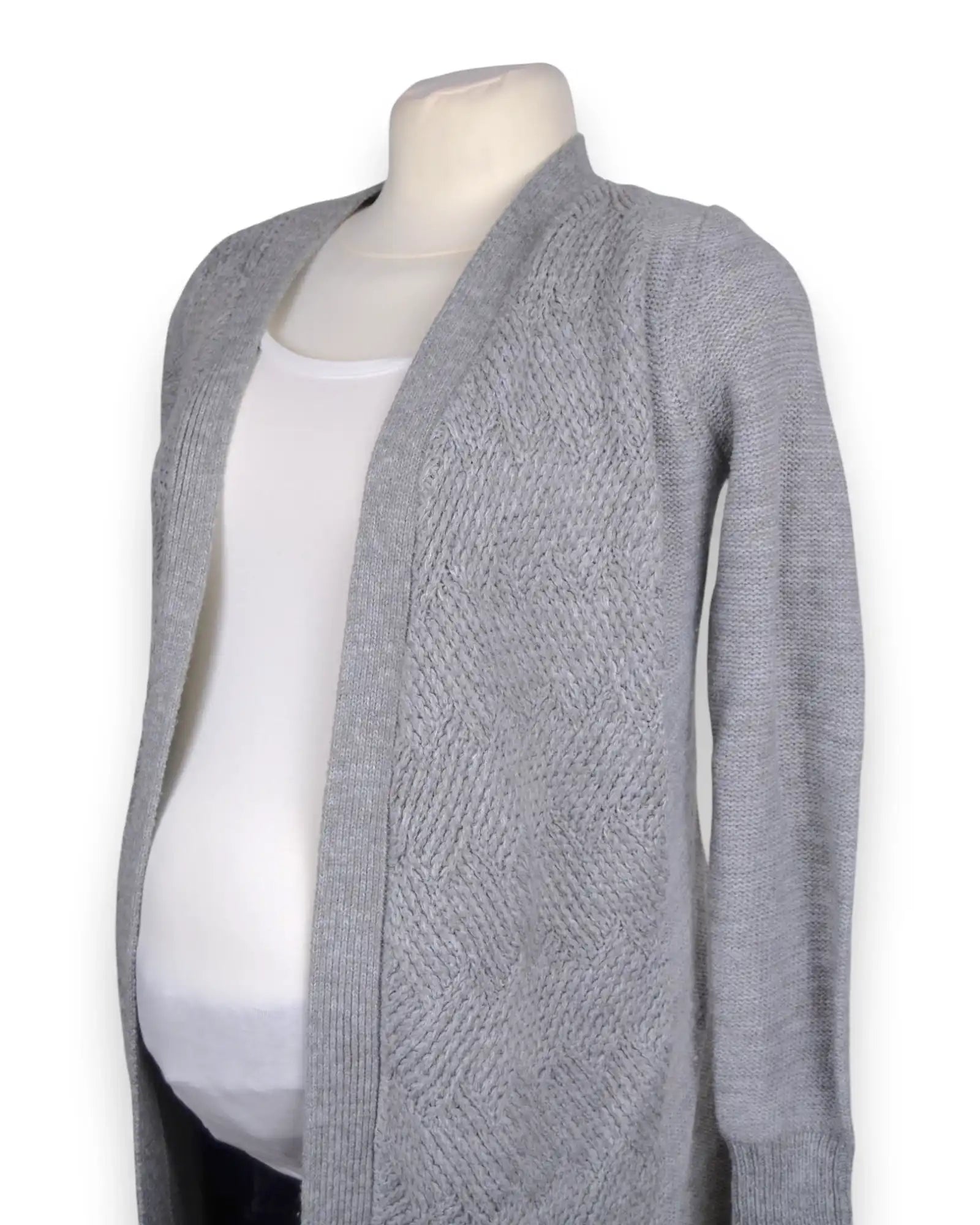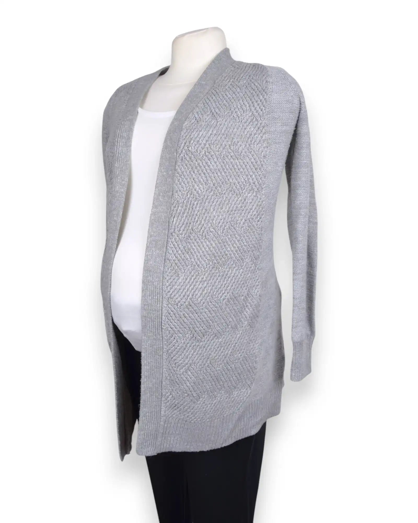 Casaco de malha cinzento, com cinto, para grávida.