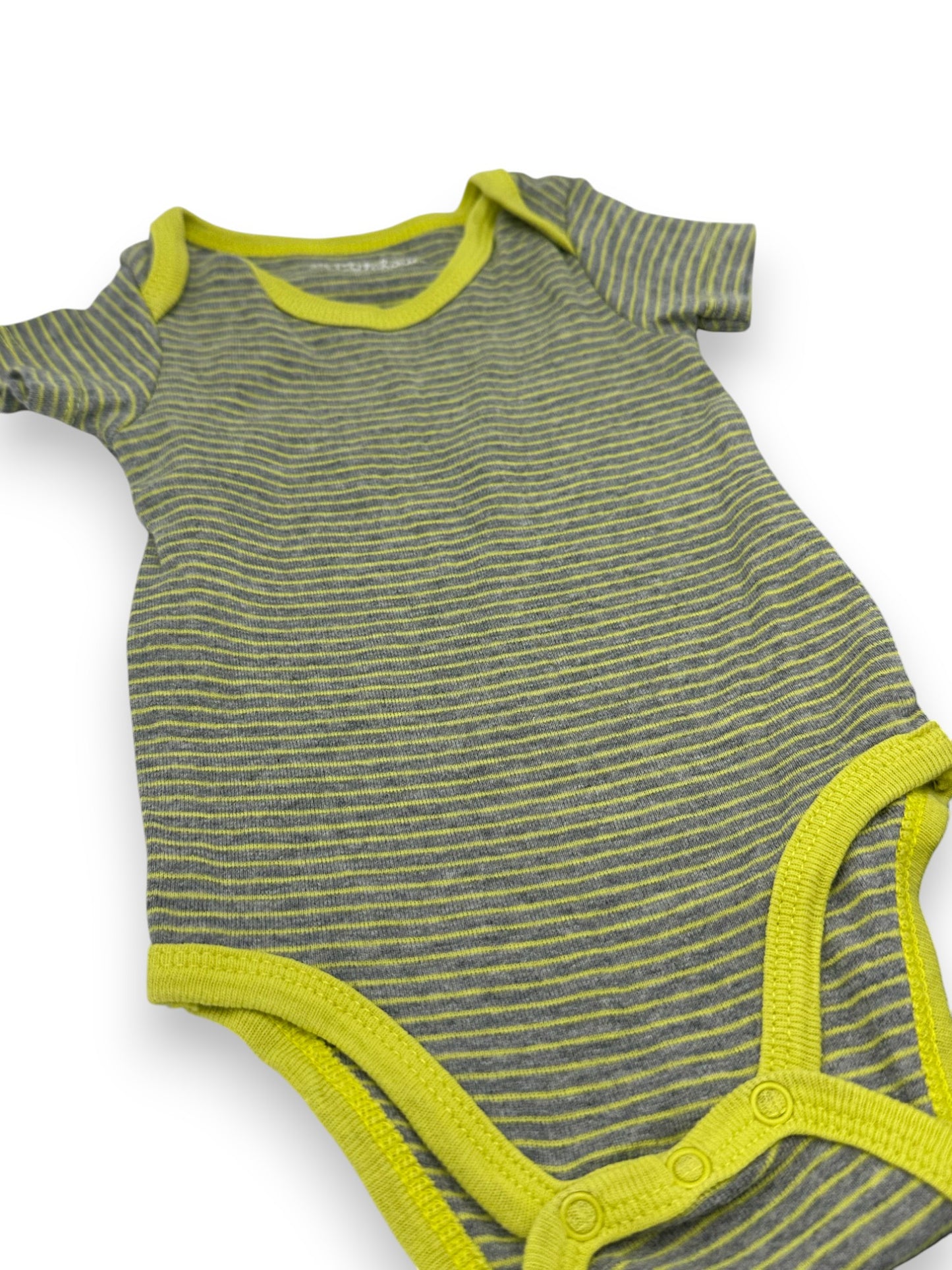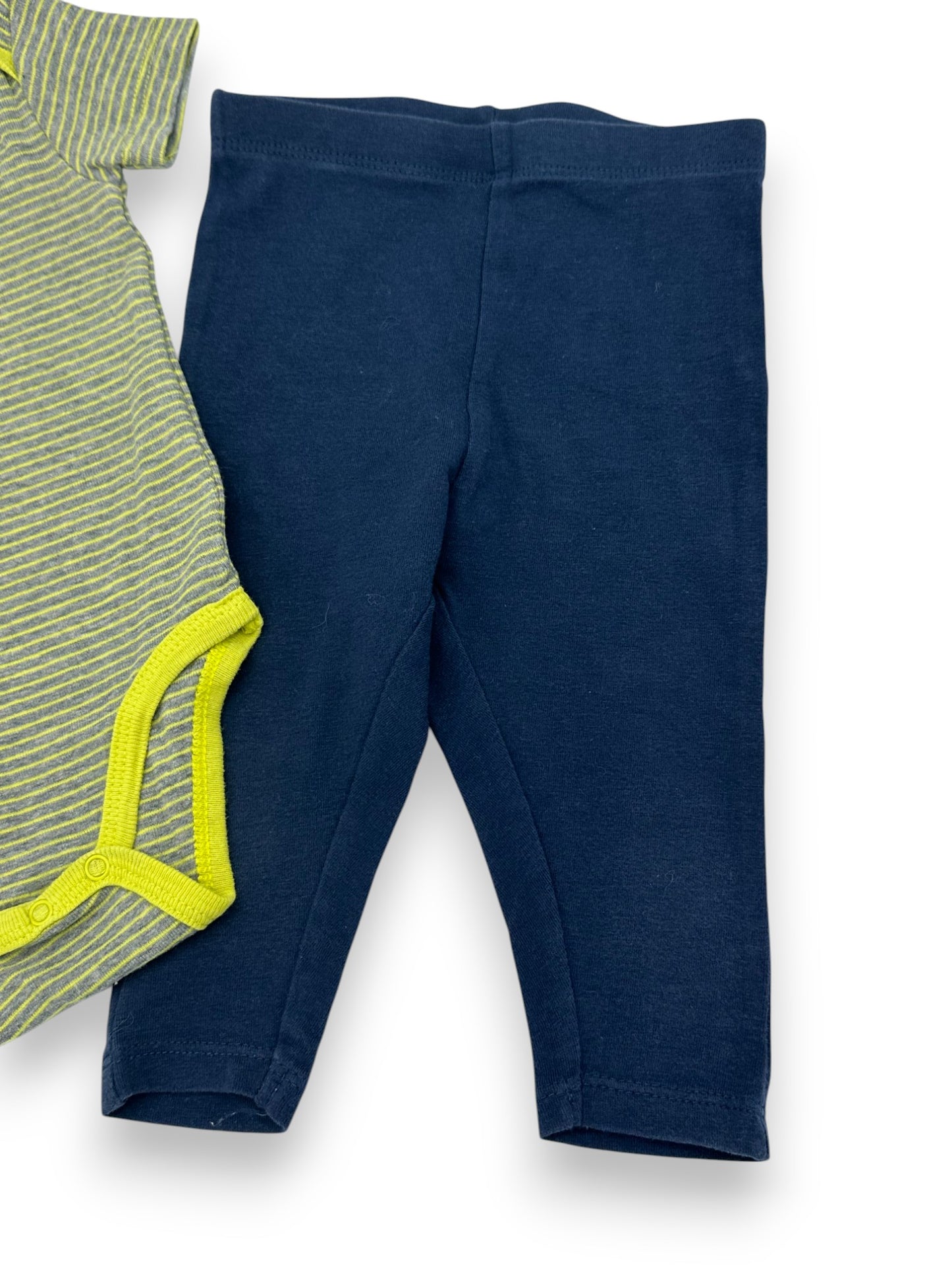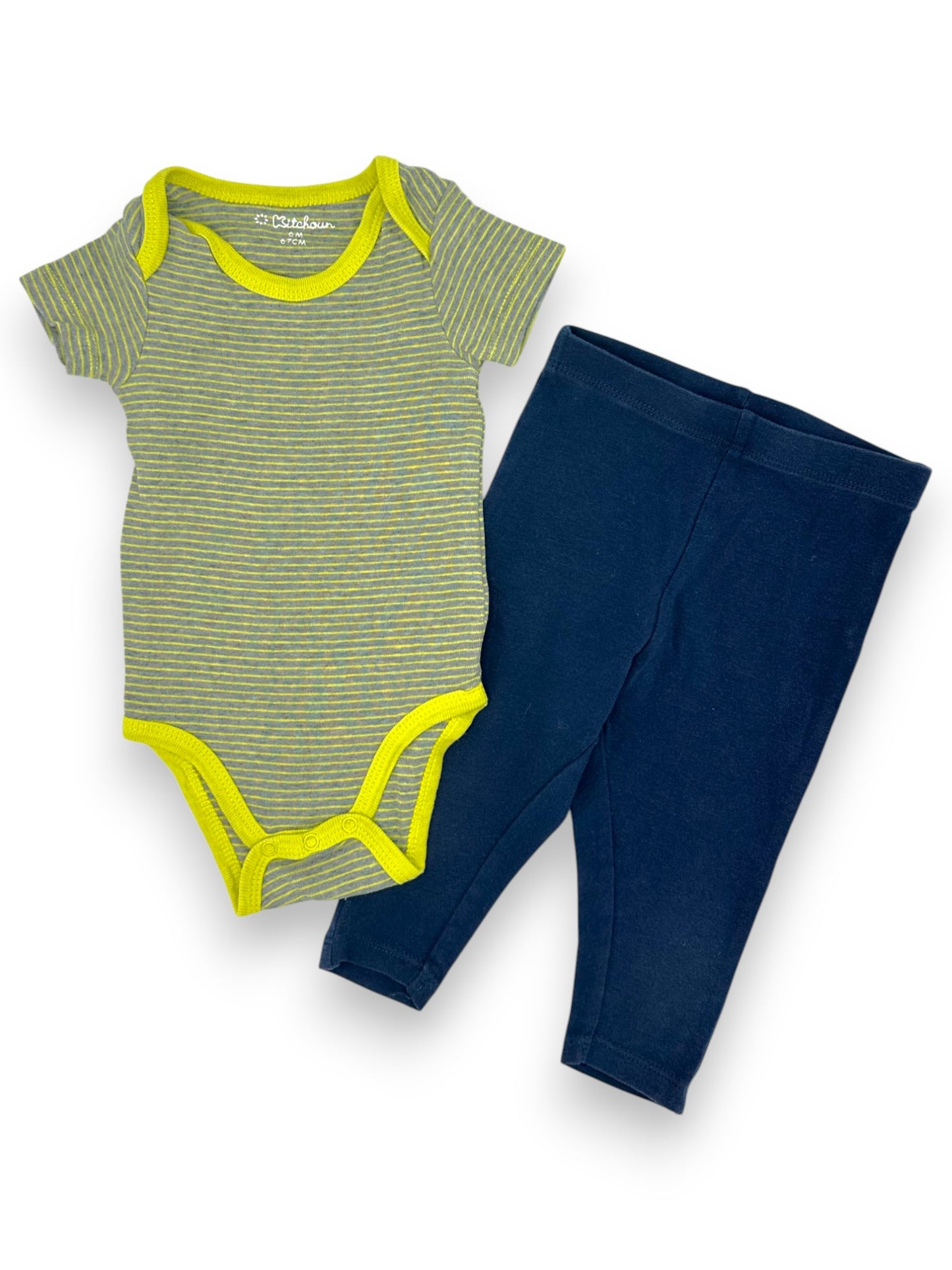 Conjunto composto por body riscas da marca Kitchoun (67 cm) e leggings azuis da marca BS (66-72 cm).