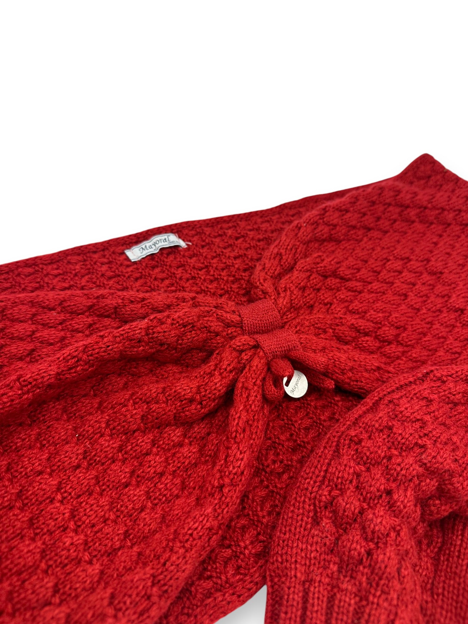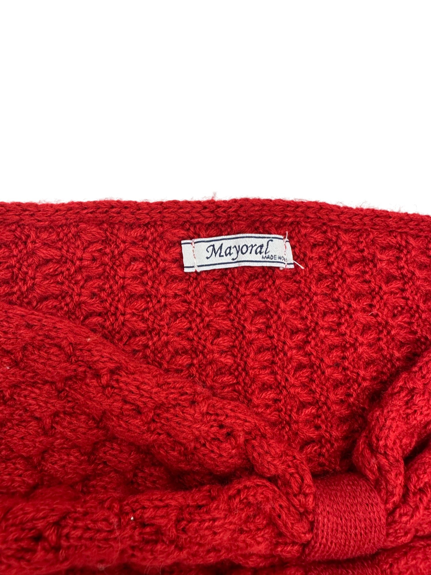 Conjunto composto por cachecol e gorro de malha vermelhos para menina, da marca Mayoral.