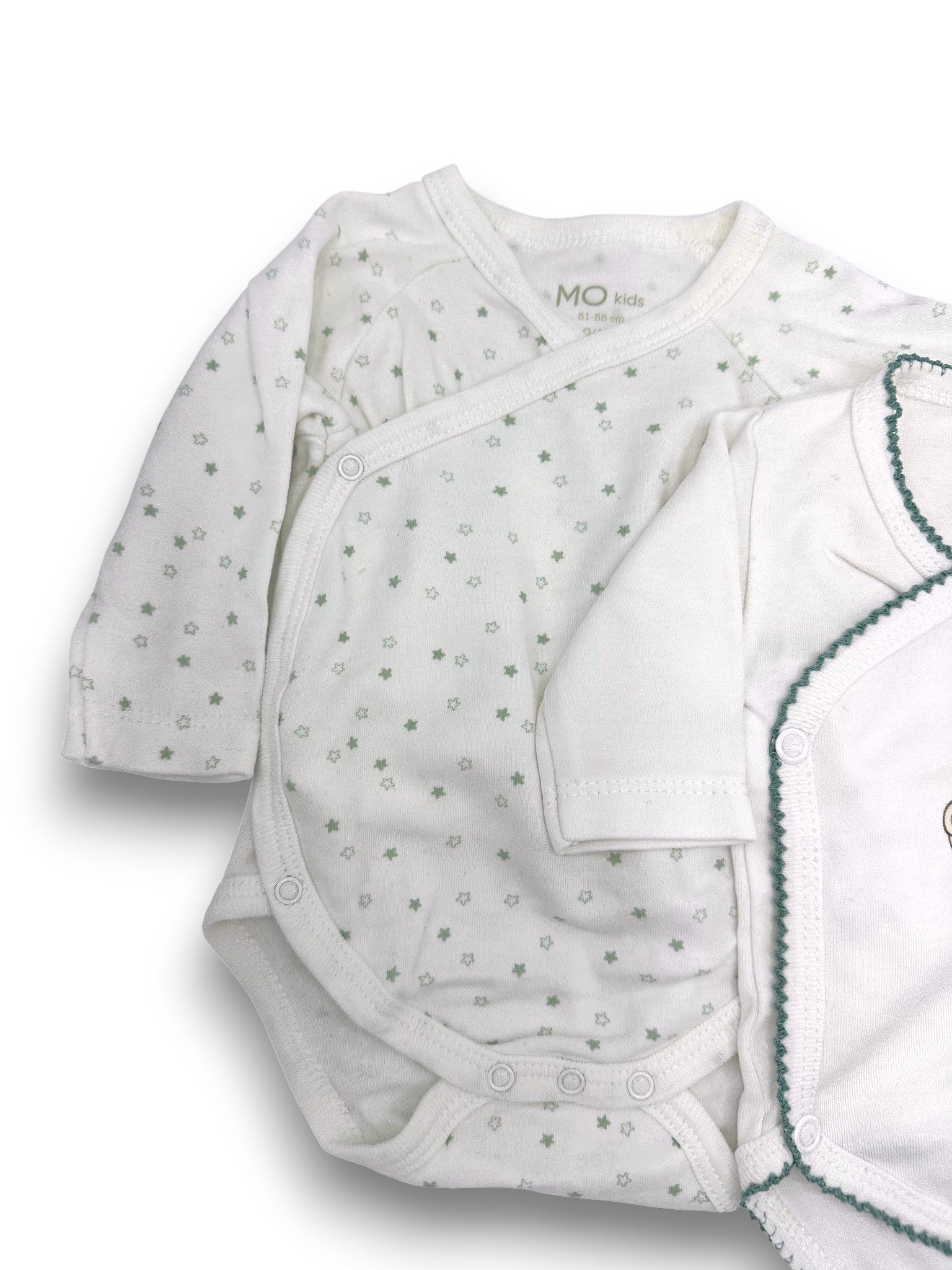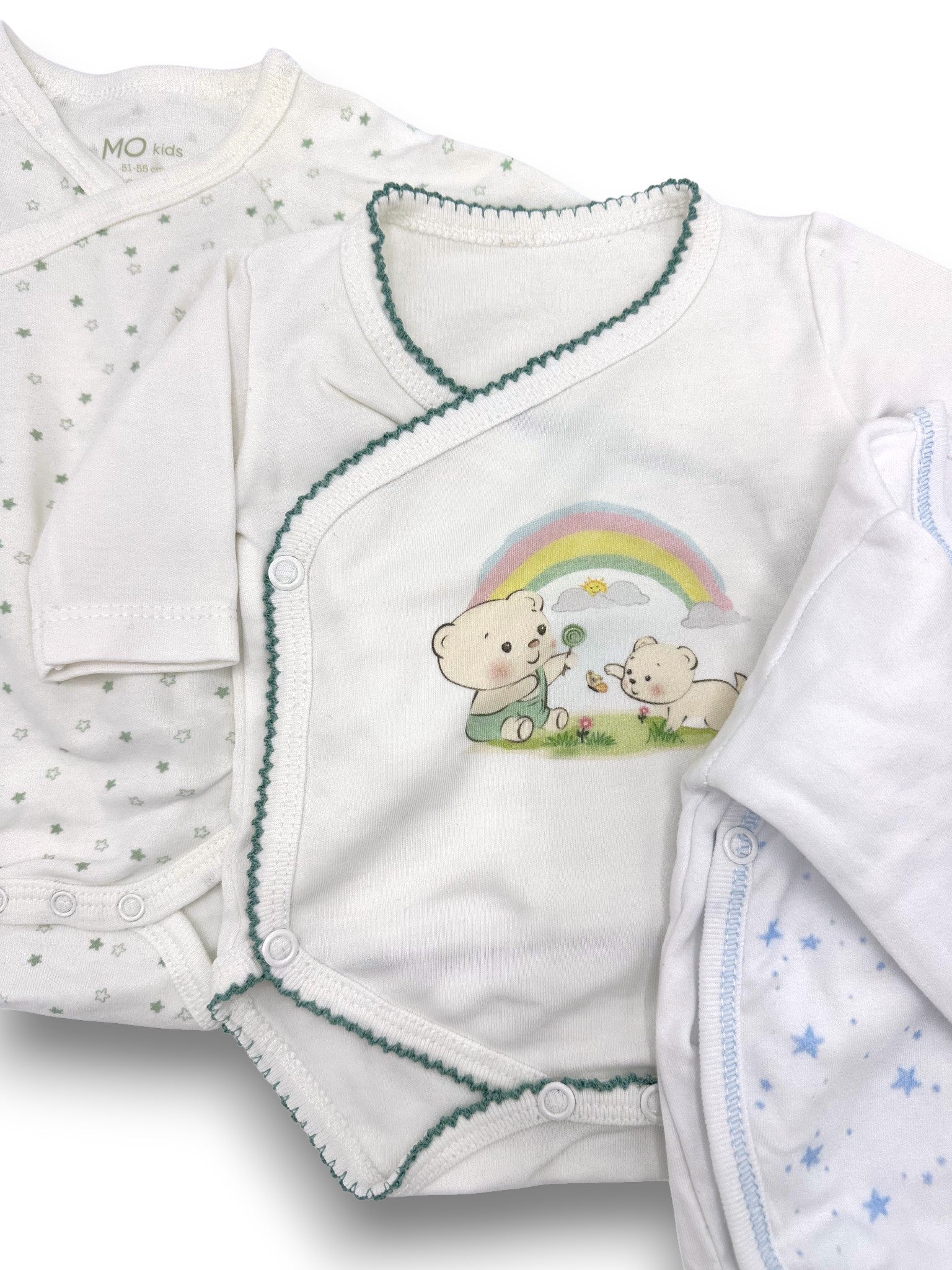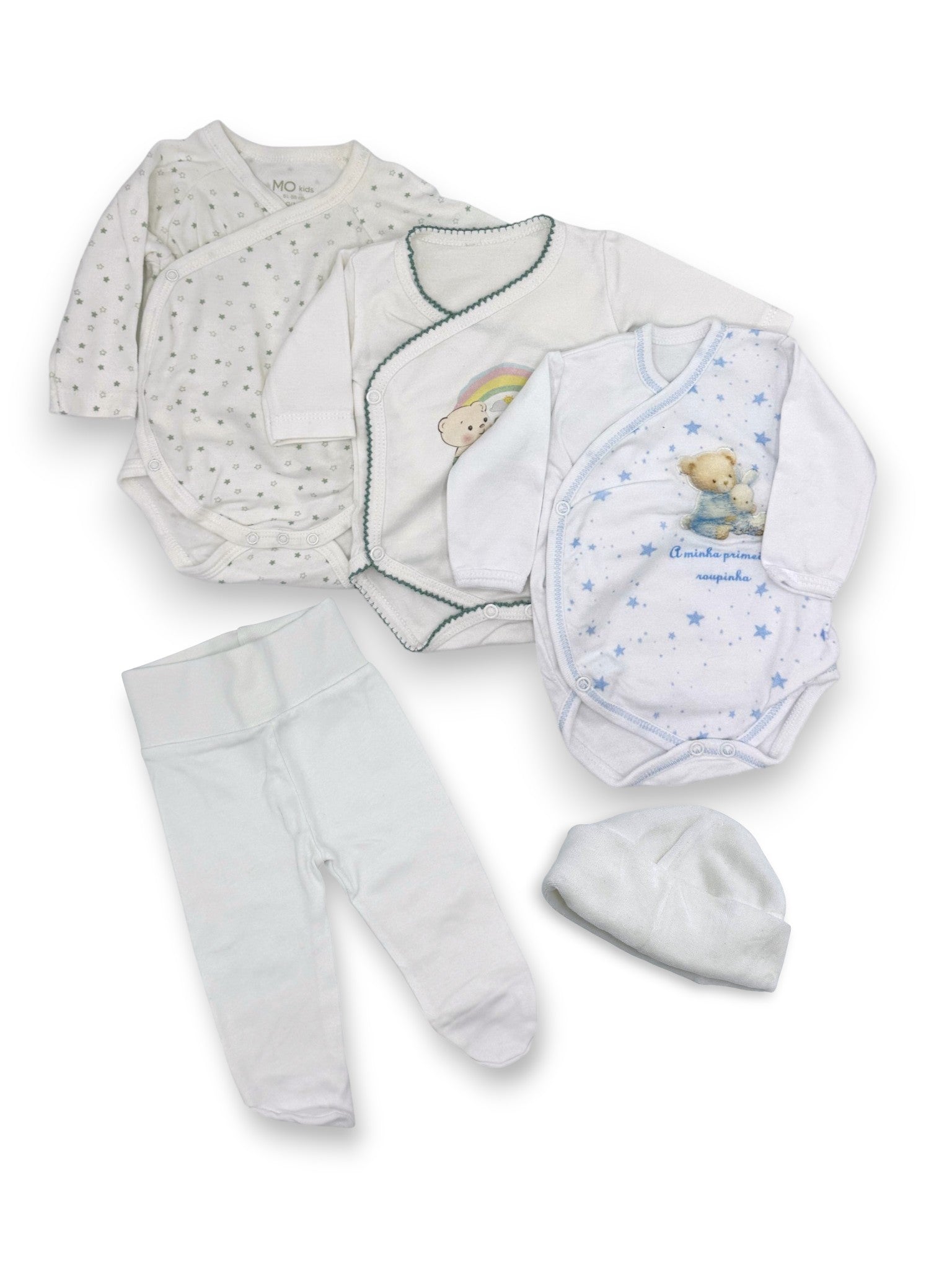 Conjunto para recém-nascido composto por 3 bodies de manga comprida, 1 calças e 1 gorro.