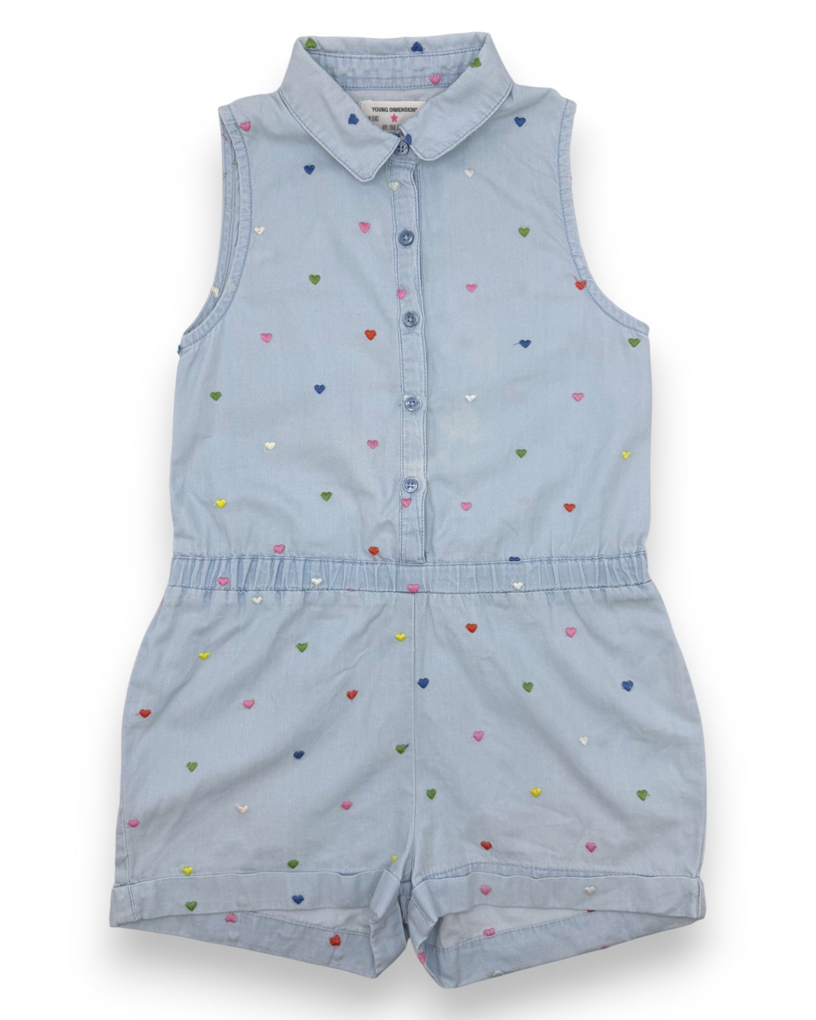 Macacão azul, curto, sem mangas, da marca Young Dimension.