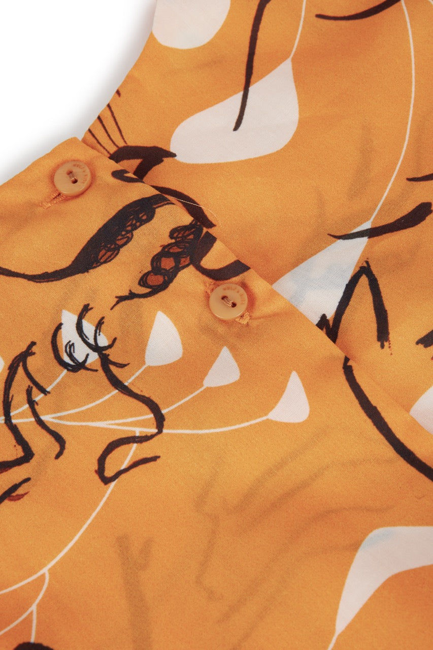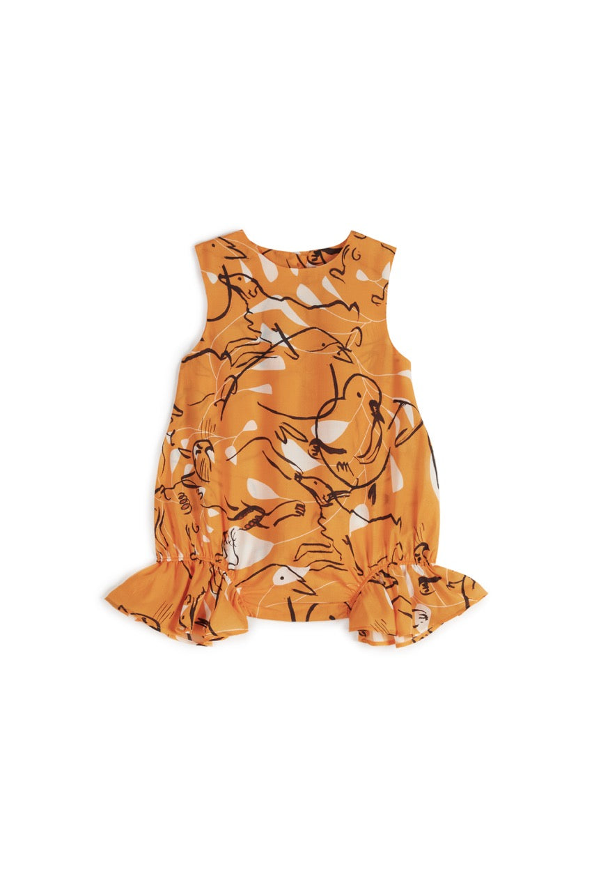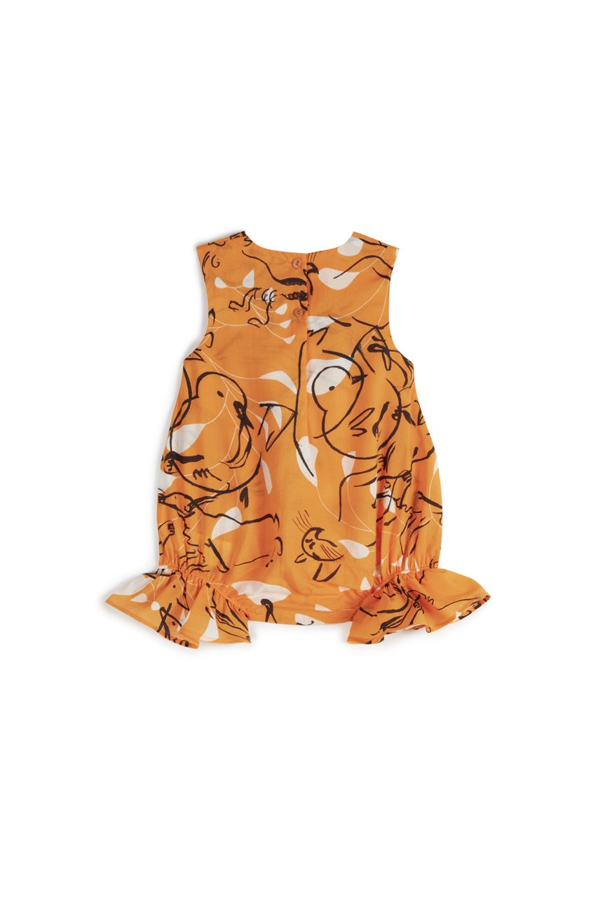 Macacão sem mangas em Tencel com folhos nas pernas, botão nas costas e botões de pressão entre as pernas, da Wolf & Rita.
