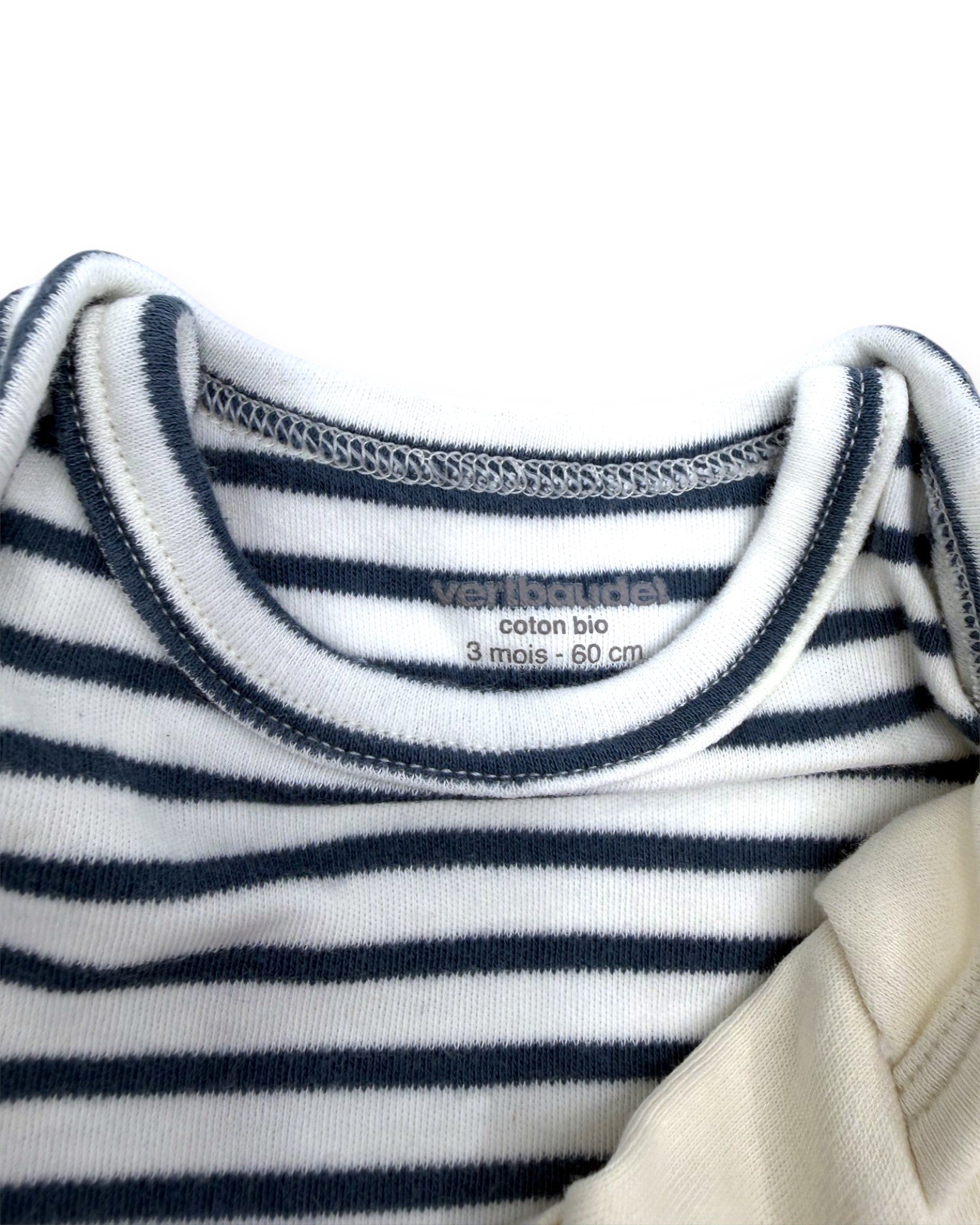 Pack com 3 bodies de manga curta, da marca Vertbaudet. De algodão orgânico. Dupla fila de molas de pressão entrepernas para se adaptar ao crescimento do bebé.