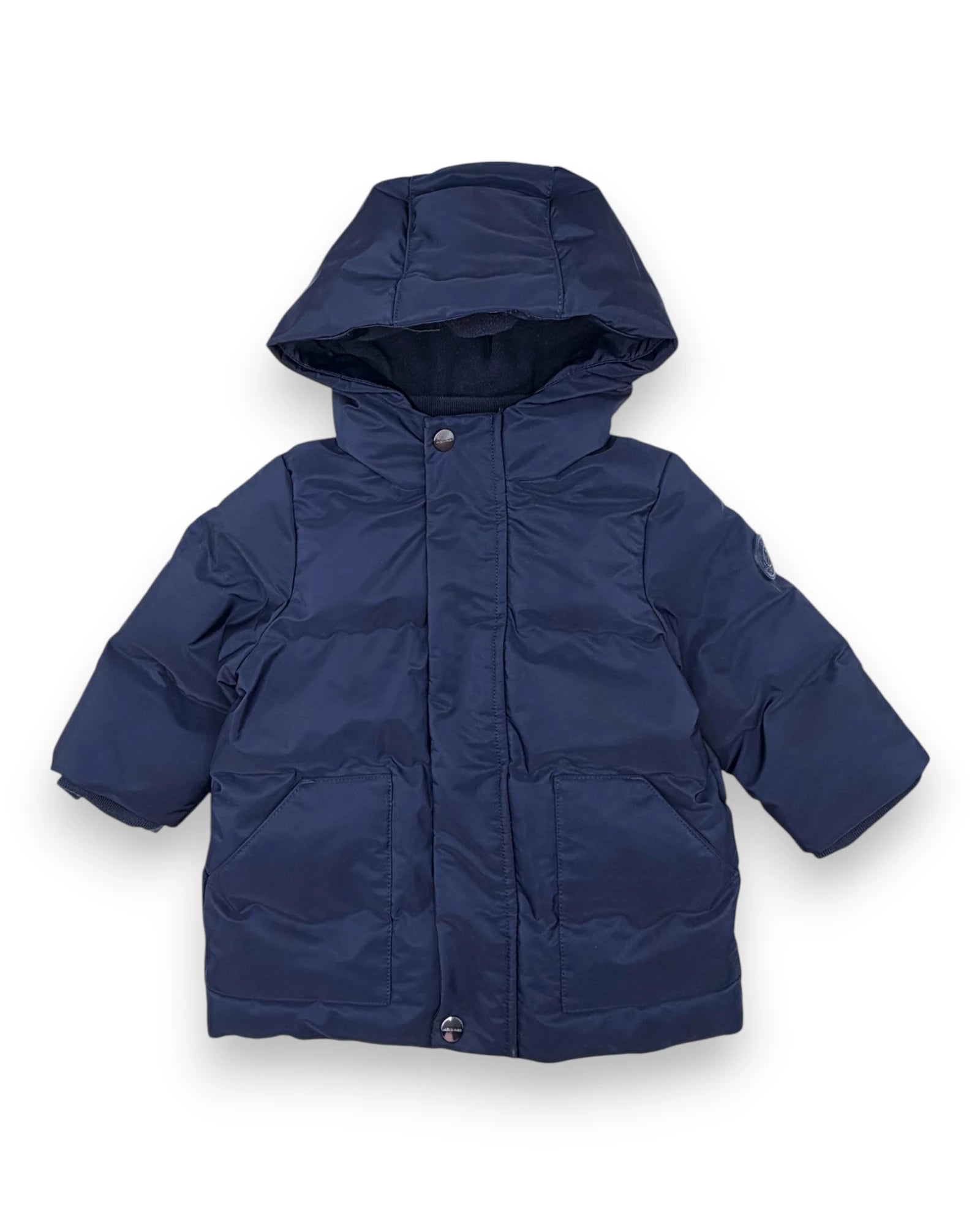 Parka acolchoada impermeável azul, com capuz e forro polar, da Jacadi.