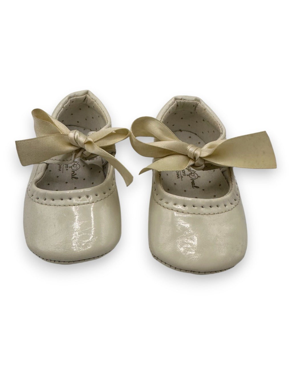 Sapatos de verniz em tom bege com fita de cetim, da marca Mayoral.