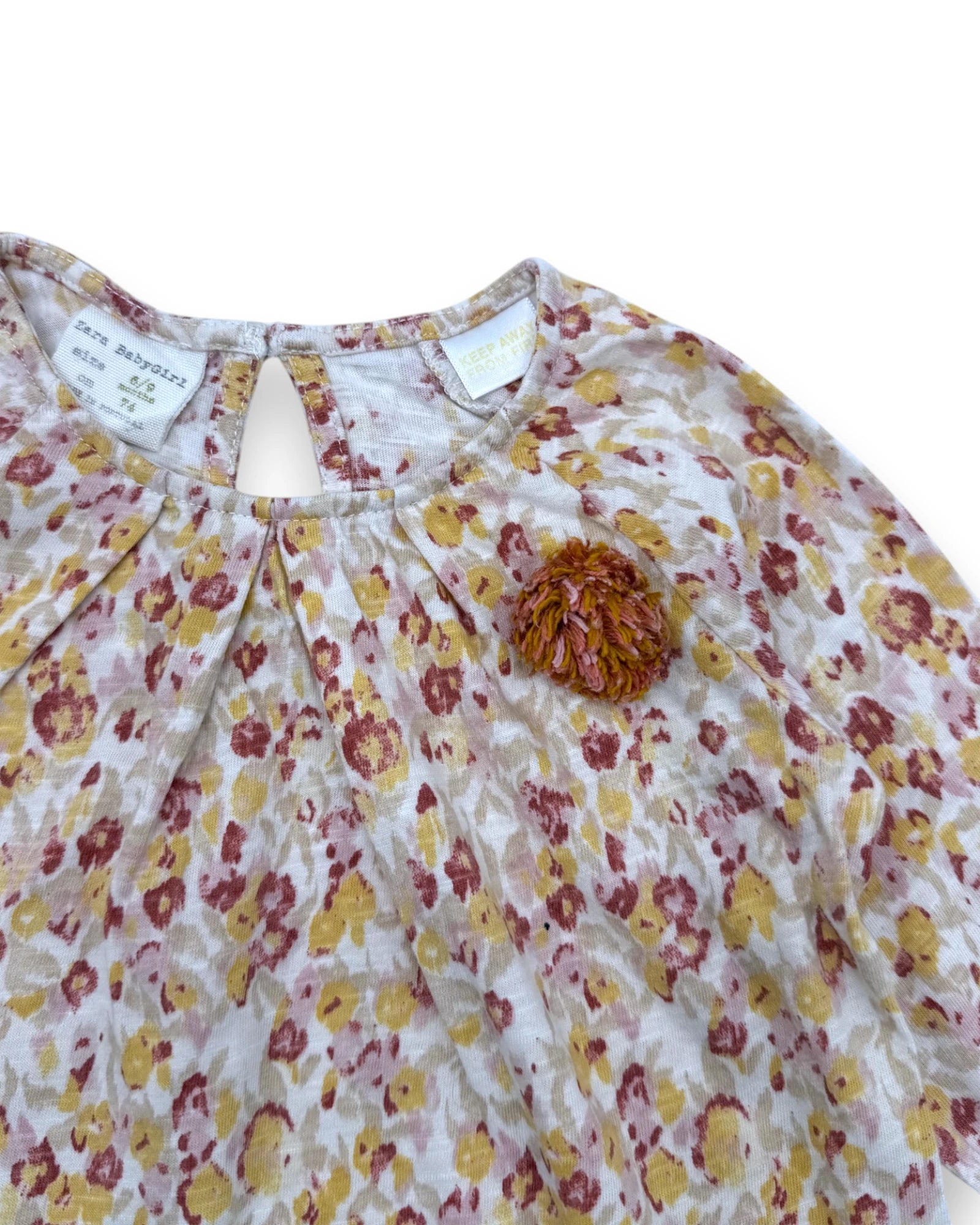 T-shirt com padrão floral, de mangas compridas, com pormenor de pompom, da Zara.