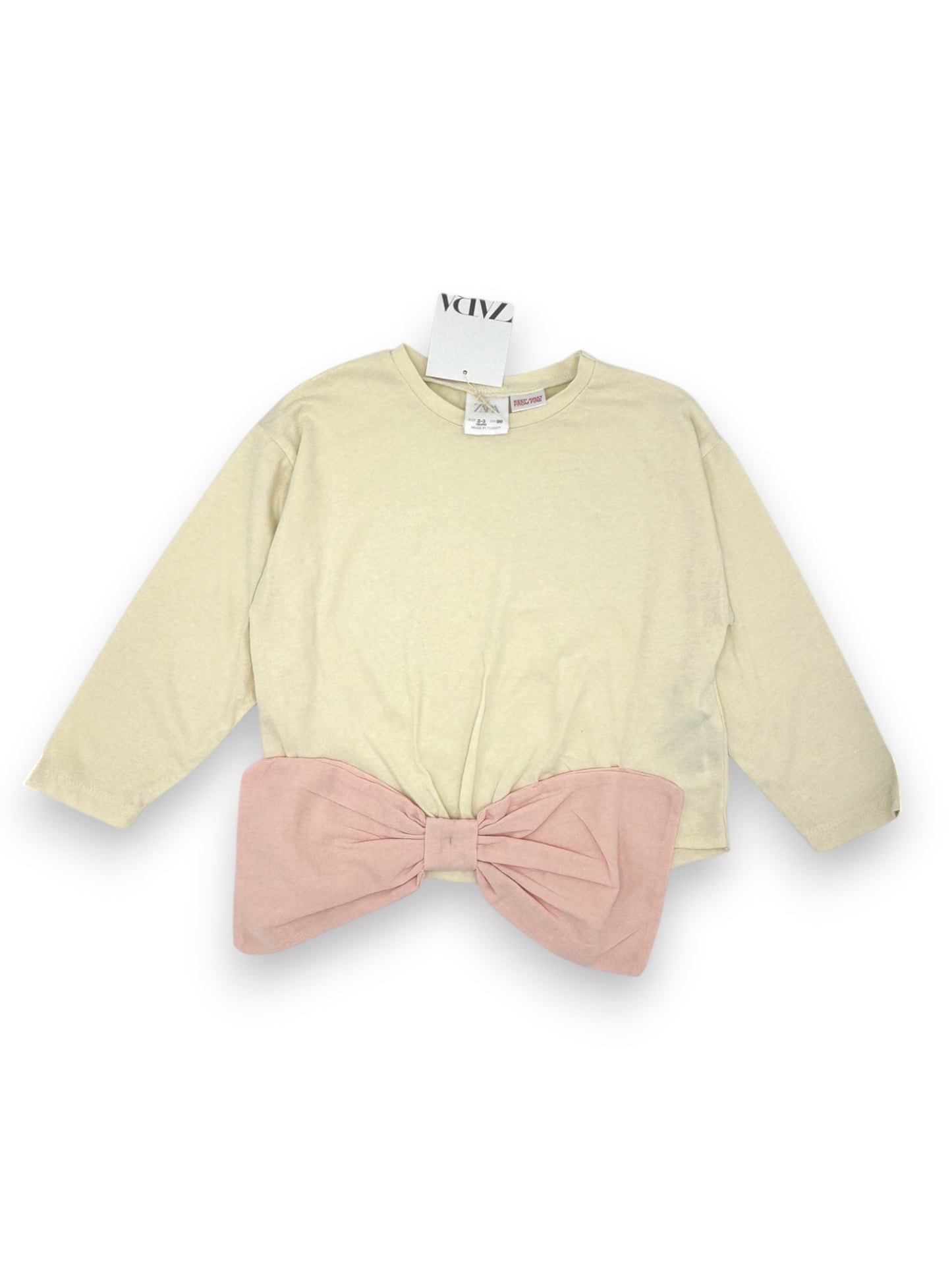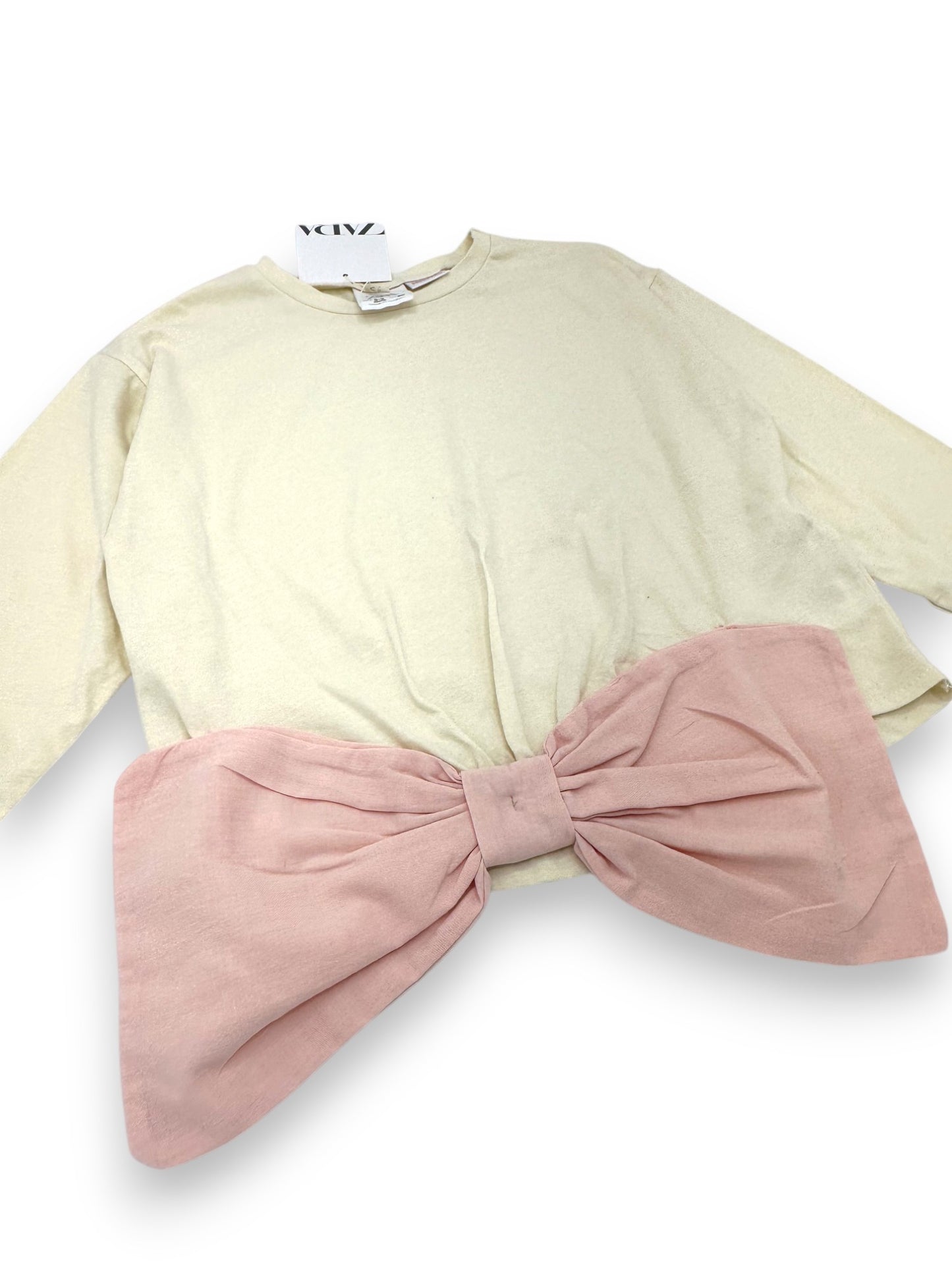 T-shirt de mangas compridas em tom amarelo claro, com laço oversize rosa no fundo, da Zara.