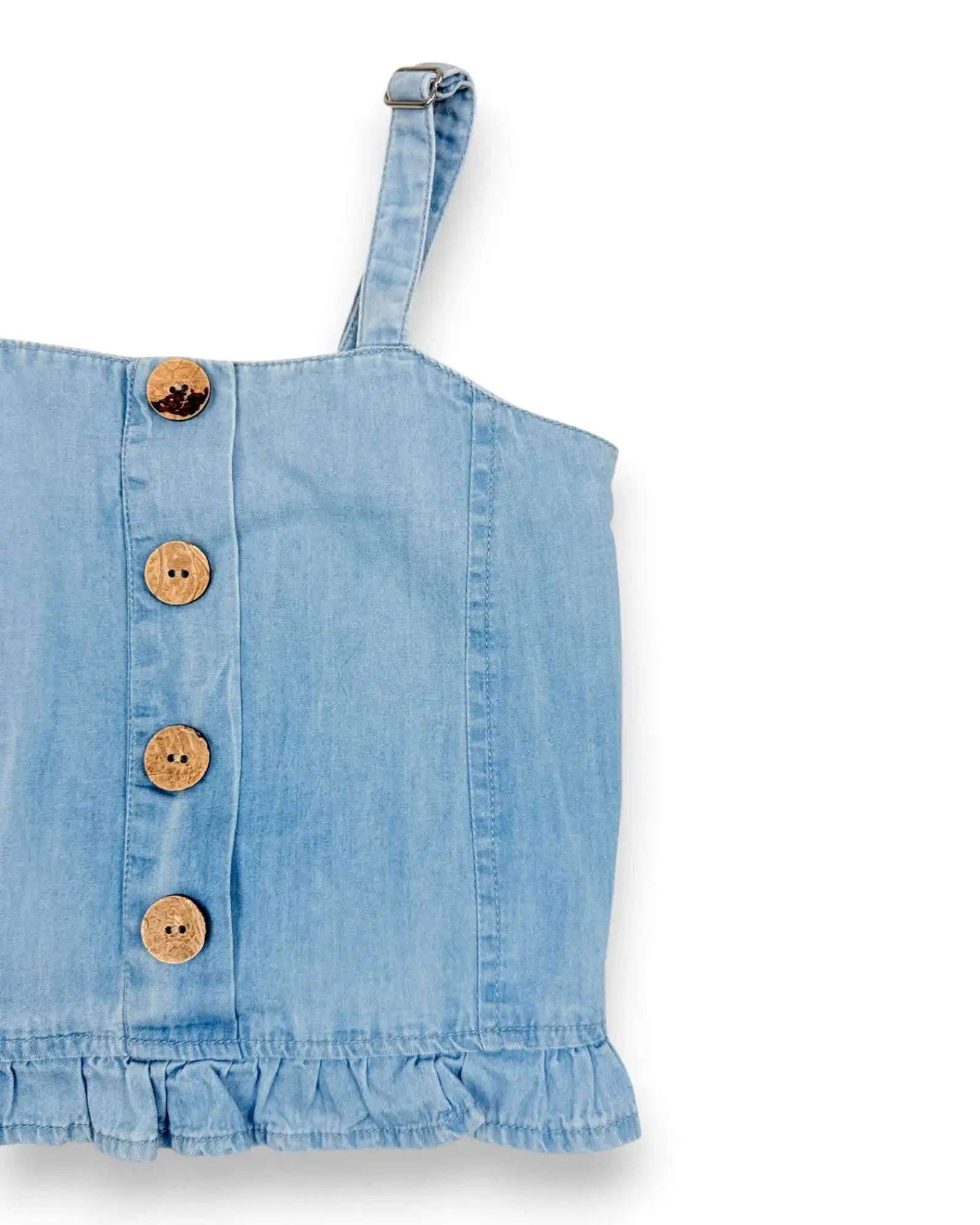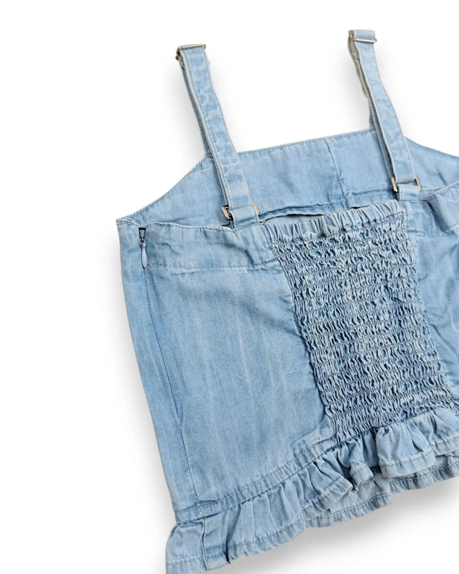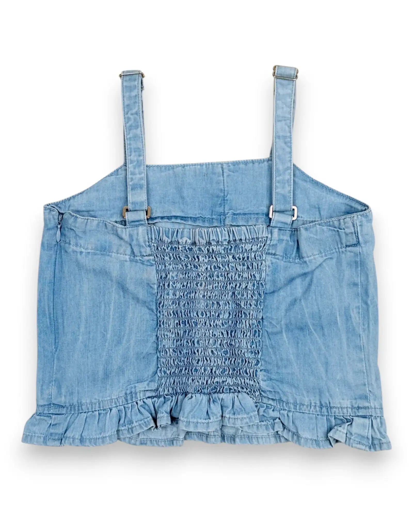 Altura: 116 cm. Top curto de alças em ganga azul. Costas elásticas e alças ajustáveis.