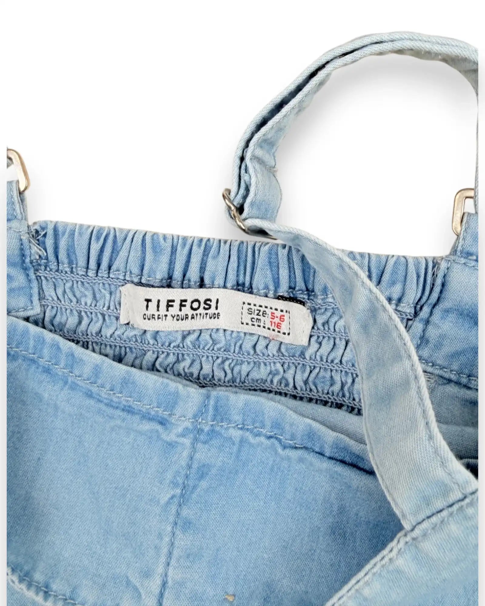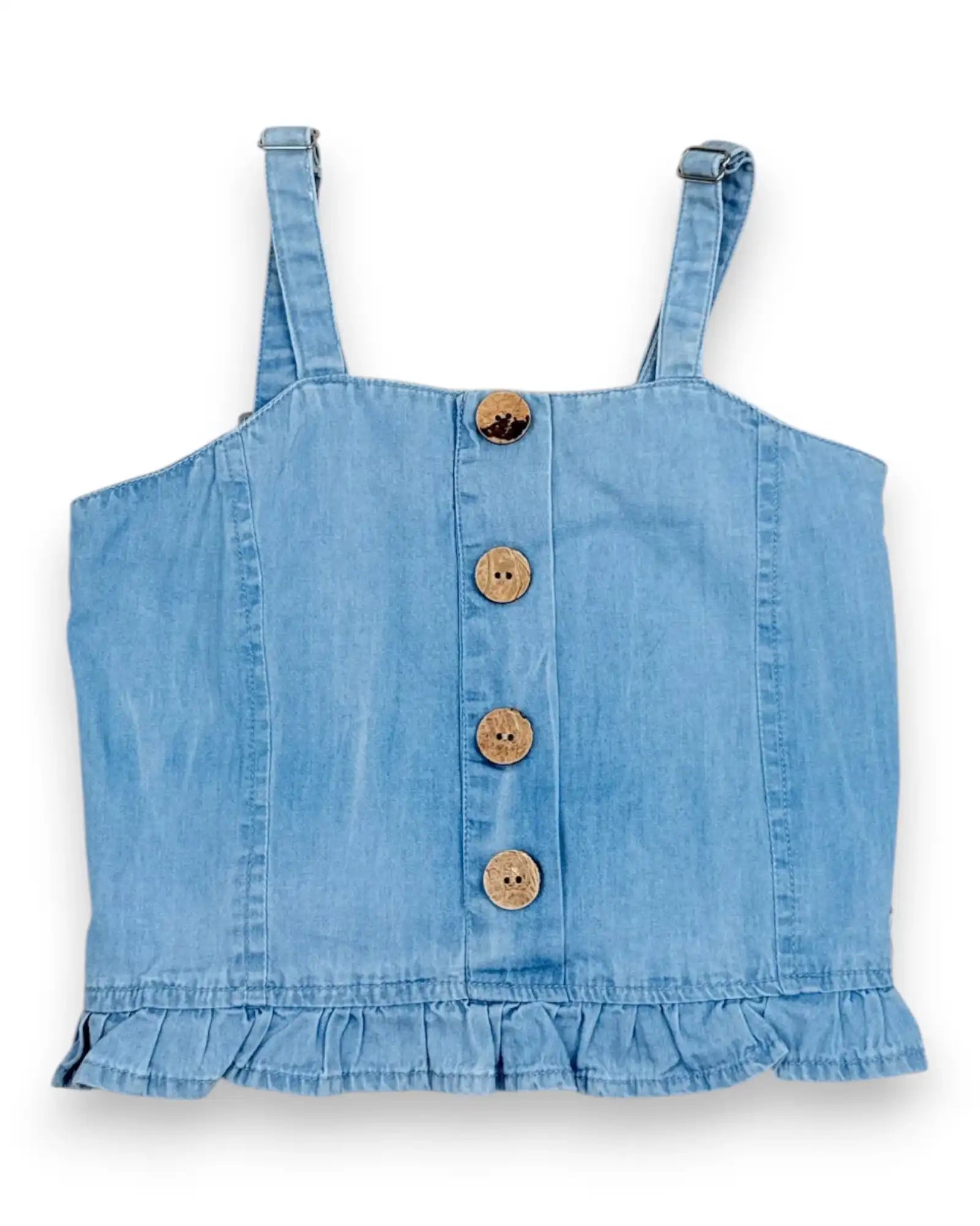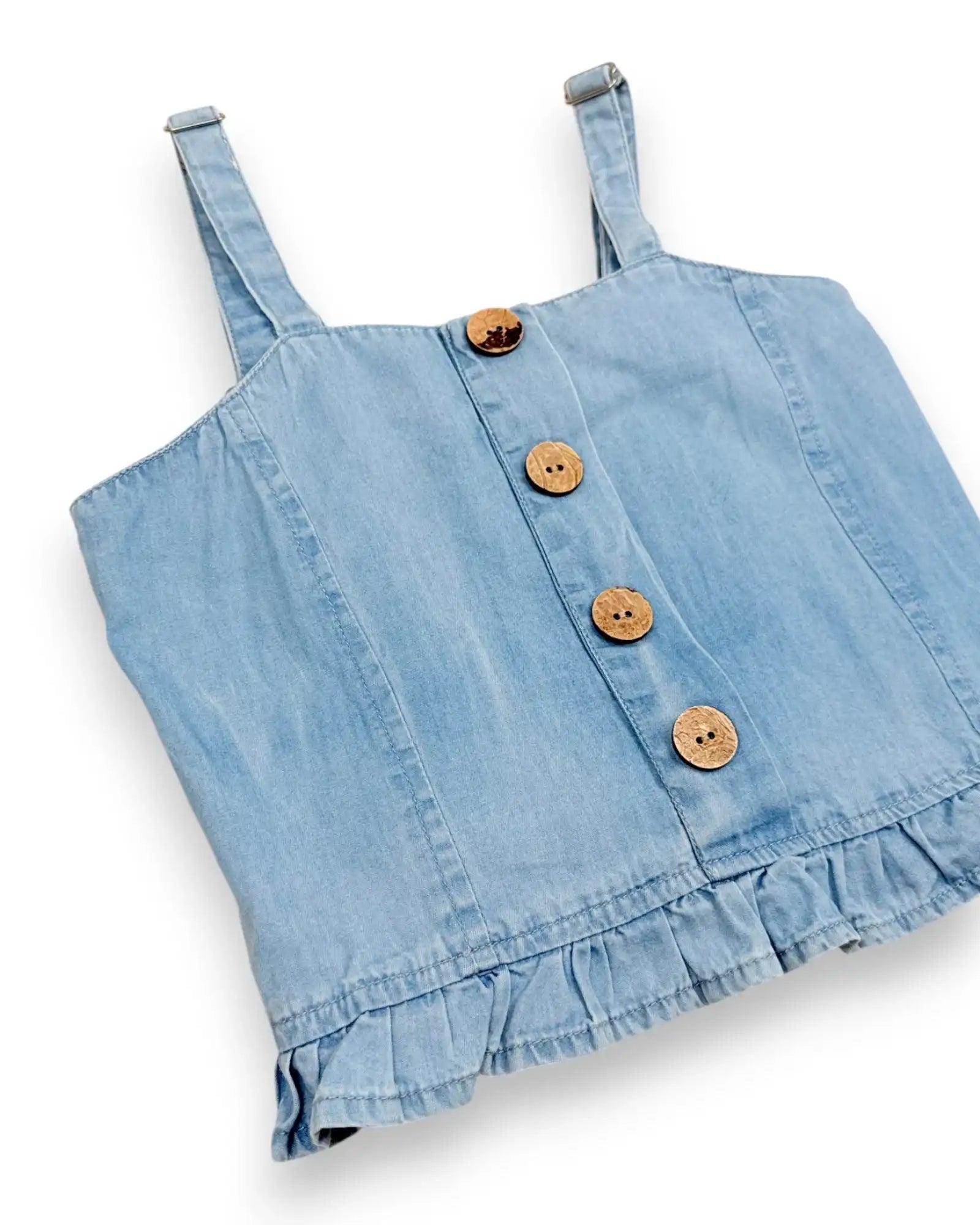 Altura: 116 cm. Top curto de alças em ganga azul. Costas elásticas e alças ajustáveis.
