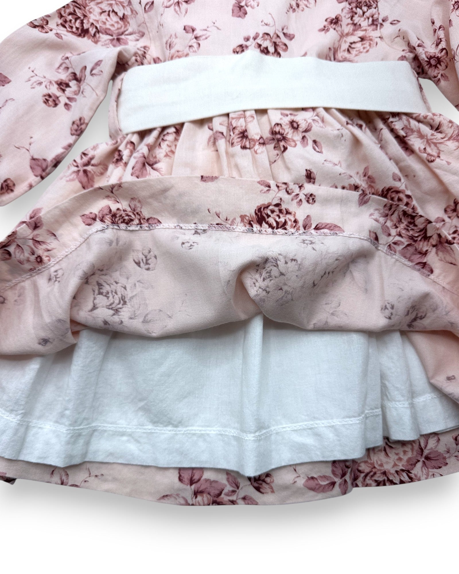Vestido rosa com padrão floral, gola bordada, forro em algodão e cinto.
