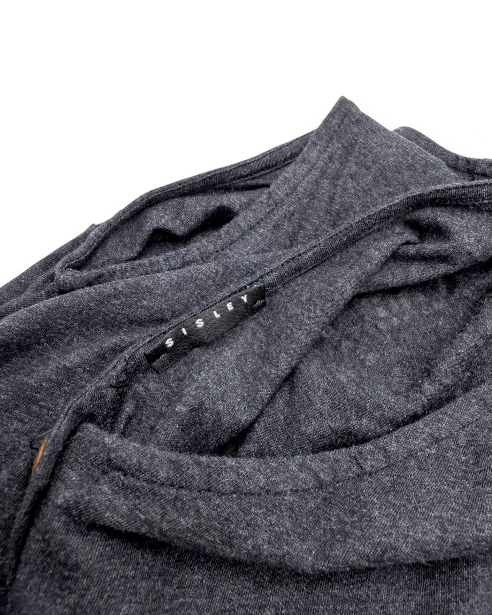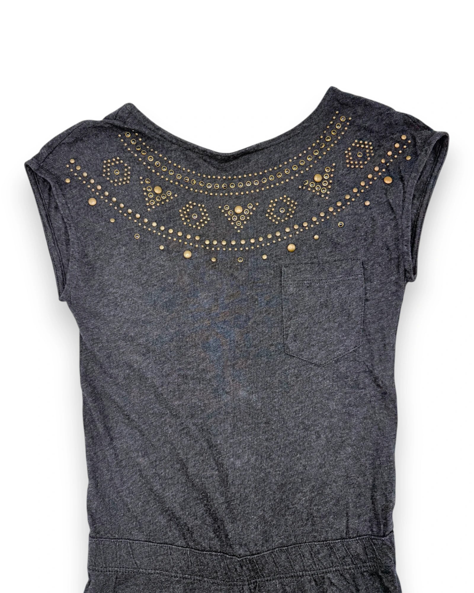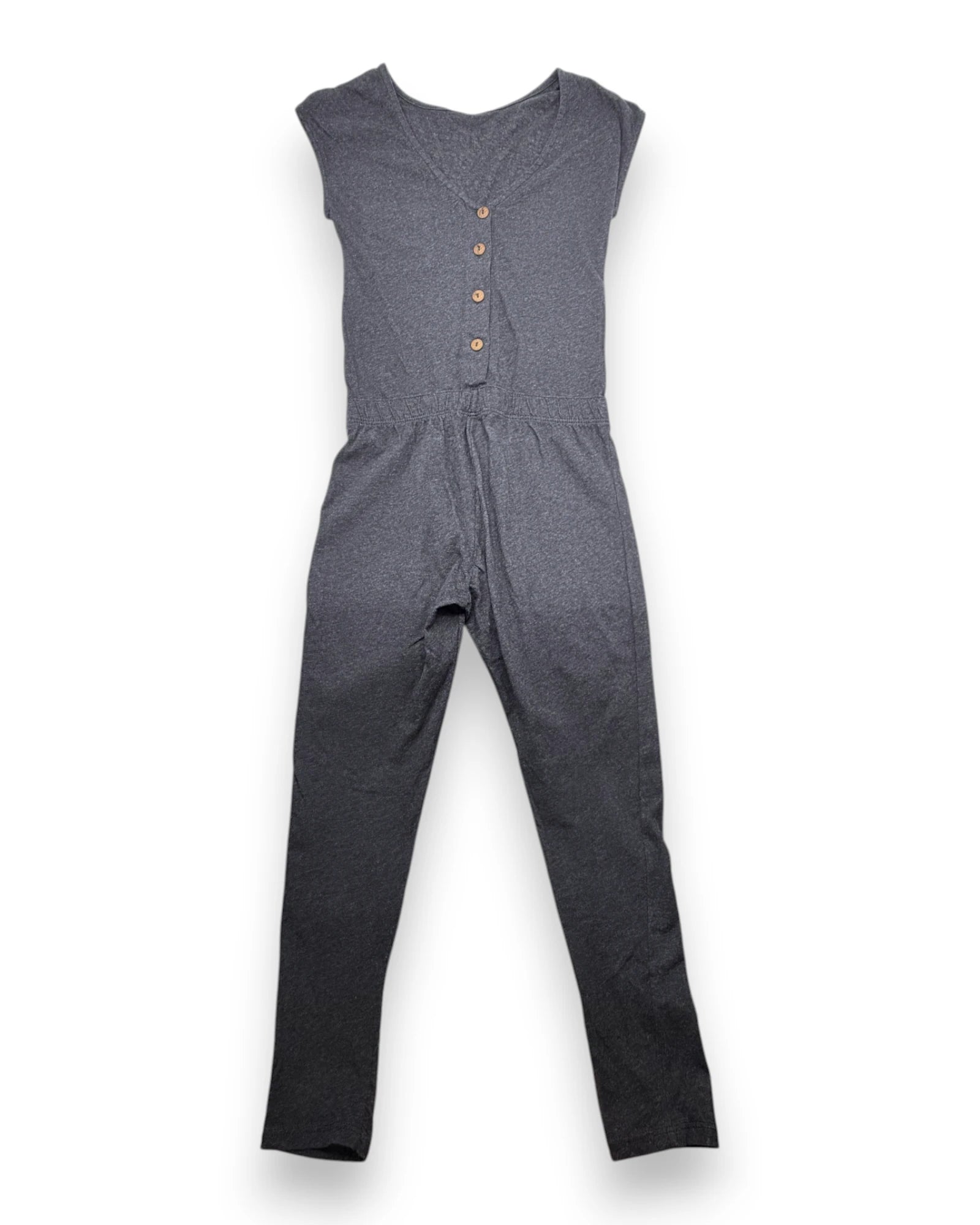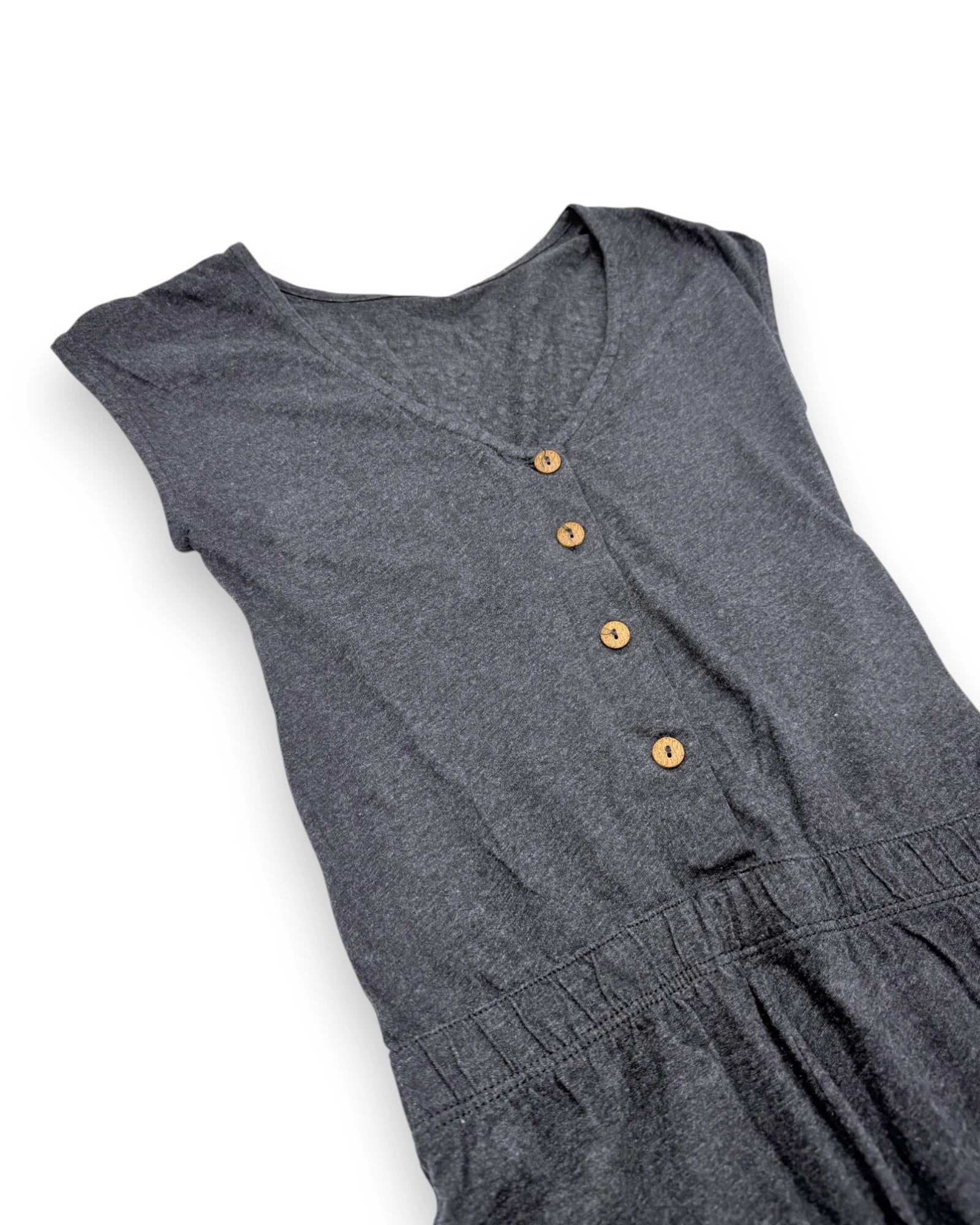 Macacão cinzento de mangas curtas, em algodão suave, da Sisley. Abertura nas costas com botões.